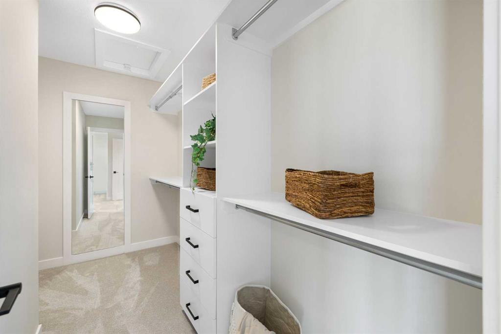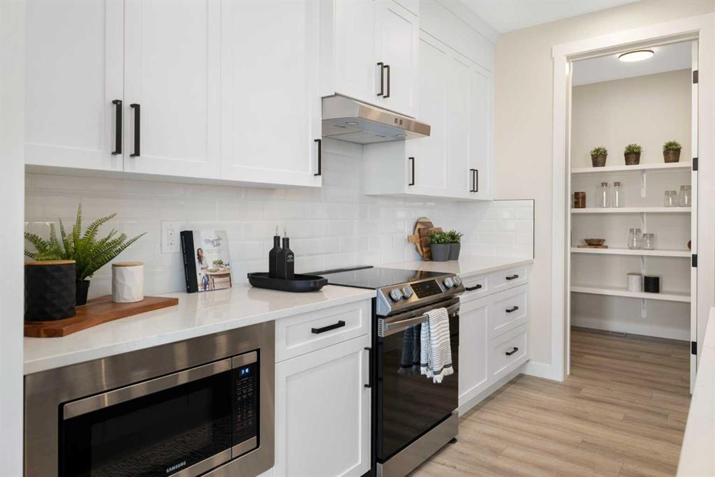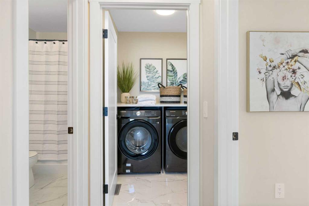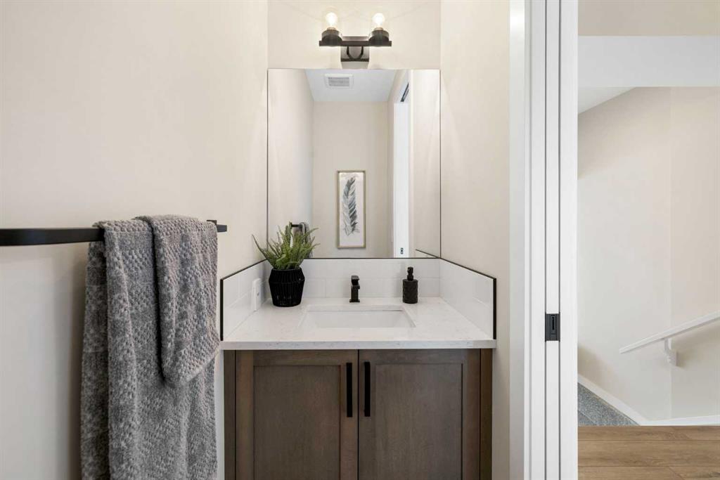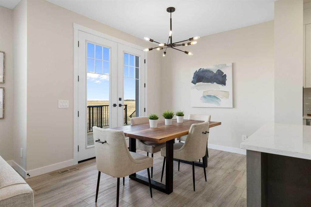 Welcome to 458 Kinniburgh Loop — an elegantly designed 1,840 sq. ft. duplex in the highly sought-after community of Kinniburgh South, Chestermere. Built by luxury builder Golden Homes, this residence blends modern living, functionality, and timeless design — all just minutes from schools, everyday amenities, and Lake Chestermere. The main floor features an inviting open-concept layout with soaring 9' ceilings and 8' doors, creating a spacious and grand feel. A large 8' front door with built-in glass window sets the tone for the luxury inside, while a convenient half bath, side entrance, and staircase access to the basement add everyday practicality. At the heart of the home is a chef-inspired kitchen boasting a striking two-tone cabinet design, quartz countertops, a large island with breakfast bar seating, ceiling-height painted cabinetry, and sleek stainless-steel appliances. Oversized triple-pane windows flood the living and dining areas with natural light, while an electric fireplace with multiple color settings and heat modes completes the living room in style. Upstairs, a grand staircase with white railings and matte black iron spindles leads to the luxurious primary bedroom, complete with a spa-like 5-piece ensuite featuring a freestanding tub, fully tiled walk-in shower, dual vanities, and an enclosed toilet. A custom walk-in closet with built-in shelving and organizers adds the finishing touch. Two additional spacious bedrooms and a full bathroom provide room for the whole family, while the tiled laundry room — complete with a quartz countertop — delivers everyday convenience. The partially developed basement offers a fantastic head start for future living space, with a separate side entrance, finished mechanical room, plumbing rough ins which all provide added flexibility. Premium finishes throughout include an oversized 20'x22' garage, matte black fixtures and hardware, upgraded MDF shelving, and high-efficiency triple-pane windows for year-round energy savings. The enhanced party wall ensures superior soundproofing between units. The exterior is fully landscaped with grading, loam, sod to the side entrance, and a front yard tree — offering instant curb appeal from day one. With its west-facing orientation, enjoy beautiful morning light and warm afternoon sun throughout the day. Pictures are of the same model. Selection specifications are subject to change.