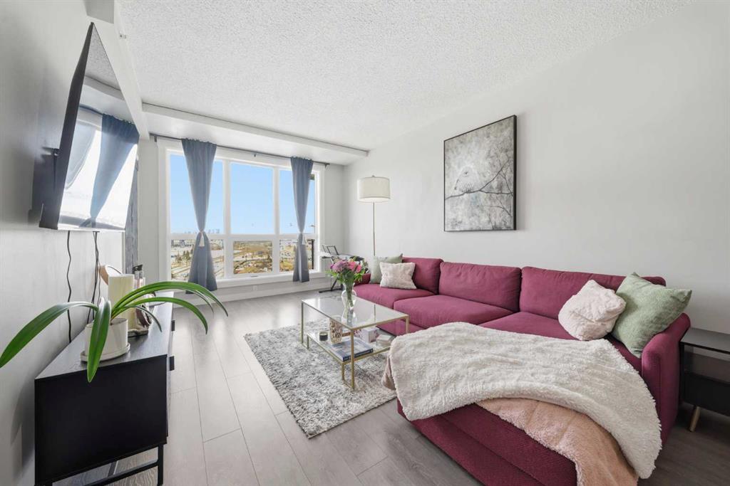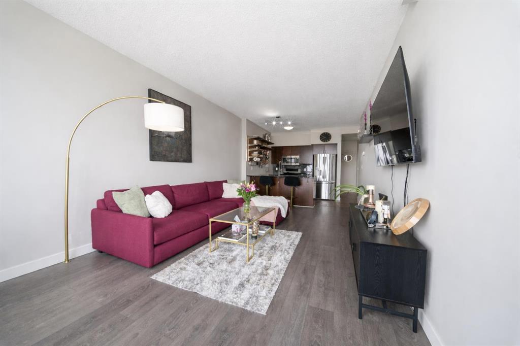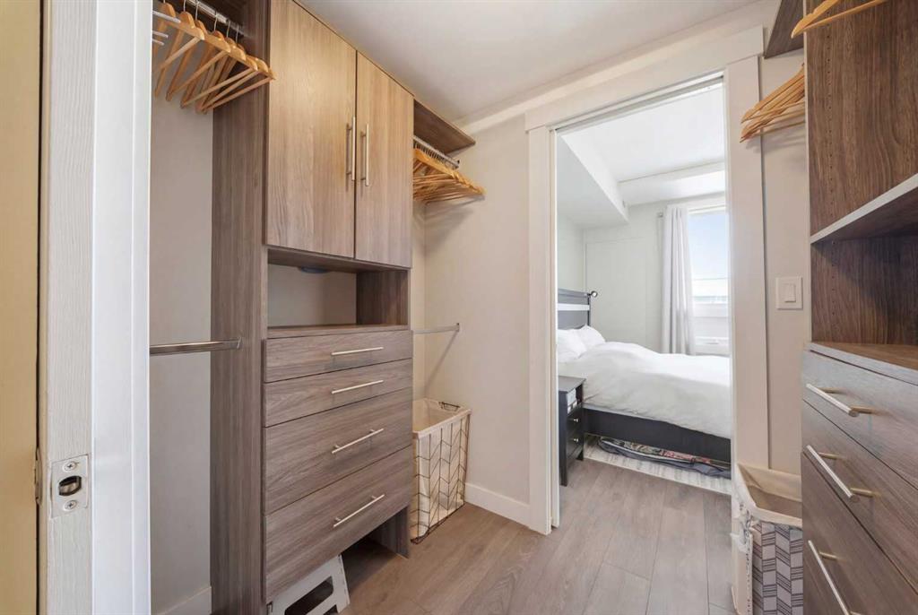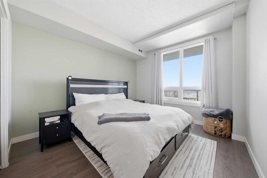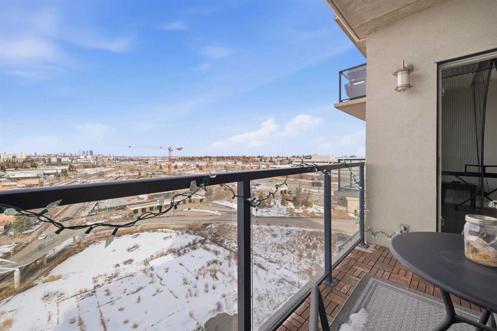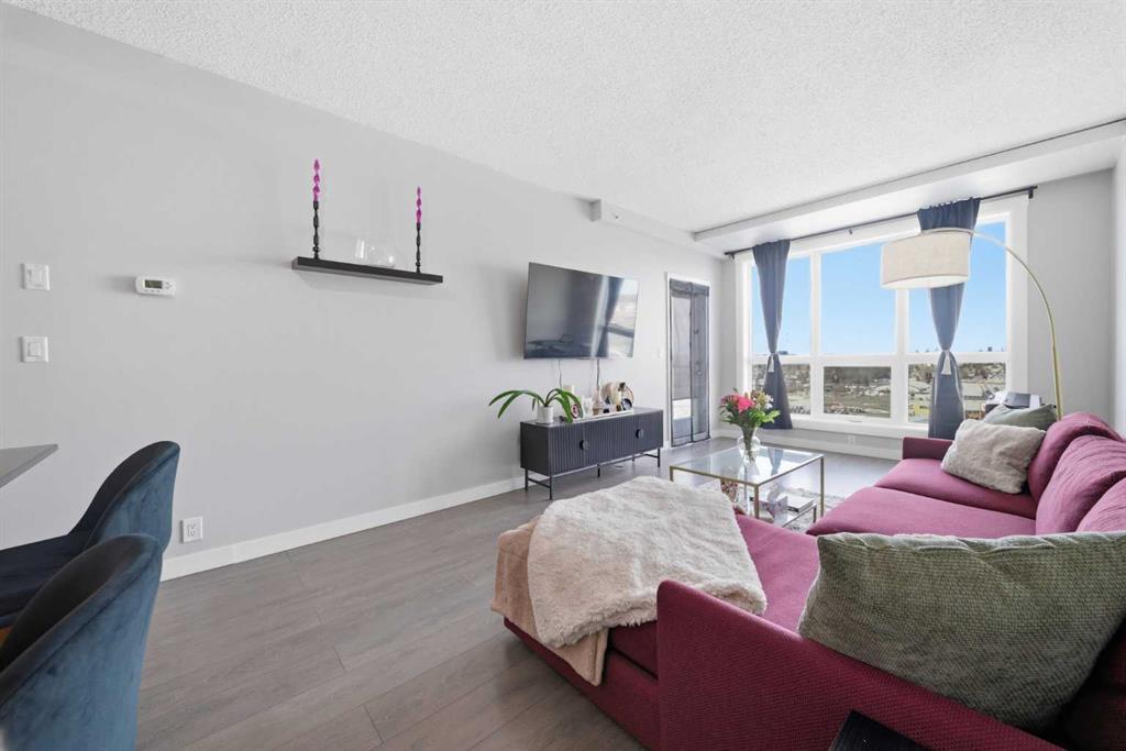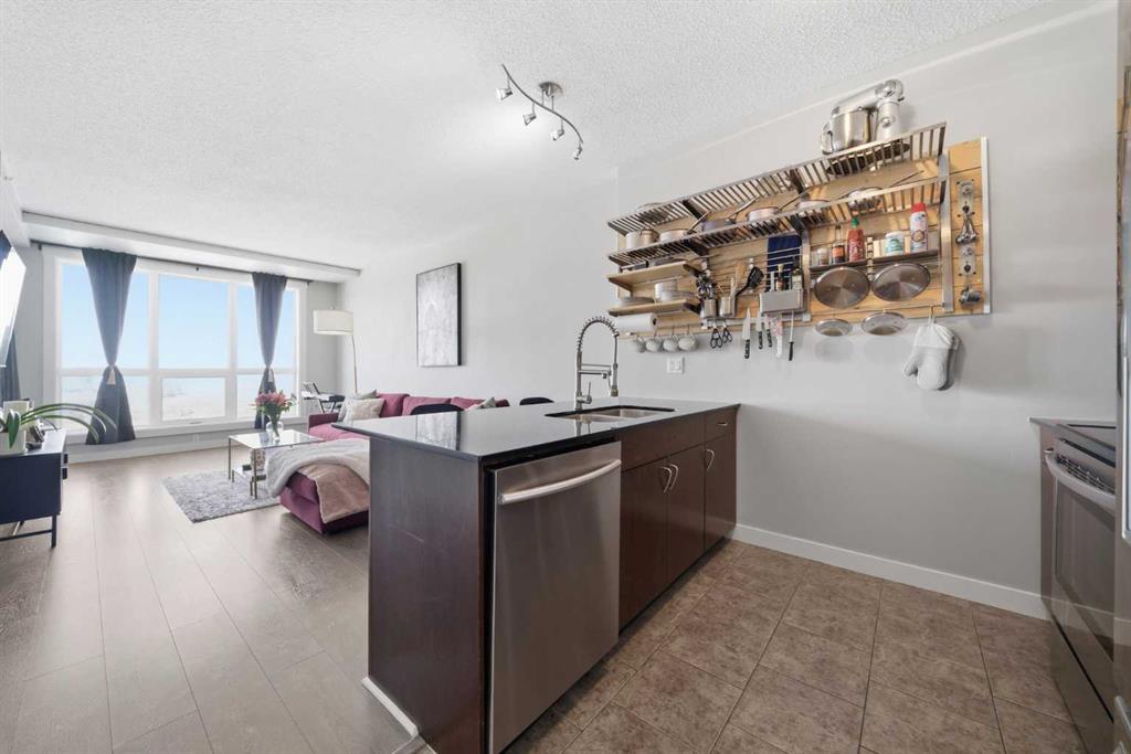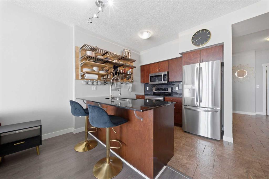 Stunning executive condo in London at Heritage Station! This spacious 13th floor, 1 bedroom + large den unit offers 818 sq ft, making it one of the larger one bedroom floorplans in the building and ideal for a live/work setup. Enjoy beautiful city from every window, along with an open concept layout featuring 9’ ceilings, laminate flooring, modern finishes, and granite countertops throughout. The kitchen offers espresso maple cabinetry, stainless steel appliances, granite countertops, a large island with breakfast bar seating, and stylish open shelving. The spacious primary bedroom features city views and a walkthrough closet with custom organizers, while the unit also includes in suite laundry and storage. Relax on the private balcony with gas line and enjoy the convenience of heated underground parking (unassigned). This well-managed building offers 24 hour security, concierge service, and secure package delivery! Unbeatable location with direct access to shops, restaurants, Save-On-Foods, and the Heritage LRT station, making downtown commuting quick and easy.