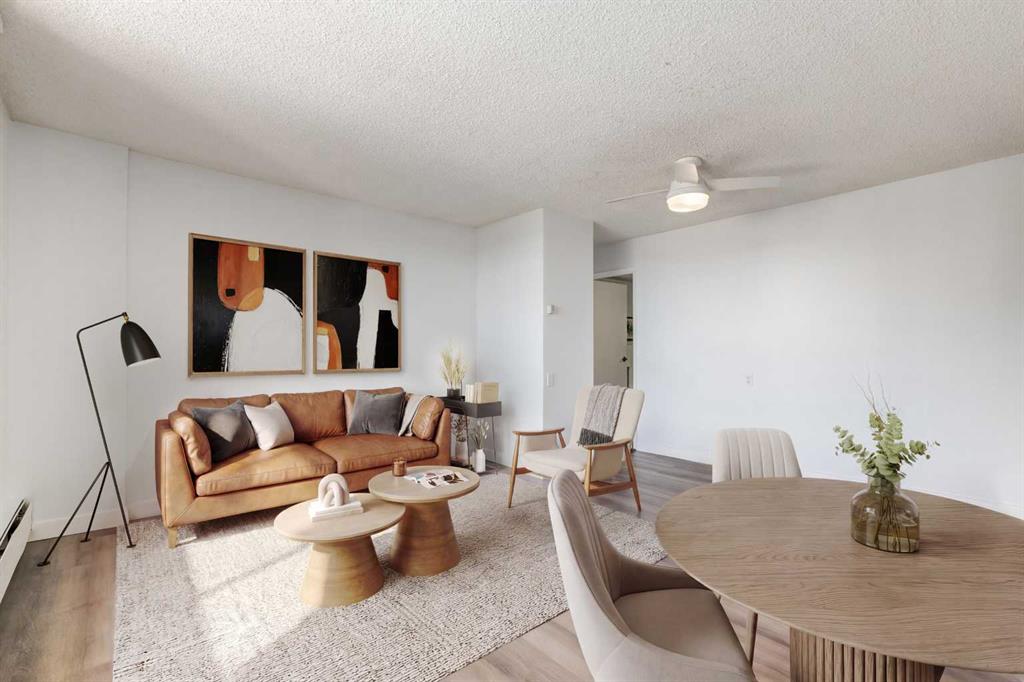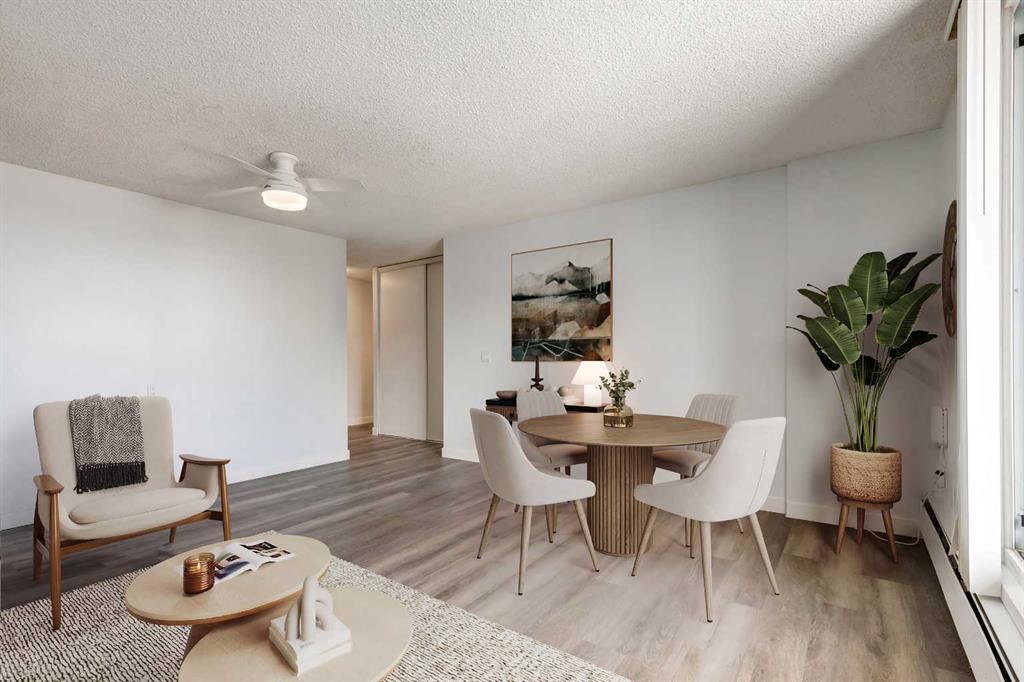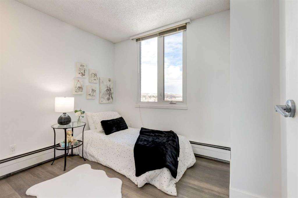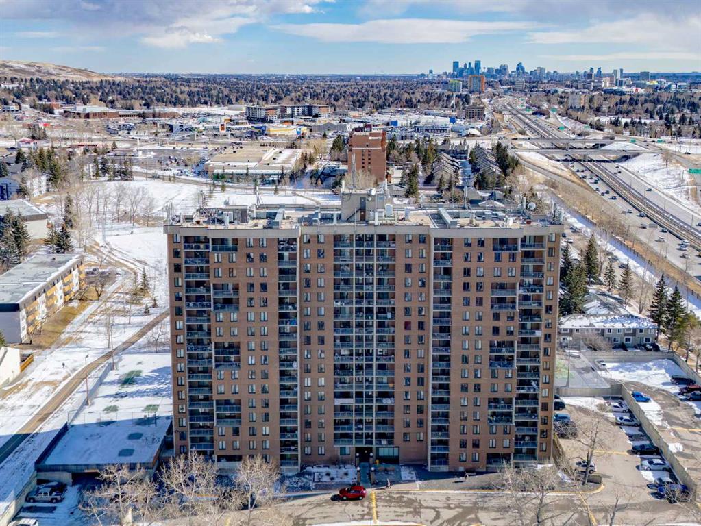 Located in the sought-after and established NW community of Dalhousie, this bright and refreshed 2bed/1bath CORNER unit on the 11th floor of the concrete Fortress building offers comfortable living space, picturesque mountain views, and an abundance of natural light. The unit has been thoughtfully updated over the past few years and it was recently repainted throughout creating a fresh and welcoming atmosphere. The kitchen features sleek, glossy cabinetry and white appliances. The 4 piece bath has also been updated with a clean, streamlined feel. New closet doors throughout the unit enhance the look, all of the carpet has been removed and replaced with durable engineered flooring giving the home a cohesive, contemporary style that's easy to maintain. The bright and comfortable living/dining combo area provides a relaxing place to unwind and offers room to gather around the table. The functional floorplan flows naturally toward the west facing balcony, extending the living space outdoors. Once you step outside onto the balcony you'll get to soak in mountain views and the glowing of the city during evening sunsets. It's the perfect place to enjoy your morning coffee or unwind with a book at the end of the day. The in-suite storage room is the perfect flex space for whatever gear you may have, or use it as a pantry or even a little office space. This unit also includes an assigned parking stall conveniently located close to the side entrance, making everyday access and grocery trips especially easy. Ample visitor parking is also available for guests. The Fortress offers an impressive range of amenities. Residents can stay active year-round with the fitness centre and indoor swimming pool. You can enjoy a friendly match on the outdoor tennis court during the warmer months. The party room with kitchen is ideal for hosting gatherings and celebrations, while bike storage makes it easy to store your bicycle after rides along nearby pathways. Smart card laundry facilities add everyday convenience within the building. The location offers easy access to Dalhousie station and major roadways making commuting simple. It’s also just mins from the University of Calgary, Foothills Medical Centre, and the Alberta Children's Hospital, along with events and athletics at McMahon Stadium. Nearby shopping destinations such as University District, CF Market Mall and Crowfoot Crossing offer a wide variety of stores, restaurants and entertainment options. Outdoor enthusiasts will appreciate the proximity to some of Calgary’s most beloved green spaces, including Nose Hill Park, Bowness Park, and Edworthy Park, where you can enjoy scenic river pathways, cycling routes, and beautiful natural surroundings. Come view this unit for yourself. RMS 697 just shy of 700.