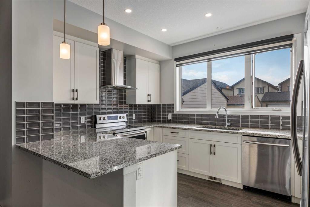 Excellent opportunity for a first-time buyer, an expanding family or an investor. Located in Mahogany on Calgary’s SE edge, with quick access to downtown or Alberta’s natural treasures this 2.5 storey, 1,588 sq. ft., 3 bedrooms and 2.5 bathroom home allows for plenty of space to grow. The east-facing front yard has timesaving, low maintenance landscaping. On entering the foyer note the wide plank laminate flooring throughout and the high ceilings. On the right, the living room has lots of natural light due to the large front window. An adjacent den could be utilized as a home office. The dining room and kitchen are open concept. The dining area is substantial and would easily accommodate large gatherings. The kitchen is strikingly decorated in white and grays. White, modern cabinetry, stainless appliances and hood fan, light gray, quartz countertops and darker gray tiled backsplash plus an oversized window over the undermount, double sink make for a well-lit, inviting work area. A mudroom with an abundance of shelving leads to the rear deck and a 2-pc. bath complete this level. The carpeted second level boasts a generous primary bedroom with walk-in closet and an impressive 4-pc. tiled ensuite with double vanity. Two additional bedrooms share a 4-pc. bath. Laundry facilities with handy cabinets and shelving are conveniently located on this level. The lower level is unfinished and provides further options for development and expansion. The backyard is fully fenced with an expansive wooden deck for summer enjoyment. Three vehicles have room on the parking pad at the rear of the property which is accessed via the back lane. As noted, this home is close to Stoney and Deerfoot Trails, 52nd Street SE which leads to nearby shopping and restaurants, schools, playgrounds, Mahogany Lake and Wetlands and the South Health Campus. Take the leap and seize this incredible opportunity today!