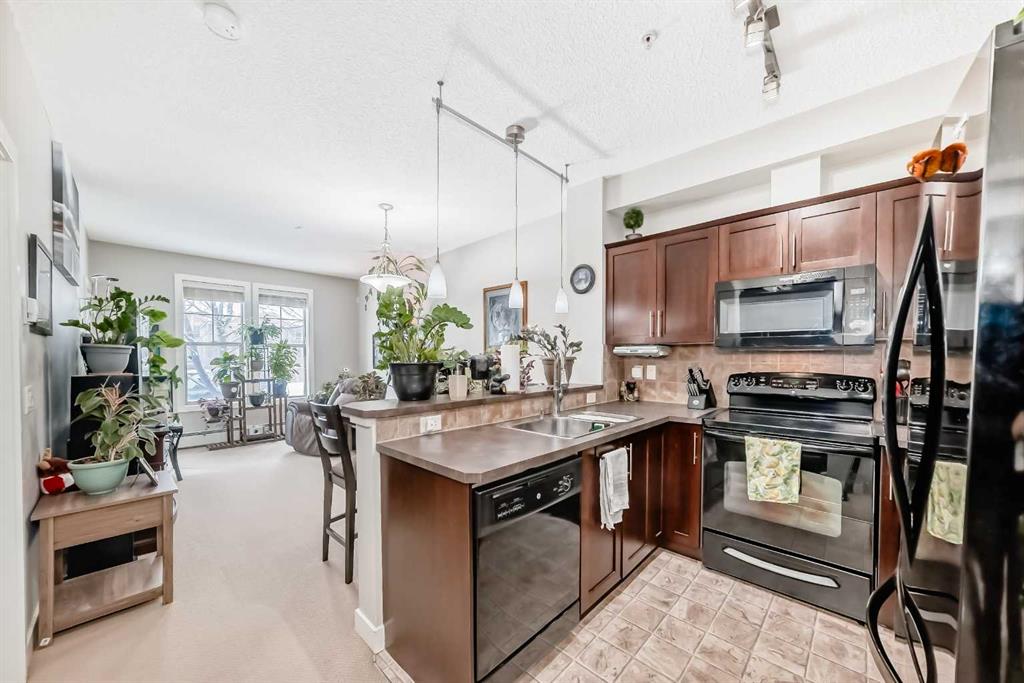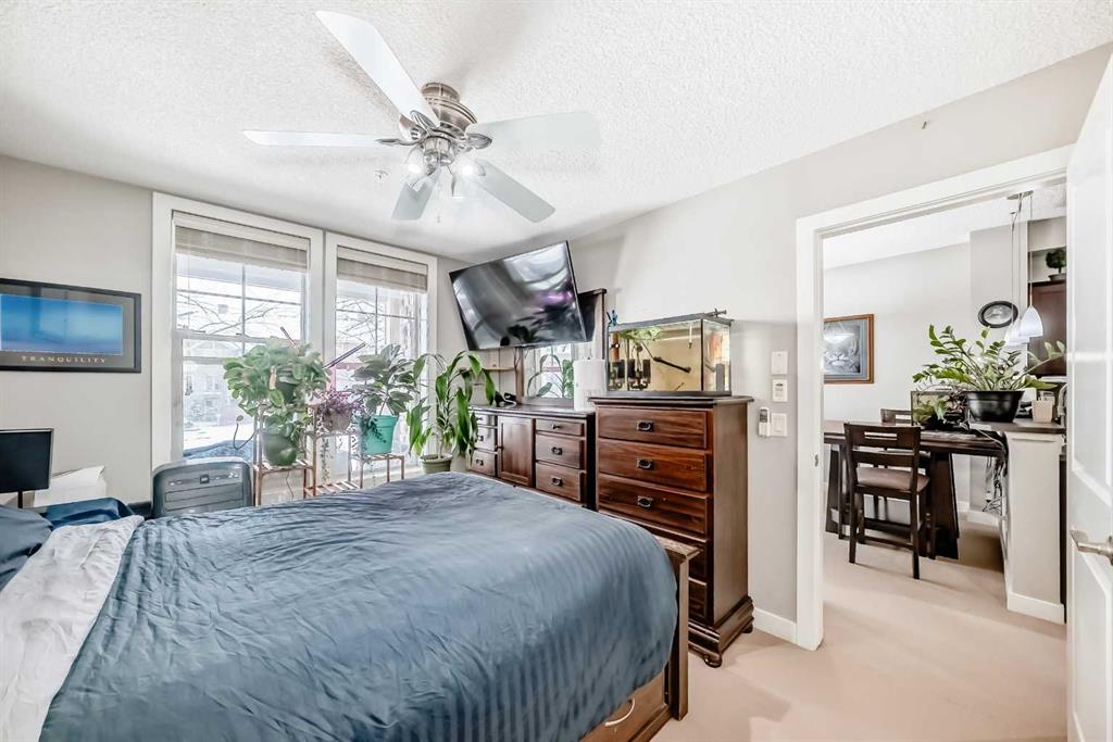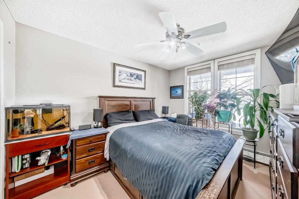 ** Open House: Saturday, April 4th 12 to 2pm ** Welcome to this inviting southwest facing ground floor apartment in the sought-after community of Sunset Ridge. Offering a functional and comfortable layout, this home features updated appliances, a spacious primary bedroom with a walk-in closet, an office area, and the convenience of an in-suite laundry room. Step outside to your private southwest-facing patio, the perfect place to relax and enjoy beautiful mountain views, complete with a BBQ gas line for easy outdoor grilling and entertaining. There is a titled parking stall and a dedicated storage unit in the underground heated parking garage. Residents have access to excellent building amenities including a fitness centre, secure bike storage, and a guest suite available to rent for visiting friends and family. Ideally located just steps from a convenient commercial plaza featuring a gas station, convenience store, restaurants, bakery, pharmacy, liquor store, and hair salon, making everyday errands effortless. Surrounded by pathways, parks, and stunning Rocky Mountain views, this home offers comfortable, low-maintenance living.