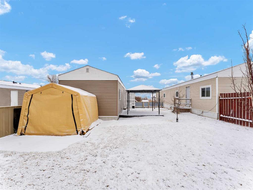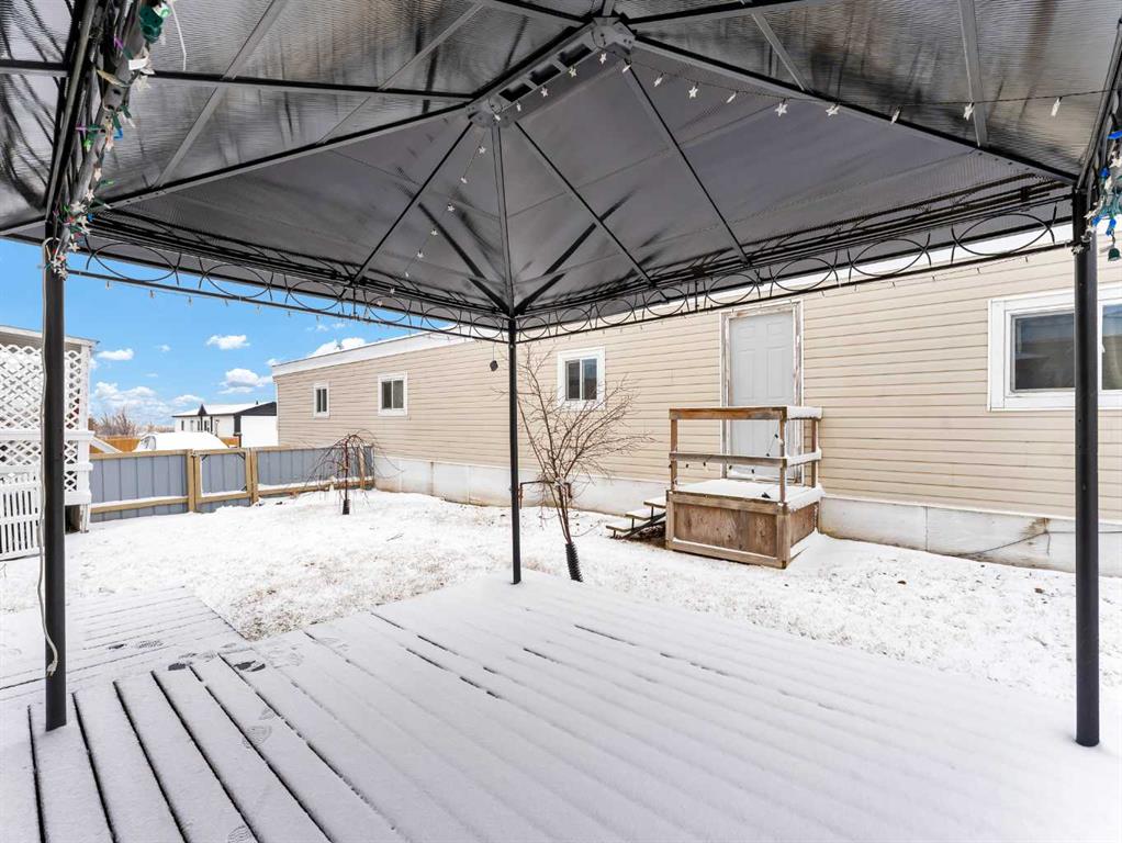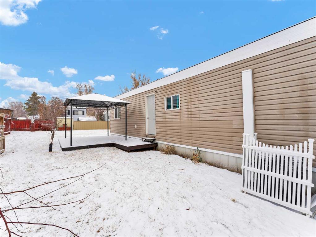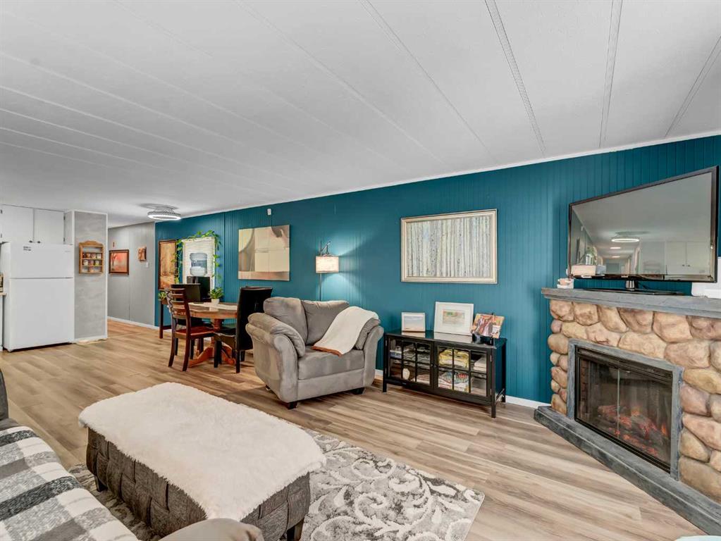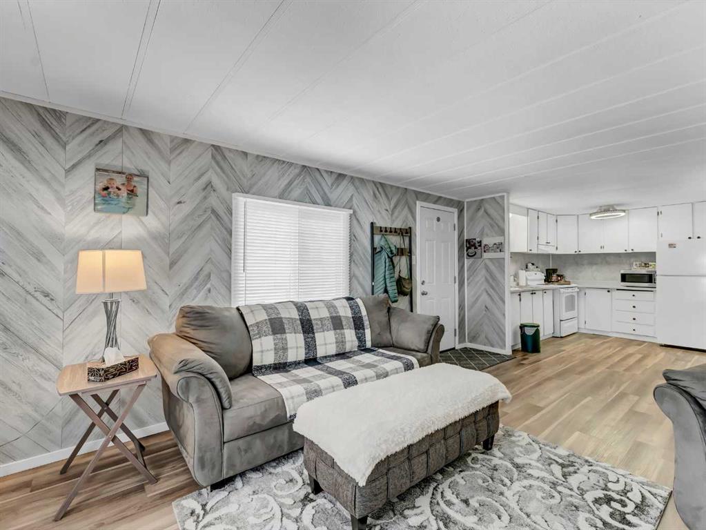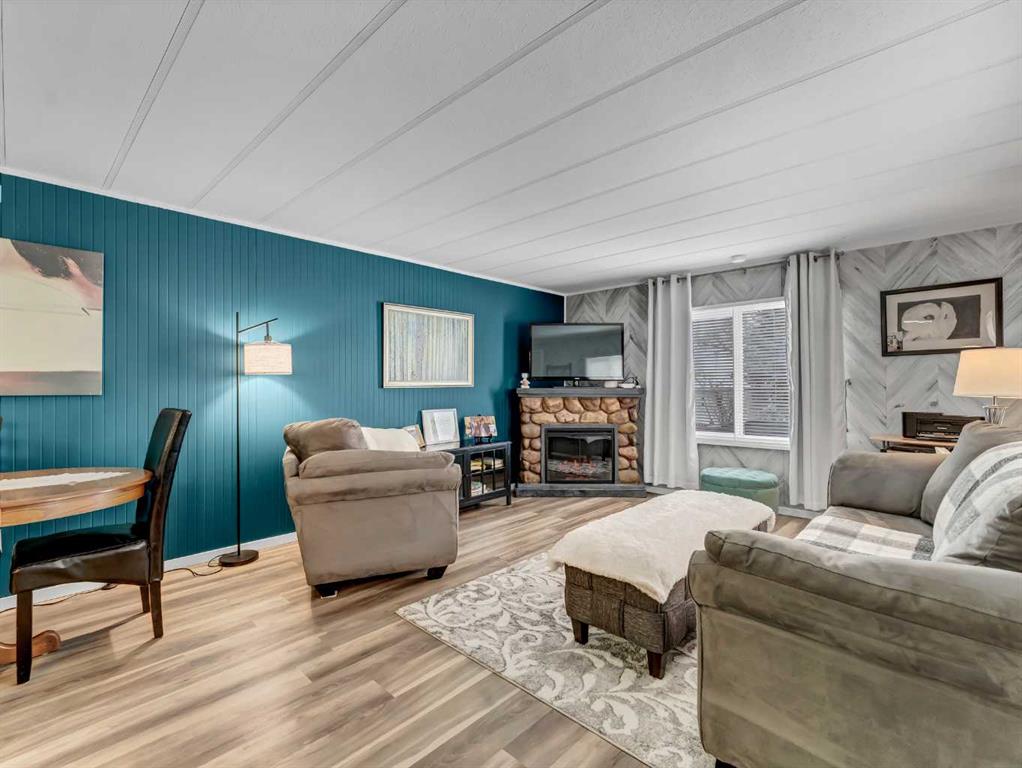 Step into this stylish and inviting 2-bedroom home, where a bright atmosphere greets you. The open-concept layout connects the kitchen, dining, and living areas, making it easy to enjoy time together. The bathroom has been thoughtfully updated, and durable flooring throughout offers low-maintenance comfort. Cozy up to the corner fireplace with a good book or a hot beverage on those chilly days or spend summer evenings beneath the spacious pergola after puttering in the fenced, roomy yard, which features plum and crab apple trees. A rechargeable lawnmower is also included with the purchase – no long chords to trip over! Newer vinyl windows have been installed as well as new blinds for most of the windows. For low maintenance and stress free living, this is the one for you! This home is located in a well maintained park that has a playground for the kids and is close to restaurants, shopping, schools, walking trails, public transit and much more! It's almost springtime planting season, so now is the perfect time to make the move! Utilities are included in the pad fee except for electricity.