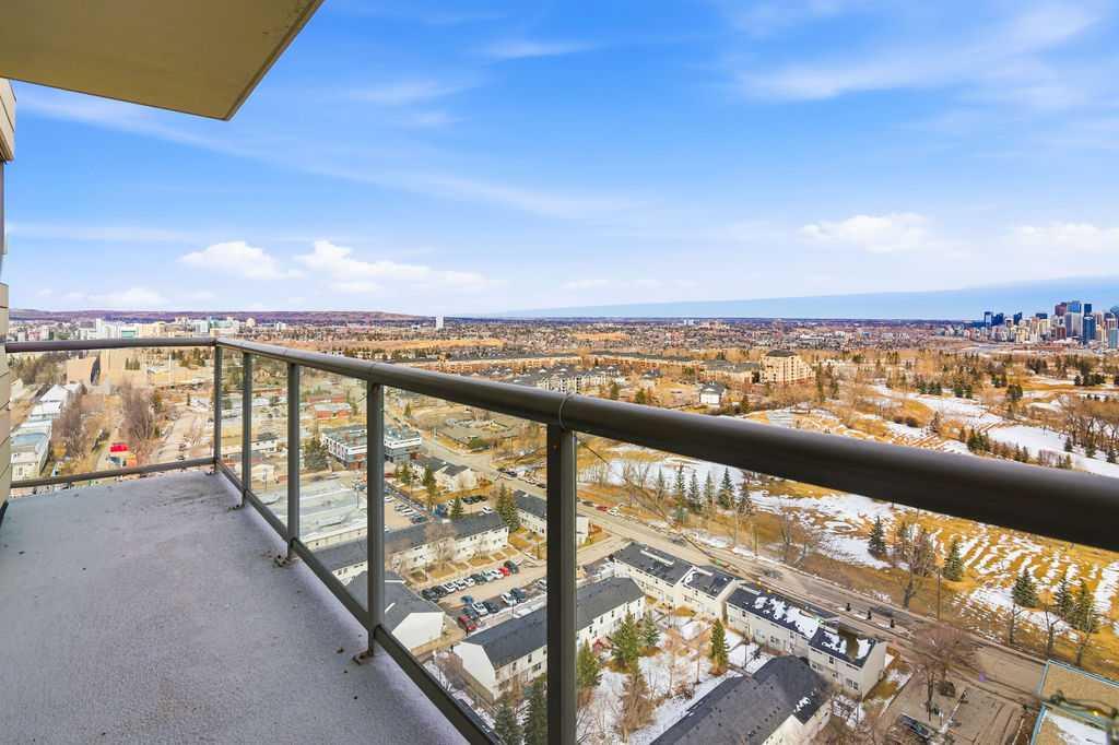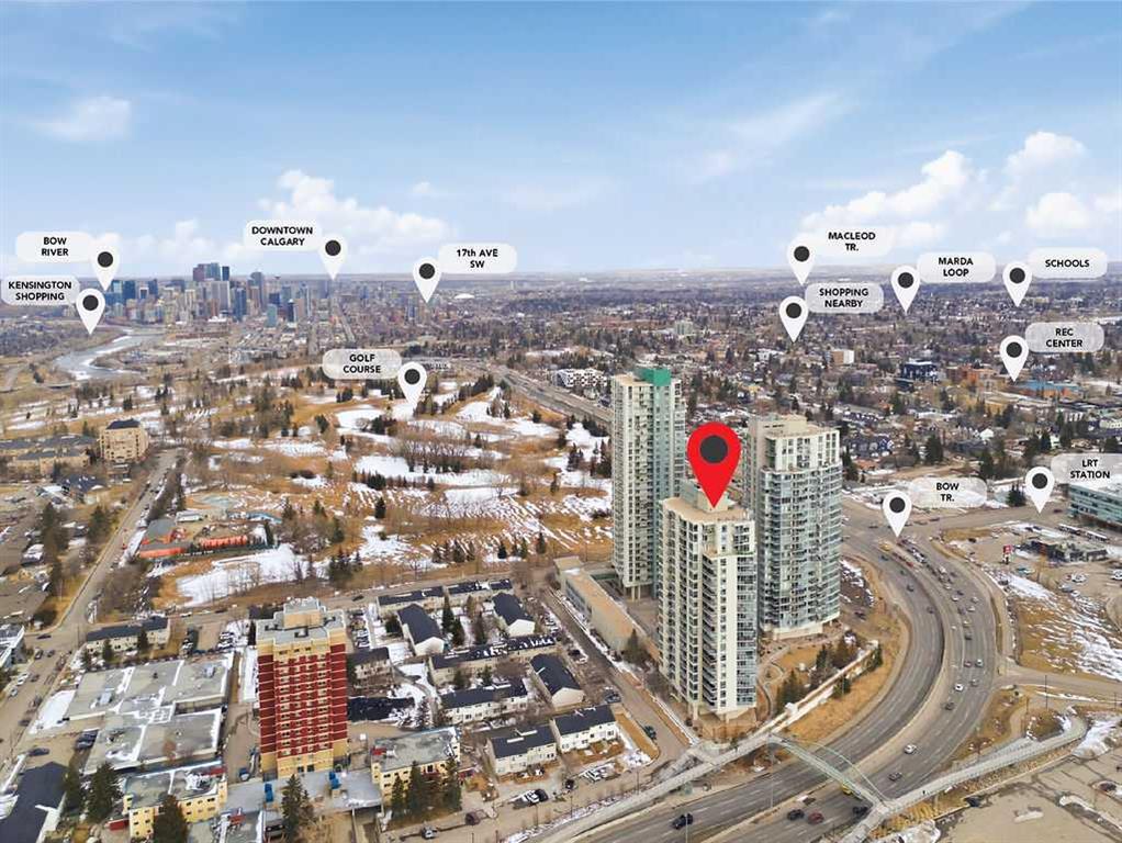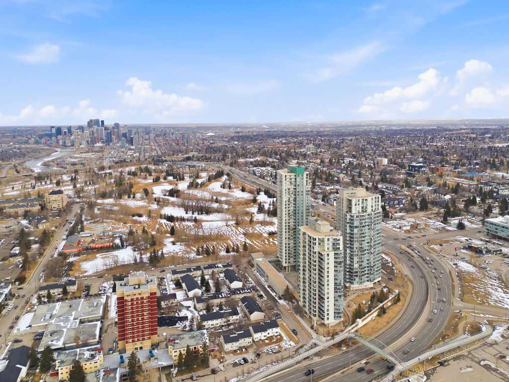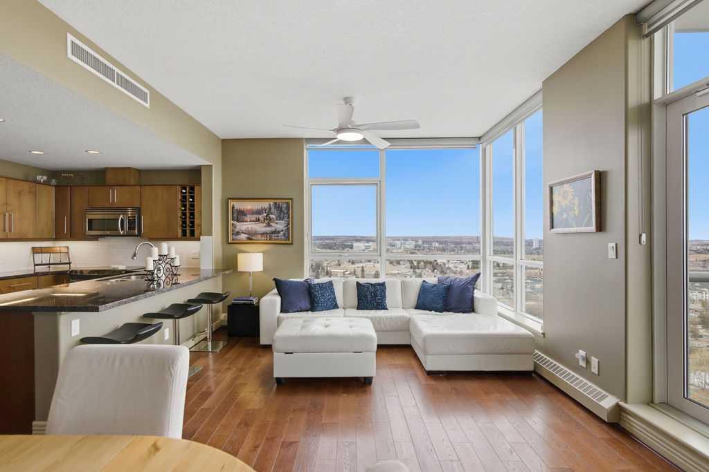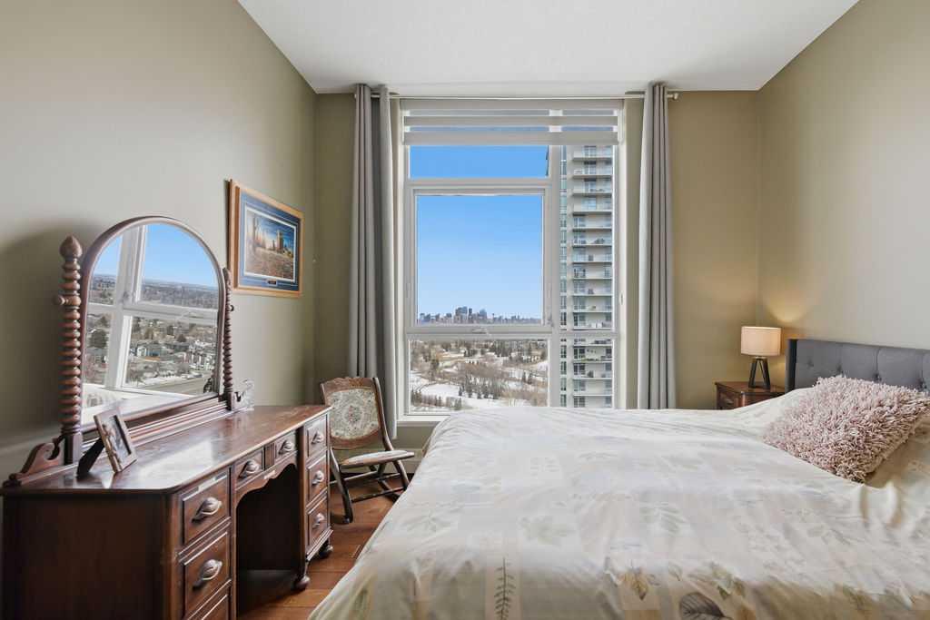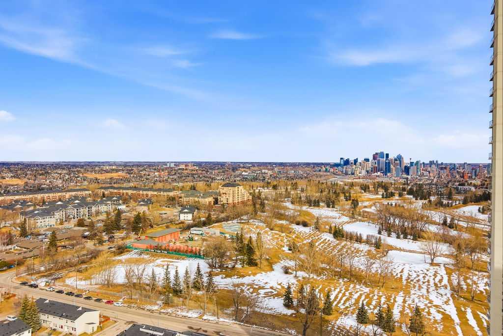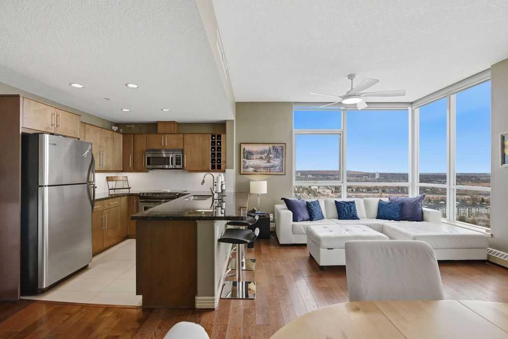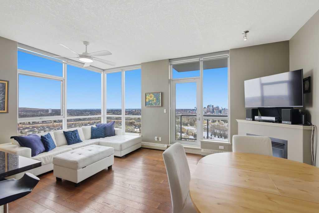 A rare opportunity to own a corner penthouse with sweeping downtown views and beautiful morning sun. Perfectly positioned with east and north exposure, this bright and spacious two-bedroom, two-bathroom residence captures stunning sunrise light and breathtaking views of Downtown Calgary and the Shaganappi Golf Course through expansive wrap-around windows. The thoughtfully designed open-concept layout features new hardwood and tile flooring, creating a clean and modern feel throughout. The kitchen offers granite countertops and excellent functionality, perfect for everyday living or entertaining. Convenient in-suite laundry is also included. A standout feature is the two titled oversized underground parking stalls, ideally located in the garage and large enough to comfortably accommodate larger vehicles or trucks. Residents enjoy access to an exceptional amenities wing, connected by an indoor walkway, featuring an oversized pool, hot tub, recreation area, and a fully updated fitness centre with sweeping golf course views. This well-managed and secure building offers 24-hour on-site security, underground parking, and underground guest parking for added peace of mind. Located just minutes from the C-Train, shopping, and everyday amenities, this home offers incredible privacy, breathtaking views, and outstanding value for penthouse living in a sought-after building. Pets permitted with board approval (one dog or one cat). This is in the Brava Tower, and condo fees include all utilities except electricity and Internet. call to book a private showing.
