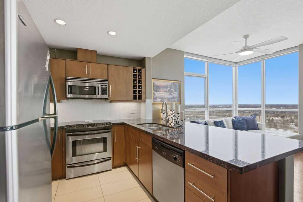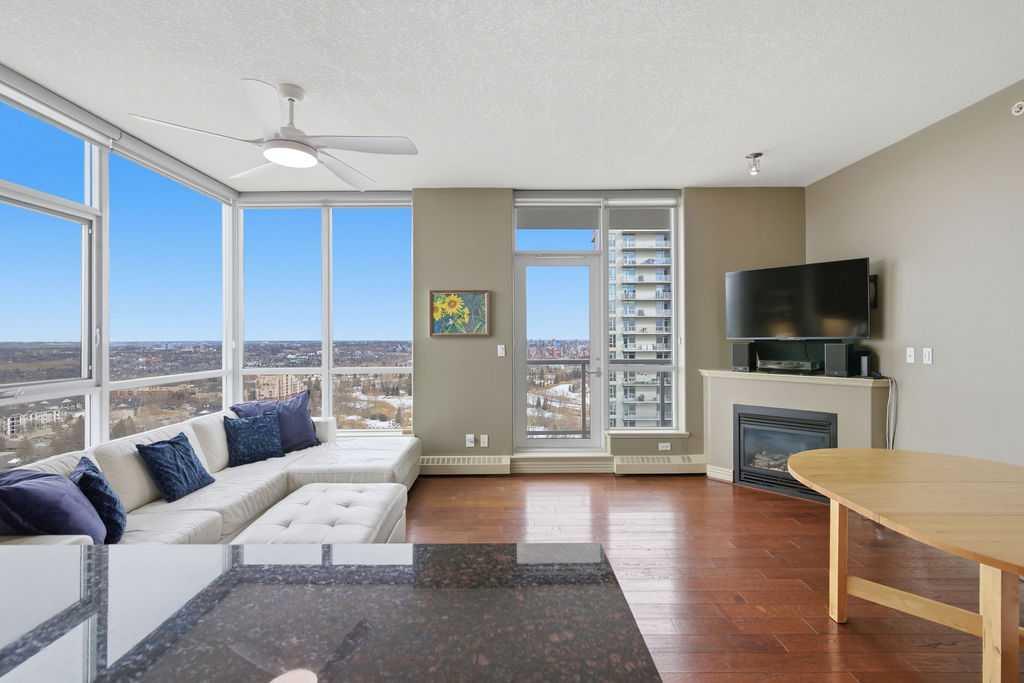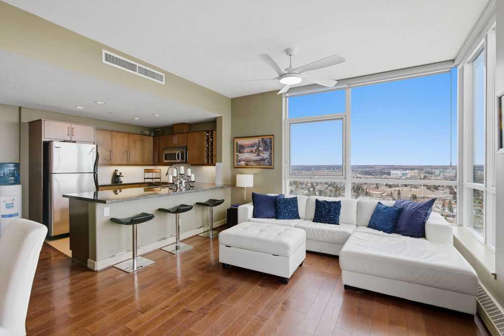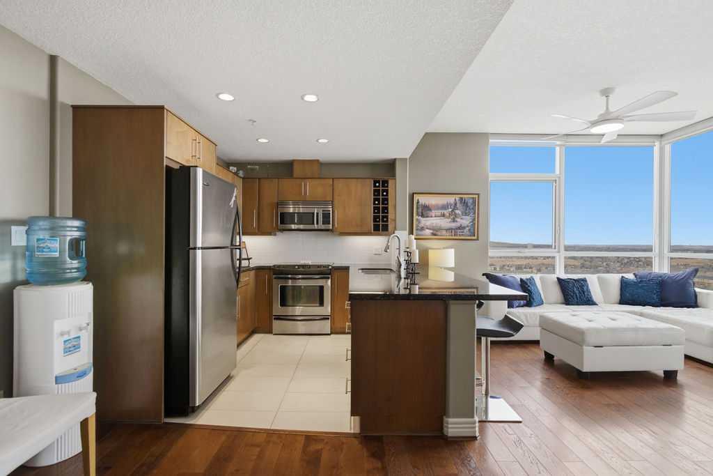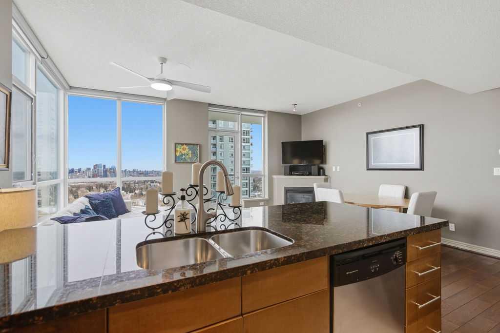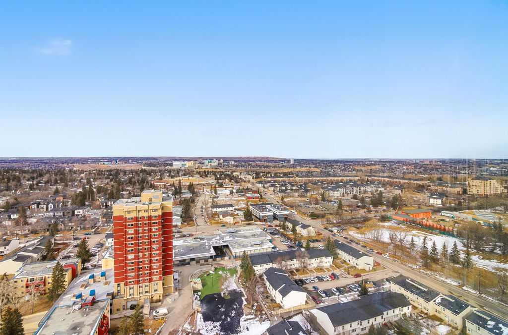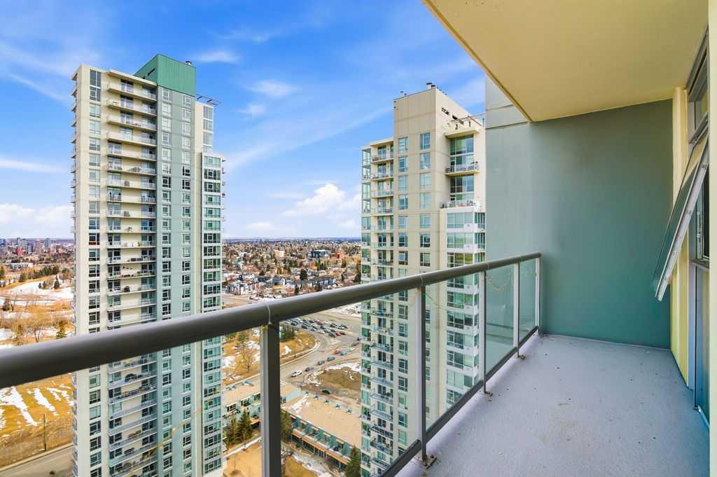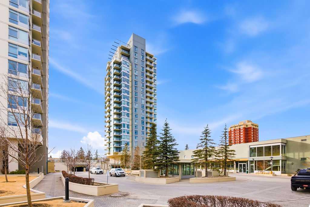 A rare opportunity to own a corner penthouse with sweeping downtown views and beautiful morning sun. Perfectly positioned with east and north exposure, this bright and spacious two-bedroom, two-bathroom residence captures stunning sunrise light and breathtaking views of Downtown Calgary and the Shaganappi Golf Course through expansive wrap-around windows. The thoughtfully designed open-concept layout features new hardwood and tile flooring, creating a clean and modern feel throughout. The kitchen offers granite countertops and excellent functionality, perfect for everyday living or entertaining. Convenient in-suite laundry is also included. A standout feature is the two titled oversized underground parking stalls, ideally located in the garage and large enough to comfortably accommodate larger vehicles or trucks. Residents enjoy access to an exceptional amenities wing, connected by an indoor walkway, featuring an oversized pool, hot tub, recreation area, and a fully updated fitness centre with sweeping golf course views. This well-managed and secure building offers 24-hour on-site security, underground parking, and underground guest parking for added peace of mind. Located just minutes from the C-Train, shopping, and everyday amenities, this home offers incredible privacy, breathtaking views, and outstanding value for penthouse living in a sought-after building. Pets permitted with board approval (one dog or one cat). This is in the Brava Tower, and condo fees include all utilities except electricity and Internet. call to book a private showing.