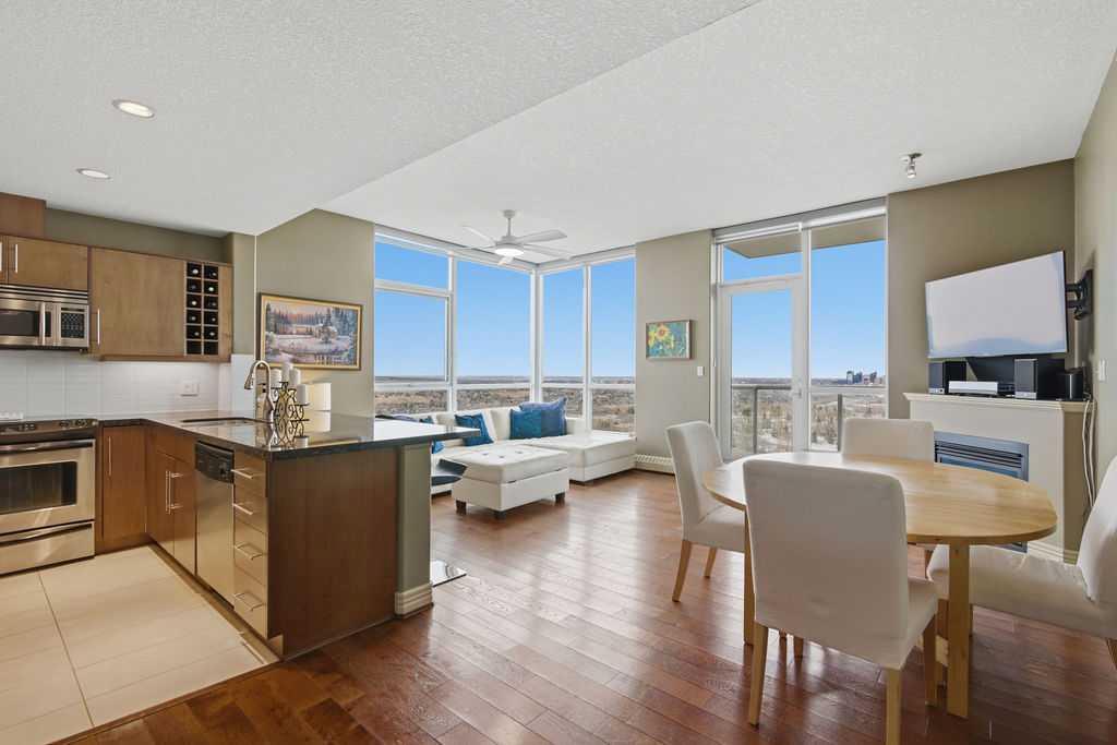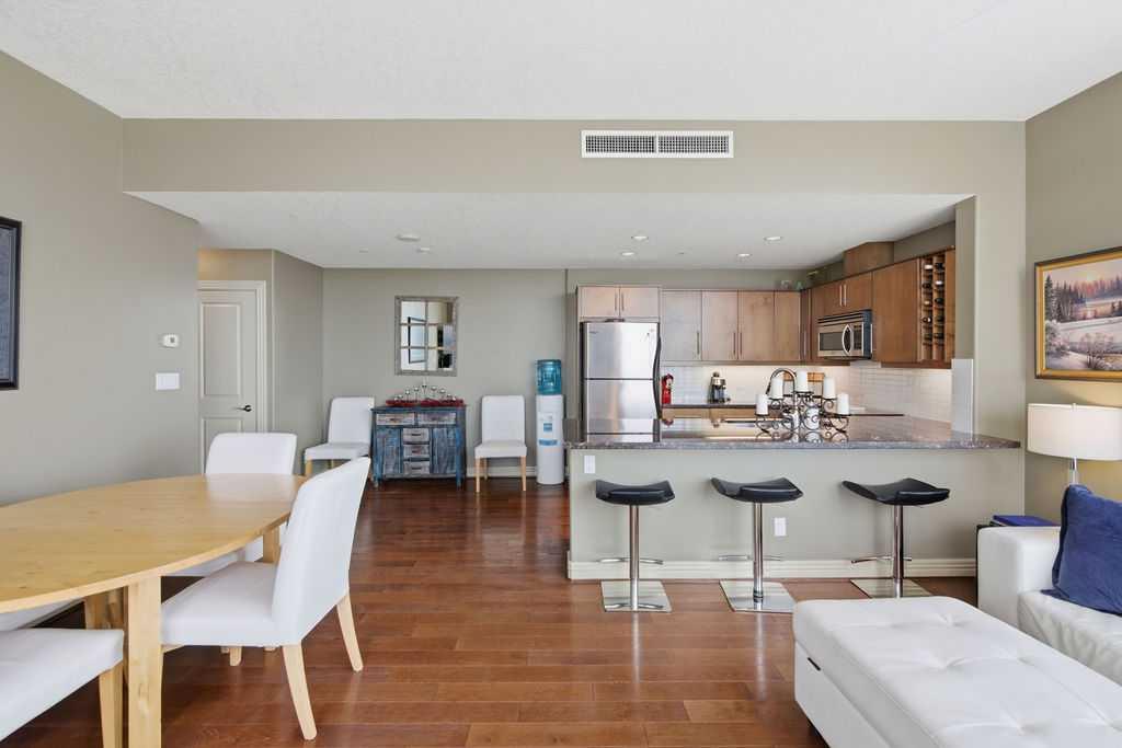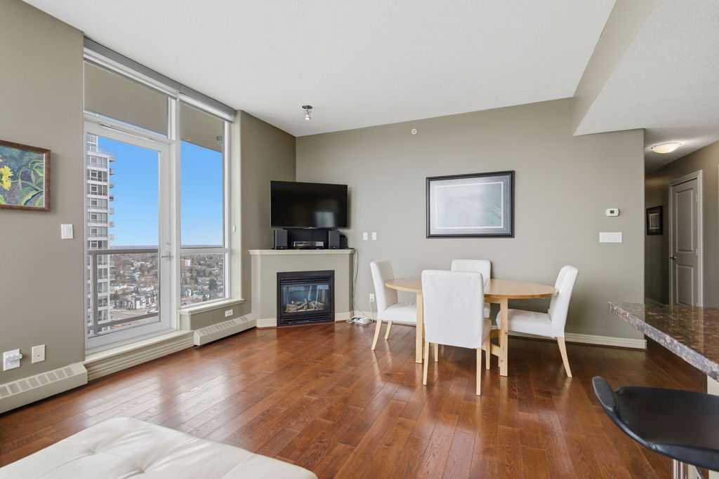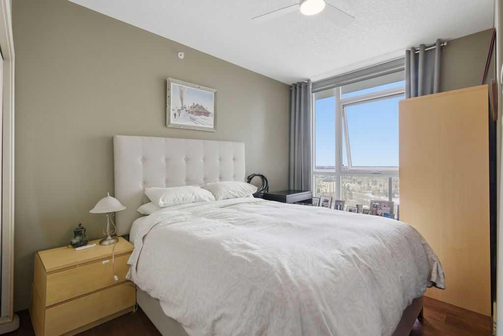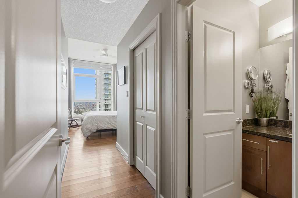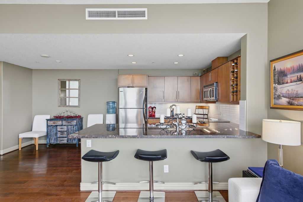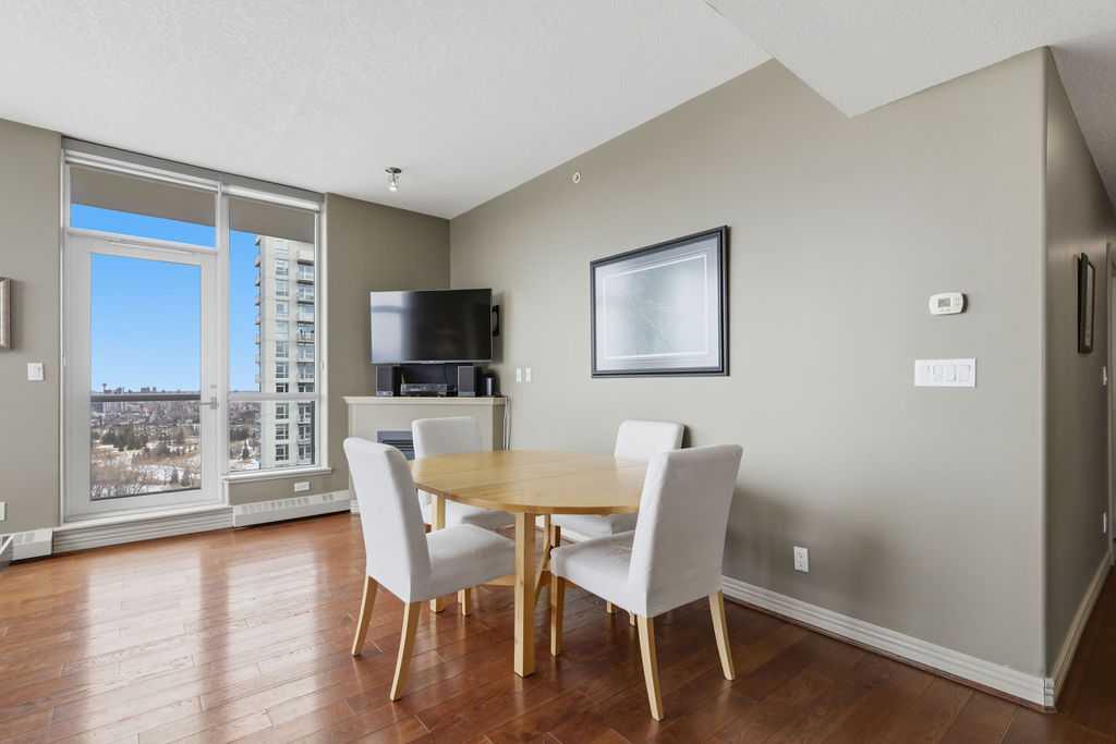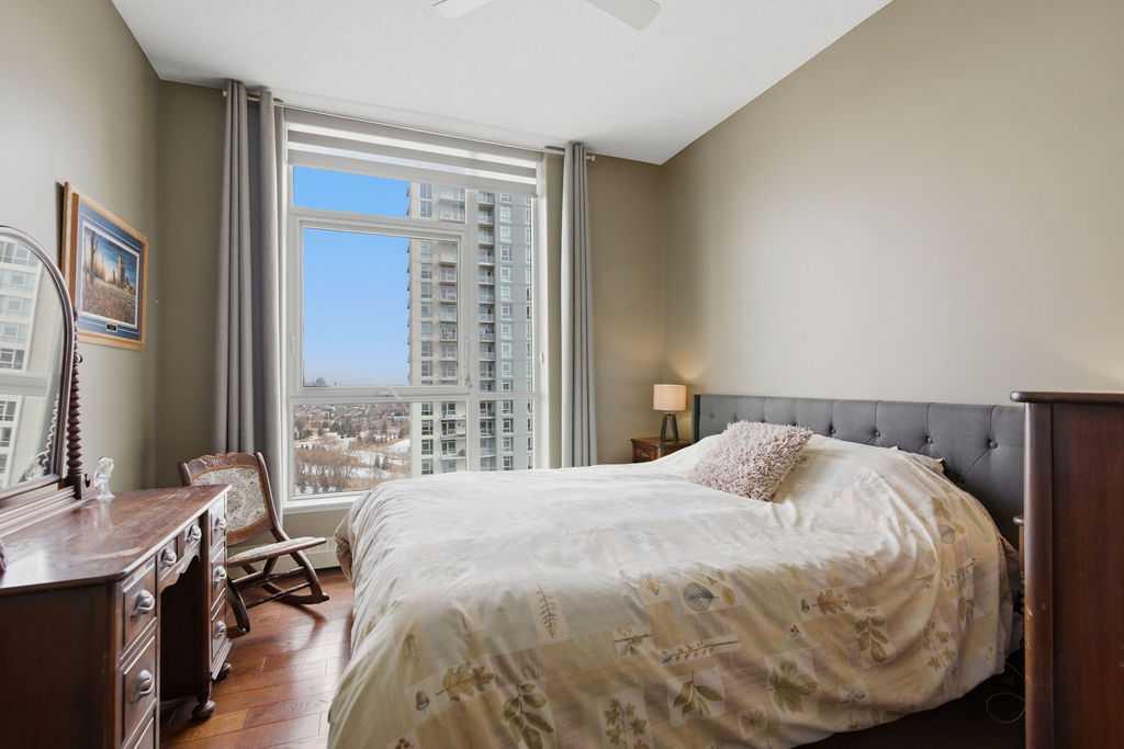 A rare opportunity to own a corner penthouse with sweeping downtown views and beautiful morning sun. Perfectly positioned with east and north exposure, this bright and spacious two-bedroom, two-bathroom residence captures stunning sunrise light and breathtaking views of Downtown Calgary and the Shaganappi Golf Course through expansive wrap-around windows. The thoughtfully designed open-concept layout features new hardwood and tile flooring, creating a clean and modern feel throughout. The kitchen offers granite countertops and excellent functionality, perfect for everyday living or entertaining. Convenient in-suite laundry is also included. A standout feature is the two titled oversized underground parking stalls, ideally located in the garage and large enough to comfortably accommodate larger vehicles or trucks. Residents enjoy access to an exceptional amenities wing, connected by an indoor walkway, featuring an oversized pool, hot tub, recreation area, and a fully updated fitness centre with sweeping golf course views. This well-managed and secure building offers 24-hour on-site security, underground parking, and underground guest parking for added peace of mind. Located just minutes from the C-Train, shopping, and everyday amenities, this home offers incredible privacy, breathtaking views, and outstanding value for penthouse living in a sought-after building. Pets permitted with board approval (one dog or one cat). This is in the Brava Tower, and condo fees include all utilities except electricity and Internet. call to book a private showing.