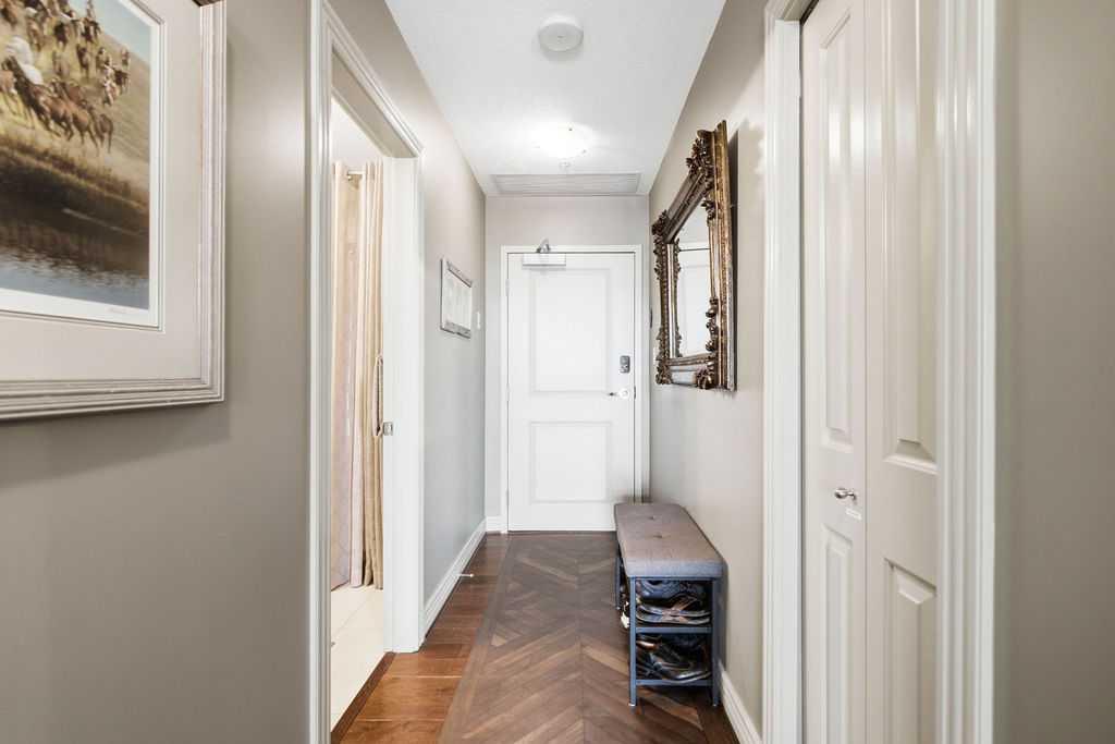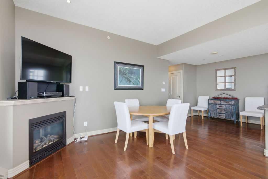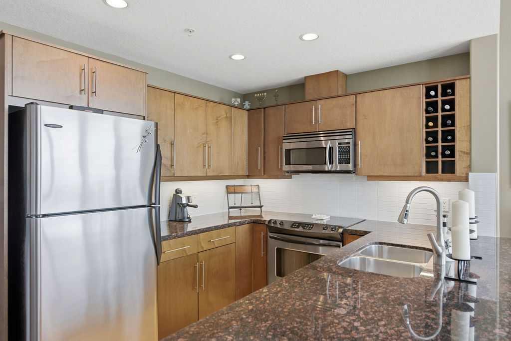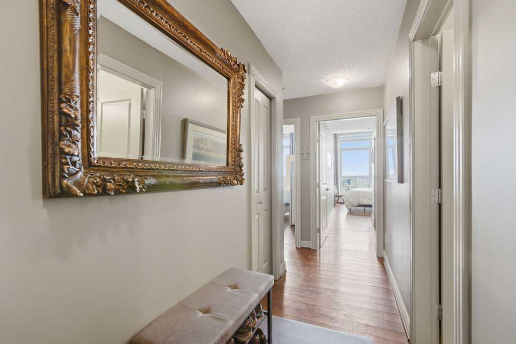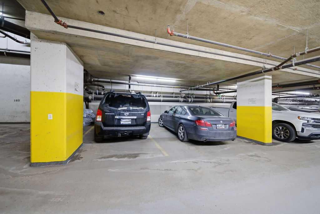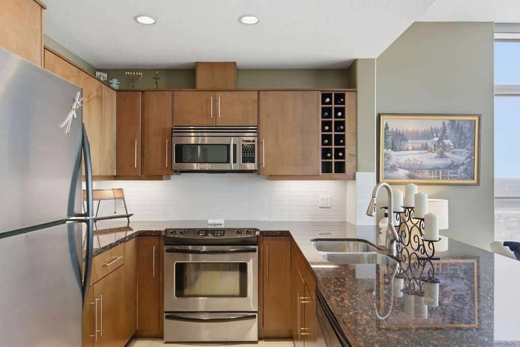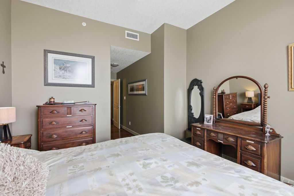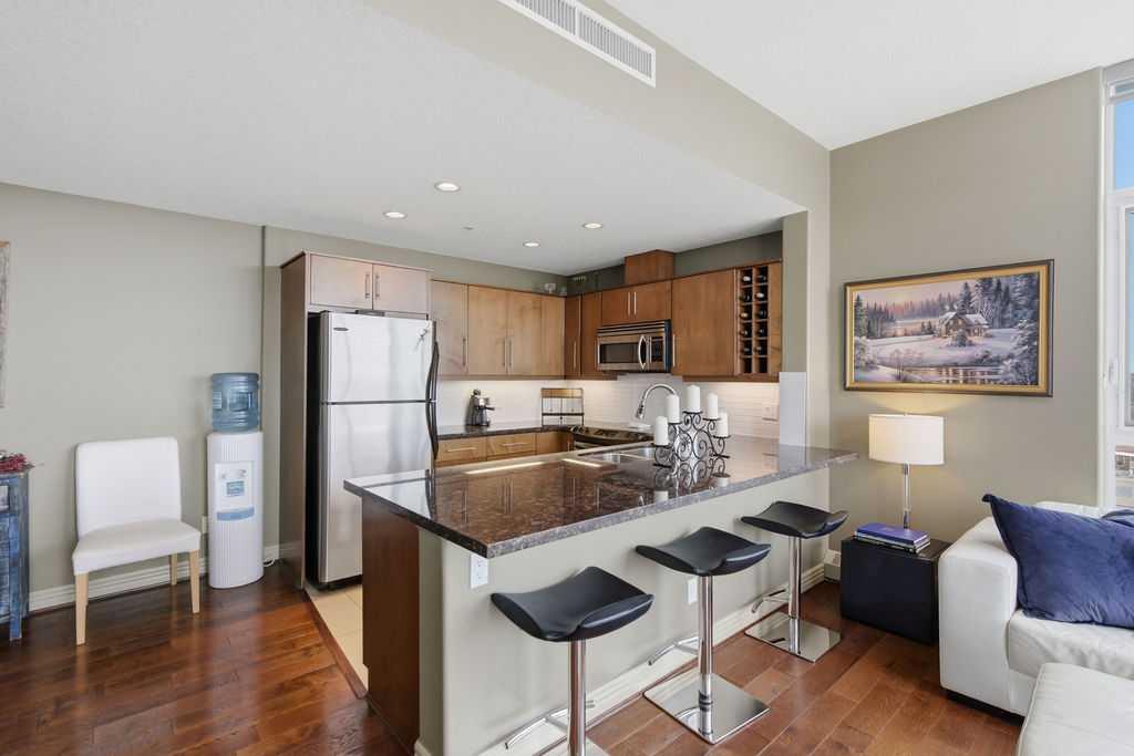 A rare opportunity to own a corner penthouse with sweeping downtown views and beautiful morning sun. Perfectly positioned with east and north exposure, this bright and spacious two-bedroom, two-bathroom residence captures stunning sunrise light and breathtaking views of Downtown Calgary and the Shaganappi Golf Course through expansive wrap-around windows. The thoughtfully designed open-concept layout features new hardwood and tile flooring, creating a clean and modern feel throughout. The kitchen offers granite countertops and excellent functionality, perfect for everyday living or entertaining. Convenient in-suite laundry is also included. A standout feature is the two titled oversized underground parking stalls, ideally located in the garage and large enough to comfortably accommodate larger vehicles or trucks. Residents enjoy access to an exceptional amenities wing, connected by an indoor walkway, featuring an oversized pool, hot tub, recreation area, and a fully updated fitness centre with sweeping golf course views. This well-managed and secure building offers 24-hour on-site security, underground parking, and underground guest parking for added peace of mind. Located just minutes from the C-Train, shopping, and everyday amenities, this home offers incredible privacy, breathtaking views, and outstanding value for penthouse living in a sought-after building. Pets permitted with board approval (one dog or one cat). This is in the Brava Tower, and condo fees include all utilities except electricity and Internet. call to book a private showing.