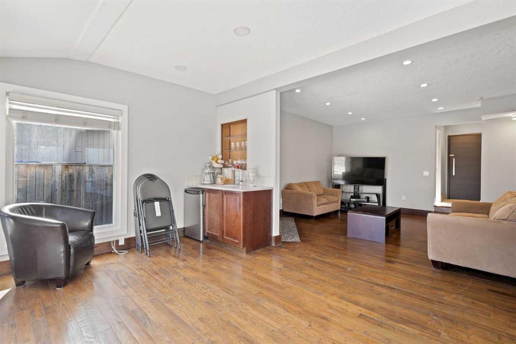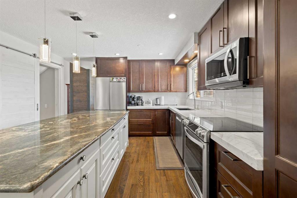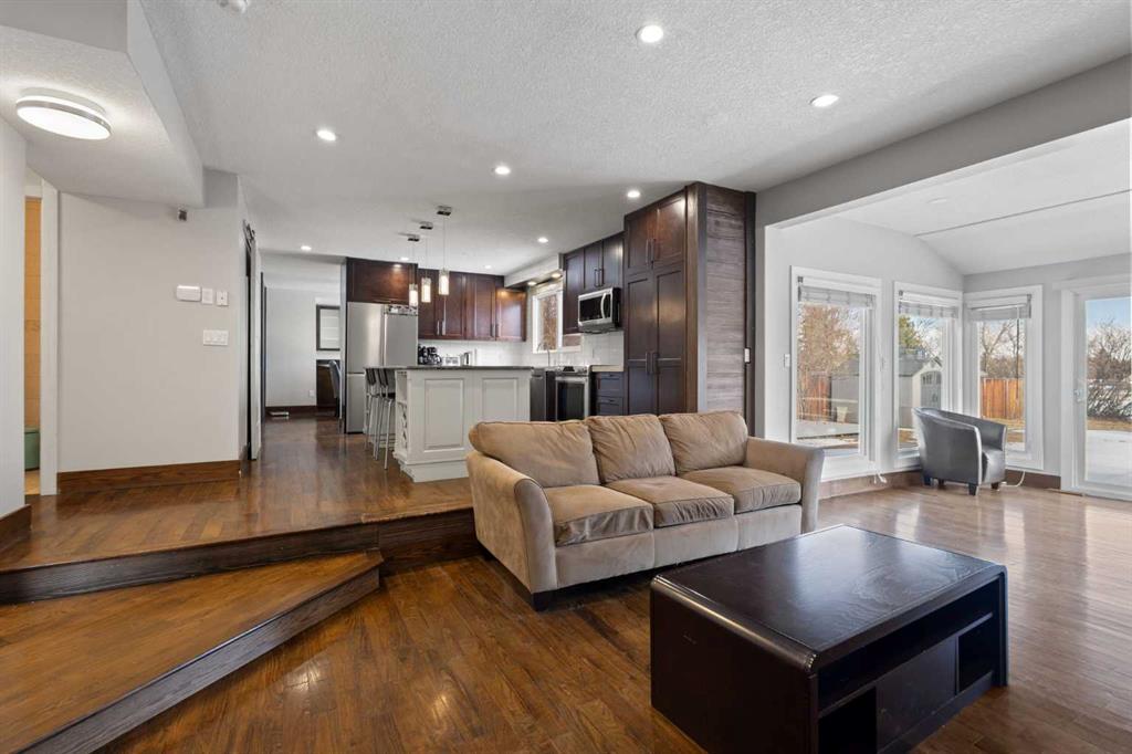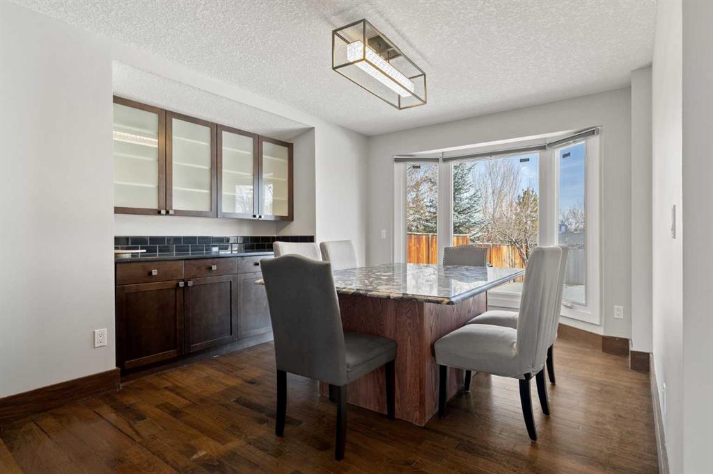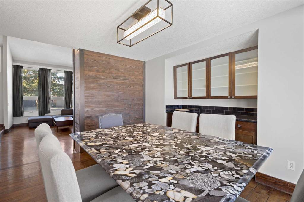 Beautifully renovated two-storey split backing directly onto Canyon Meadows Golf Course, situated on a large private lot over 10,000 sq ft. This spacious home offers an impressive layout with 5½ bathrooms, 5 bedrooms plus a den/office, a heated garage studio (illegal suite) with kitchenette and bathroom, and a side entrance to a fully finished basement with kitchenette (illegal suite), one bedroom and a den. The front living room features soaring ceilings and a dramatic fireplace feature wall, creating a bright and inviting space filled with natural light. The main level also includes a formal dining area and a comfortable family room, ideal for everyday living and entertaining. The renovated kitchen is a standout feature, showcasing rich cabinetry, stainless steel appliances, tile backsplash, and a large central island with granite countertops and seating. The kitchen provides excellent storage and workspace while overlooking the main living areas. Upstairs you will find three spacious bedrooms, including a large primary retreat with a private balcony overlooking Canyon Meadows Golf Course. The upstairs bathrooms have been beautifully renovated with modern tile, glass showers, and double vanities, creating a bright spa-like feel. The main floor also includes a fourth bedroom with full bathroom and cheater ensuite access, ideal for guests or multi-generational living. The home offers three separate washer and dryer sets, providing excellent convenience for larger households or separate living spaces. The fully developed basement includes a separate side entrance and a kitchenette (illegal suite) along with one bedroom and a den that could function as an additional bedroom. A unique feature of the property is the heated garage studio with its own laundry, kitchenette, and private 3-piece bathroom (illegal suite), offering flexible space for guests, extended family, or workspace. Backing directly onto Canyon Meadows Golf Course, this rare property offers privacy, views, and an oversized lot in one of Calgary’s most desirable communities.