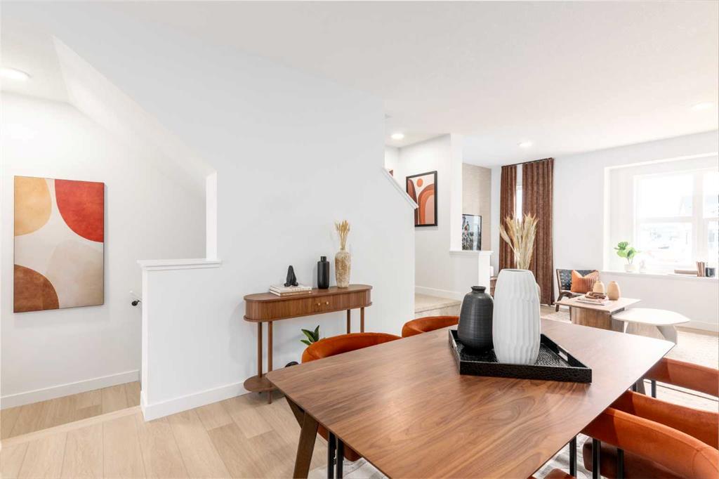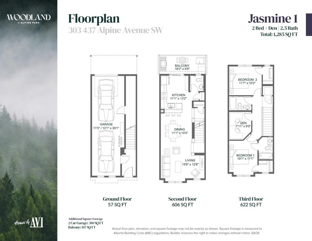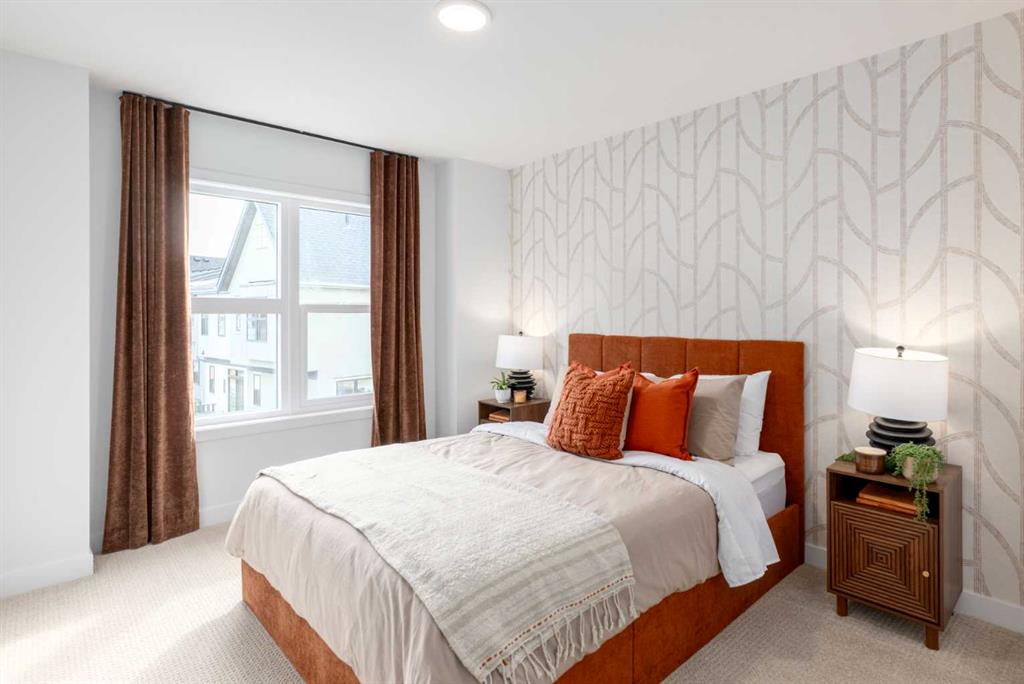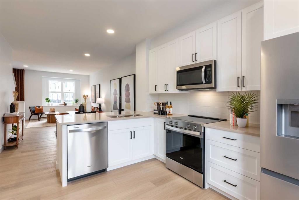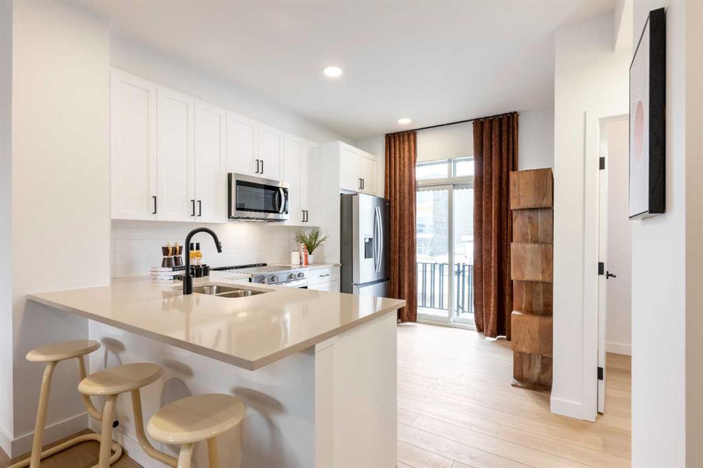 ALPINE PARK IS ONE OF THOSE COMMUNITIES PEOPLE TALK ABOUT AFTER THEY’VE WALKED IT. Wide boulevards, architecture that actually has personality, and a growing village centre designed to bring daily life close to home. If you’ve been watching it take shape and waiting for the right opportunity to get in, this THREE-STOREY Jasmine model at 303, 437 Alpine Avenue SW deserves a closer look. This BRAND-NEW Homes by Avi townhome offers 1,285 square feet of thoughtfully arranged living space across three levels. The east-facing entry opens to a clean, practical ground floor with a welcoming foyer, interior access to the home, and a DOUBLE ATTACHED TANDEM GARAGE that stretches nearly forty feet deep—plenty of room for two vehicles plus bikes, seasonal gear, or the kind of storage every household eventually accumulates. And with construction complete, possession can happen on your timeline. Upstairs is where the home really opens up. The main living level connects the kitchen, dining, and living spaces in one BRIGHT, EASY-FLOWING LAYOUT designed for real everyday life. QUARTZ COUNTERTOPS, a contemporary tile backsplash, pantry storage, and a GENEROUS BREAKFAST BAR give the kitchen both presence and practicality. Just off the dining area, a WEST-FACING BALCONY spans more than sixteen feet—wide enough for a proper outdoor setup and perfectly placed for quiet morning coffee or relaxed evening meals above the street. The top floor keeps the private spaces thoughtfully separated. The primary bedroom includes a walk-in closet and a streamlined three-piece ensuite, while the second bedroom also enjoys its own walk-in closet and convenient access to another full bathroom. A FLEXIBLE DEN sits between the bedrooms—ideal for a home office, reading nook, workout space, or nursery—and the laundry room is right where you want it: upstairs, close to the bedrooms. Outside, the exterior architecture blends MODERN MATERIALS AND CRISP LINES that fit perfectly with Alpine Park’s design-forward streetscape. Step beyond the front door and you’re surrounded by PARKS, PATHWAYS, AND GREEN BOULEVARDS, with the future Village Centre set to bring cafés, shops, and neighbourhood energy just minutes away. The home is finished. The keys are waiting. Come see what life in Alpine Park is starting to look like. • PLEASE NOTE: Photos are of a SHOWHOME of the same model – fit and finish may differ. Interior selections and floorplans shown in photos.