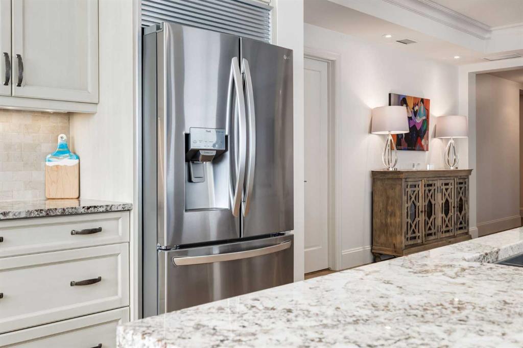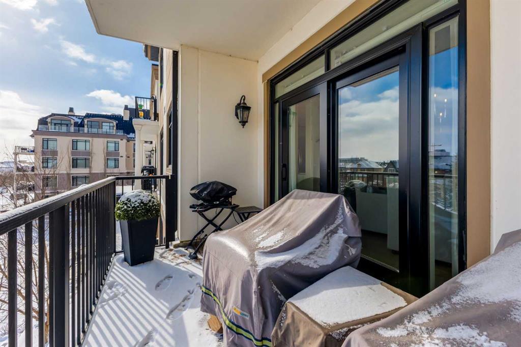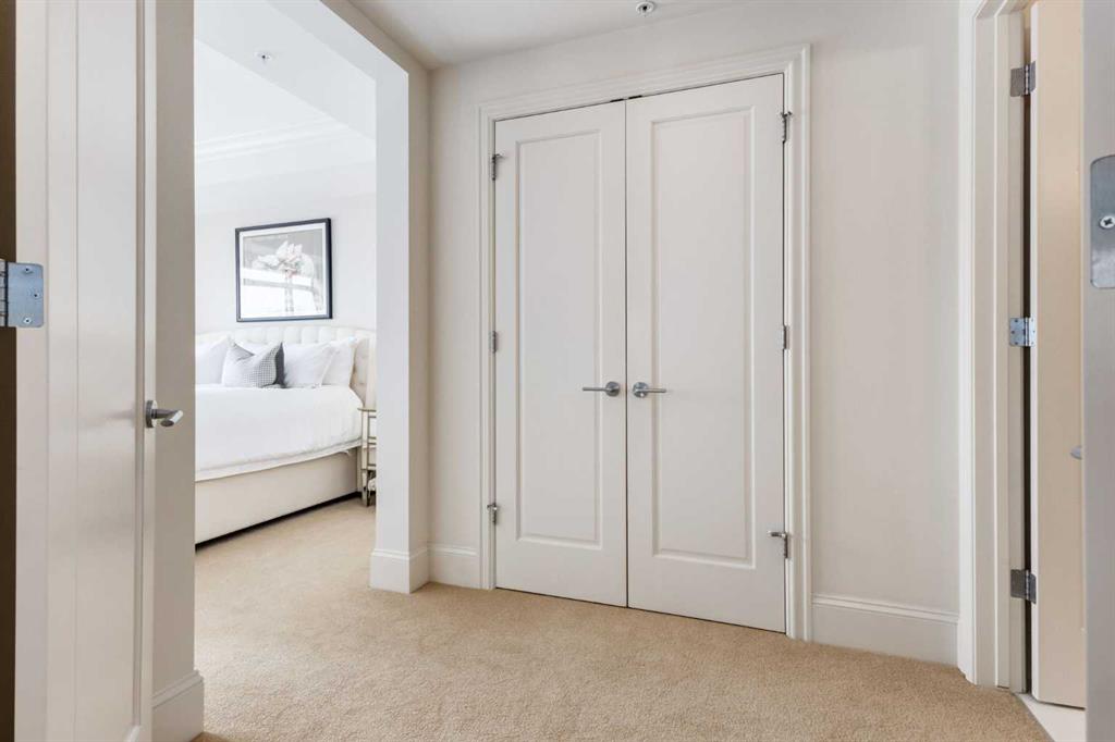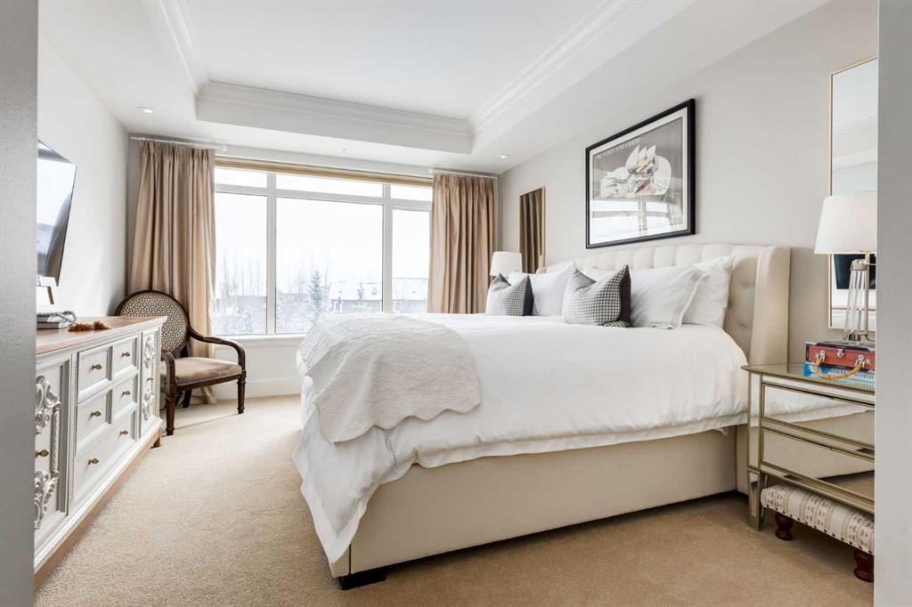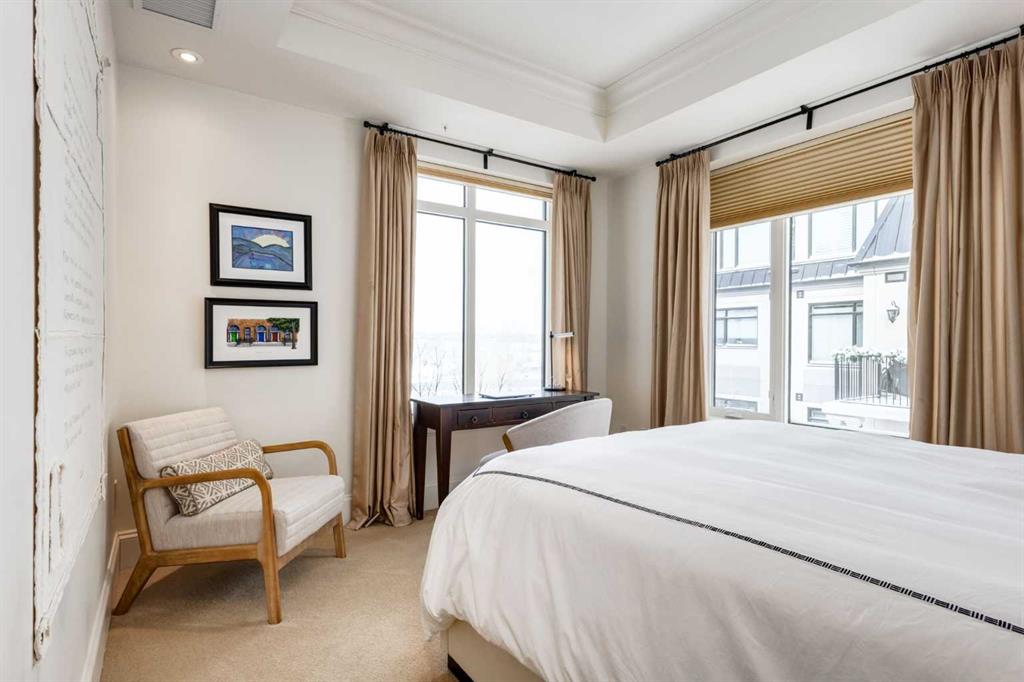 For some, luxury is an occasional indulgence. For others, it is a way of life. If every day luxury & refined living are what you desire, look no further than this outstanding CORNER suite at Champagne in Quarry Park. Offering 1631 SF of impeccably curated living space, with 9-foot ceilings that are flooded with natural light & serene tree top views. Every detail has been thoughtfully considered & the spacious floor plan is sure to delight. A gracious front entrance welcomes you into the suite, & offers a walk-in closet and custom built in cabinetry for your storage needs. The spacious living area with hardwood flooring throughout is sure to delight - a cozy fireplace surrounded by built-ins anchors the living room, sunny & bright dining area with windows on 2 sides is ready to host your family gatherings and provides patio door access to the east facing balcony. The show-stopping kitchen is a chefs dream – expansive island & granite counters, full tile backsplash, luxurious stainless steel appliances including a gas stove & new LG fridge with water/ice dispenser, and an abundance of cabinets providing ample storage including wire pull out racks – so convenient! The serene primary retreat is generously proportioned & offers space for a king-sized bedroom suite & sitting area, while the 5 piece ensuite bath delivers a spa-like experience worthy of a luxury hotel – featuring a relaxing soaking tub, separate shower, granite counters & dual sinks. The walk in closet features a new custom closet system. Second bedroom, equally well-appointed, provides dual aspect windows with beautiful river views & a 3 piece ensuite bath. Additional features include central air conditioning, coffered ceilings, estate millwork, solid core doors, new LG wash/dryer tower with steam function, new composite decking installed on the balcony, new carpet in both bedrooms, Hunter Douglas blinds throughout (black out blinds in the bedrooms), custom drapery in this non-smoking, pet-free home. TWO titled, side by side underground parking stalls are included, located very close to the elevator, a rare & valuable convenience. Also included is a titled storage locker on the same level as the parking spots. You’ll appreciate the peace of mind that comes with Champagne’s reputation for exceptional maintenance & inherently quiet concrete construction. Additional building features include 2 car wash bays, bicycle storage, plenty of visitor parking & a peaceful courtyard. Plus it’s pet friending – 2 dogs or cats or combo of both, with board approval. The location can’t be beat! Walk to Carburn Park, The Market at Quarry Park offers great amenities including Starbucks, The Park and Original Joe’s restaurants & Co-Op grocery, the Remington YMCA is just around the corner and of course the extensive river pathway system is just outside your door. Easy access to major traffic routes and numerous SE Calgary amenities. This unit shows like new and must be viewed in person to be fully appreciated!