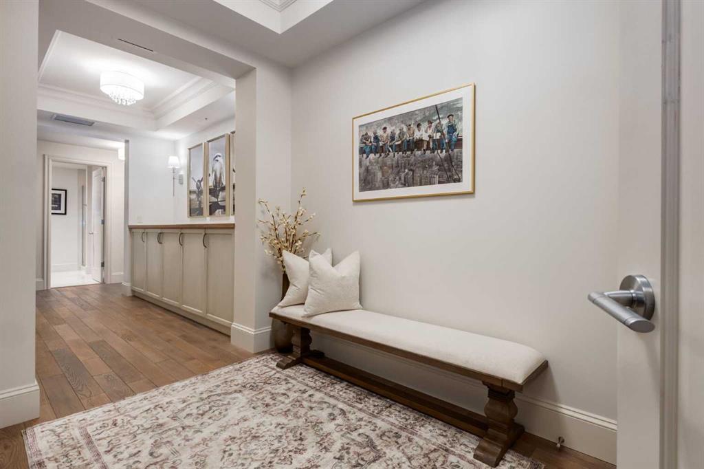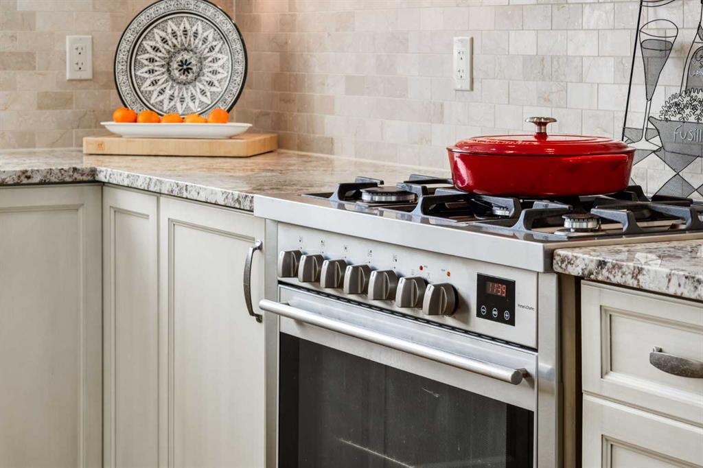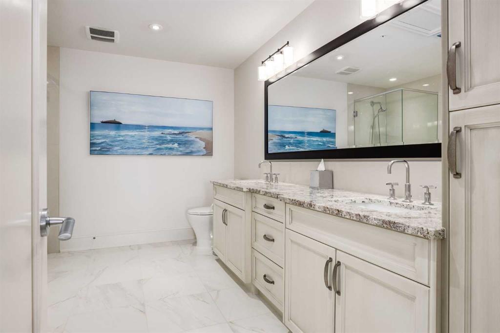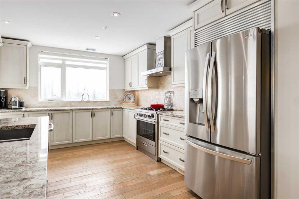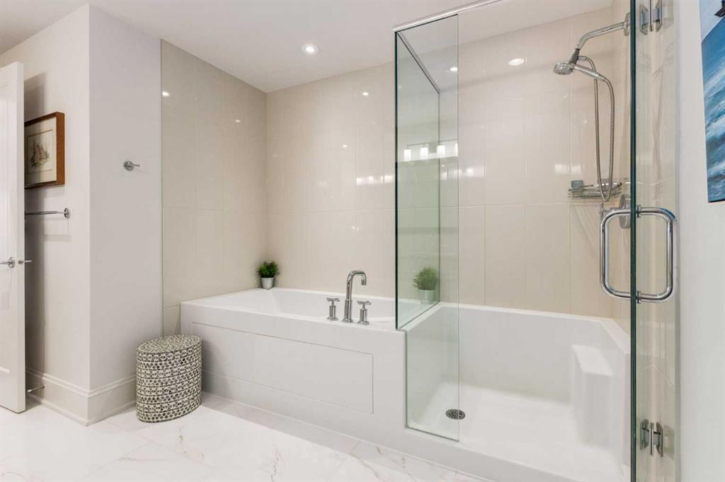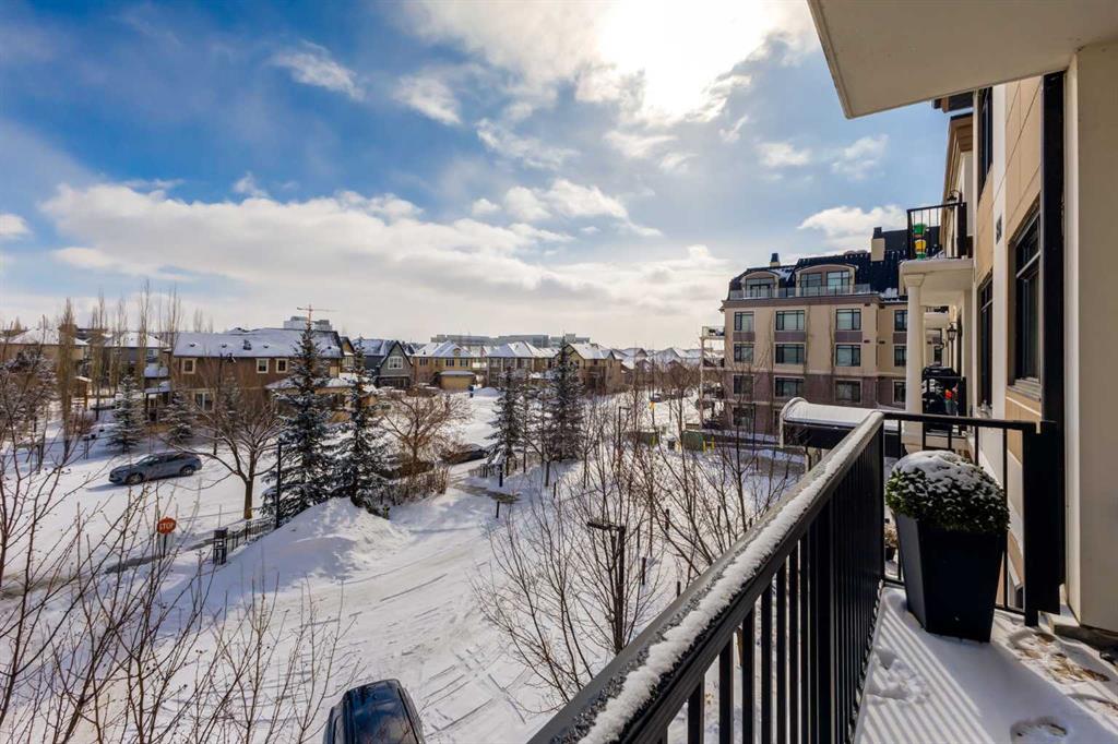 For some, luxury is an occasional indulgence. For others, it is a way of life. If every day luxury & refined living are what you desire, look no further than this outstanding CORNER suite at Champagne in Quarry Park. Offering 1631 SF of impeccably curated living space, with 9-foot ceilings that are flooded with natural light & serene tree top views. Every detail has been thoughtfully considered & the spacious floor plan is sure to delight. A gracious front entrance welcomes you into the suite, & offers a walk-in closet and custom built in cabinetry for your storage needs. The spacious living area with hardwood flooring throughout is sure to delight - a cozy fireplace surrounded by built-ins anchors the living room, sunny & bright dining area with windows on 2 sides is ready to host your family gatherings and provides patio door access to the east facing balcony. The show-stopping kitchen is a chefs dream – expansive island & granite counters, full tile backsplash, luxurious stainless steel appliances including a gas stove & new LG fridge with water/ice dispenser, and an abundance of cabinets providing ample storage including wire pull out racks – so convenient! The serene primary retreat is generously proportioned & offers space for a king-sized bedroom suite & sitting area, while the 5 piece ensuite bath delivers a spa-like experience worthy of a luxury hotel – featuring a relaxing soaking tub, separate shower, granite counters & dual sinks. The walk in closet features a new custom closet system. Second bedroom, equally well-appointed, provides dual aspect windows with beautiful river views & a 3 piece ensuite bath. Additional features include central air conditioning, coffered ceilings, estate millwork, solid core doors, new LG wash/dryer tower with steam function, new composite decking installed on the balcony, new carpet in both bedrooms, Hunter Douglas blinds throughout (black out blinds in the bedrooms), custom drapery in this non-smoking, pet-free home. TWO titled, side by side underground parking stalls are included, located very close to the elevator, a rare & valuable convenience. Also included is a titled storage locker on the same level as the parking spots. You’ll appreciate the peace of mind that comes with Champagne’s reputation for exceptional maintenance & inherently quiet concrete construction. Additional building features include 2 car wash bays, bicycle storage, plenty of visitor parking & a peaceful courtyard. Plus it’s pet friending – 2 dogs or cats or combo of both, with board approval. The location can’t be beat! Walk to Carburn Park, The Market at Quarry Park offers great amenities including Starbucks, The Park and Original Joe’s restaurants & Co-Op grocery, the Remington YMCA is just around the corner and of course the extensive river pathway system is just outside your door. Easy access to major traffic routes and numerous SE Calgary amenities. This unit shows like new and must be viewed in person to be fully appreciated!