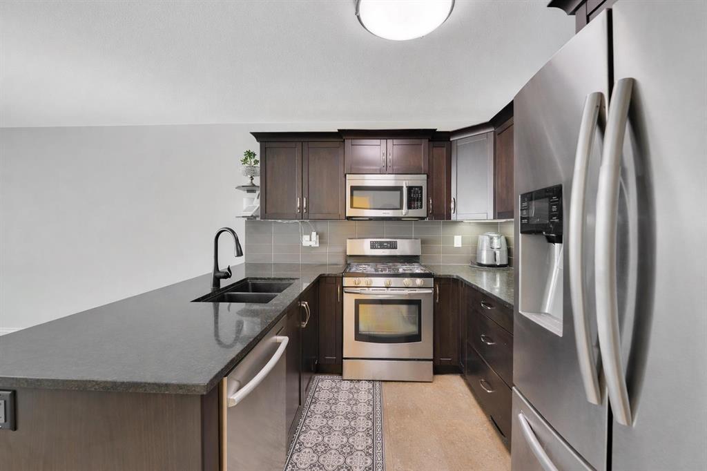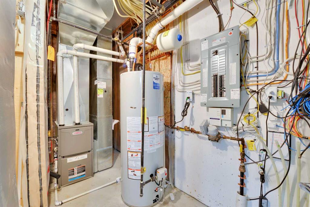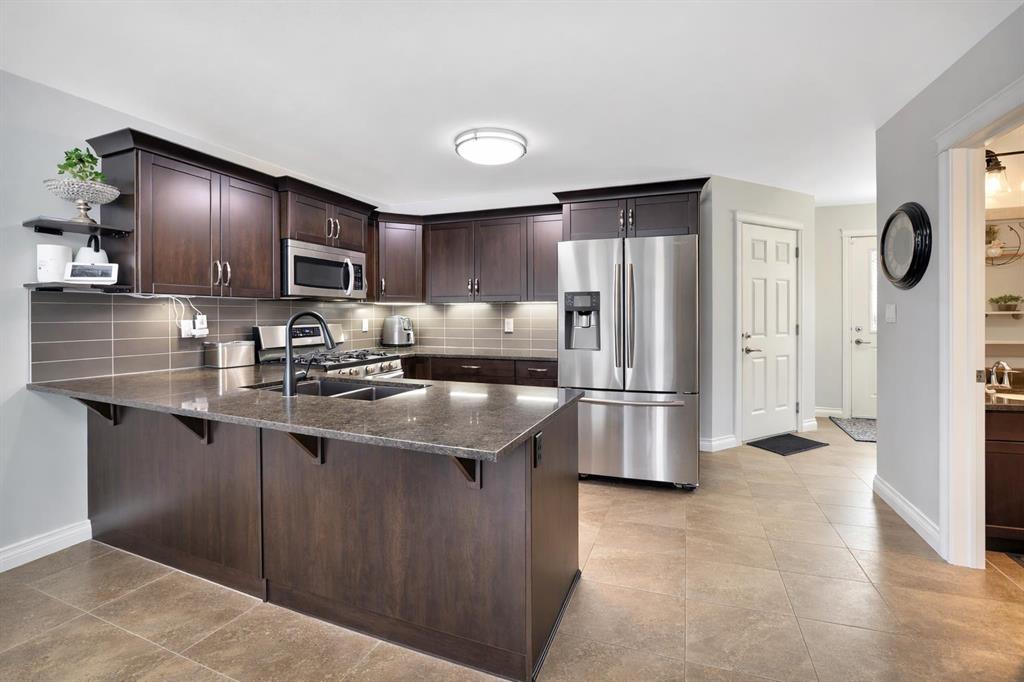 Beautifully Maintained 4 Bedroom, 4 Bathroom Fully Finished Semi-Detached Two-Story Backing onto Green Space. Pride of ownership shines throughout the home in like-new condition, ideally located backing onto peaceful green space and walking trails. A covered front entry welcomes you into a bright, sun-filled foyer. The U-shaped kitchen offers a functional layout featuring rich dark cabinetry, granite countertops, full tile backsplash, undermount sink, lowered eating bar, and a spacious walk-in pantry—perfect for everyday living and entertaining. The dining area easily accommodates large family gatherings, while the inviting living room is filled with natural light from a large picture window overlooking the beautifully landscaped backyard. Garden doors provide direct access to the partially covered deck, ideal for relaxing or hosting summer barbecues. A convenient 2-piece powder room completes the main floor. Upstairs, natural light pours into the staircase through a large window leading to the upper landing, which includes a built-in desk and storage closet. The spacious primary bedroom comfortably fits a king-size bed and additional furniture and features a walk-in closet and private 4-piece ensuite. Two additional generously sized bedrooms share another 4-piece bathroom and stackable laundry is conveniently located on the upper level. Builder finished basement expands your living space with a large family room, 4th bedroom, 4-piece bathroom with linen storage and additional storage areas. Notable upgrades and features include central vacuum, new water tank installed (Oct 2025), updated light fixtures, roughed-in in-floor heating and extensive low-maintenance landscaping. The attached garage is insulated and finished with painted drywall and durable epoxy flooring. Step outside to enjoy the fully fenced backyard, beautifully landscaped with mature trees, shrubs, and perennial garden beds with concrete edging. The yard also includes a composite shed and direct access to green space and walking trails. Located in an excellent neighborhood close to parks, playgrounds, schools, transit, and multiple shopping plazas, this home offers the perfect blend of comfort, convenience, and natural surroundings. A truly move-in-ready home where pride in ownership is evident throughout.