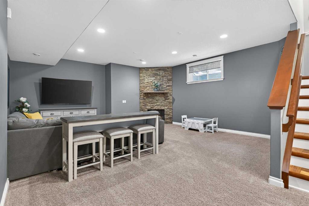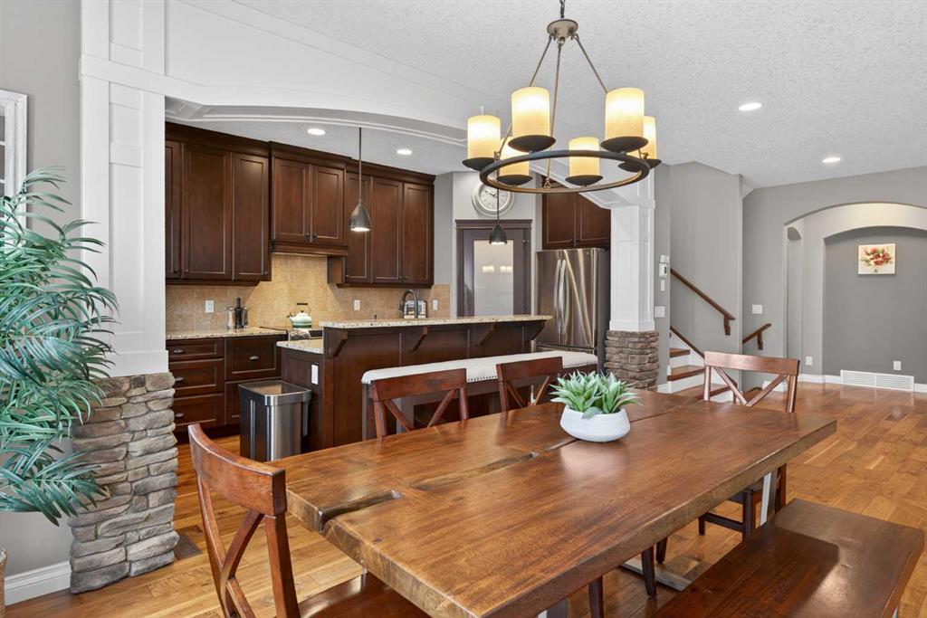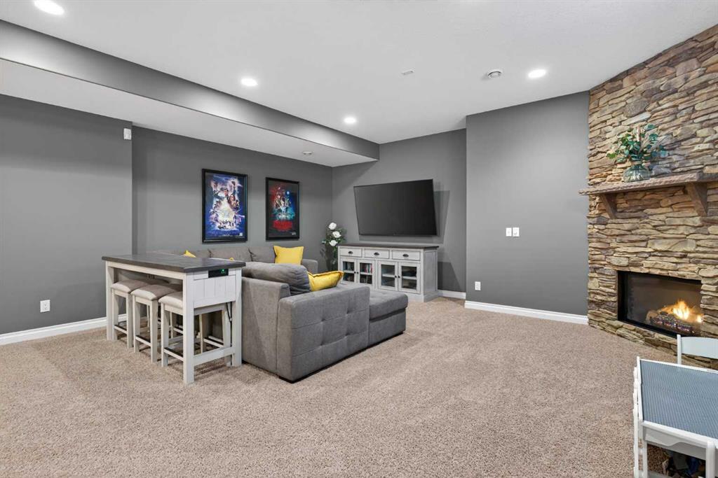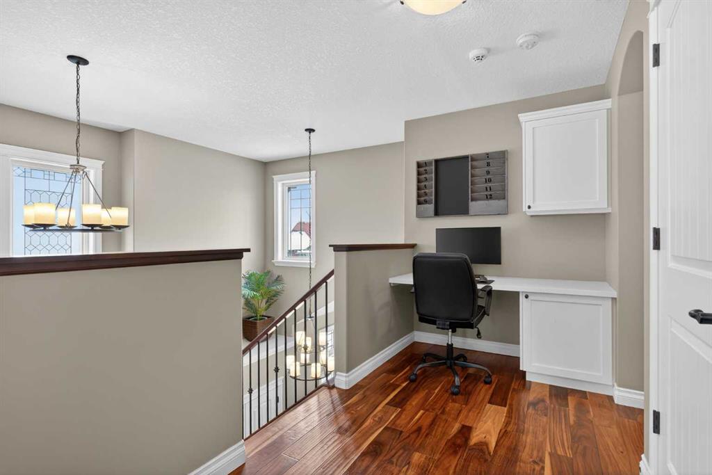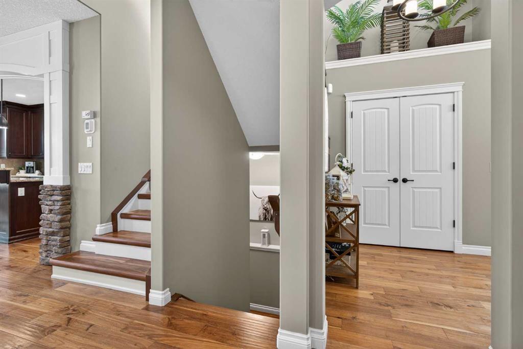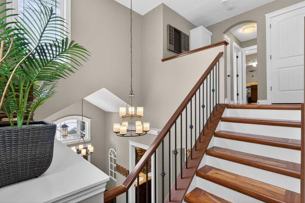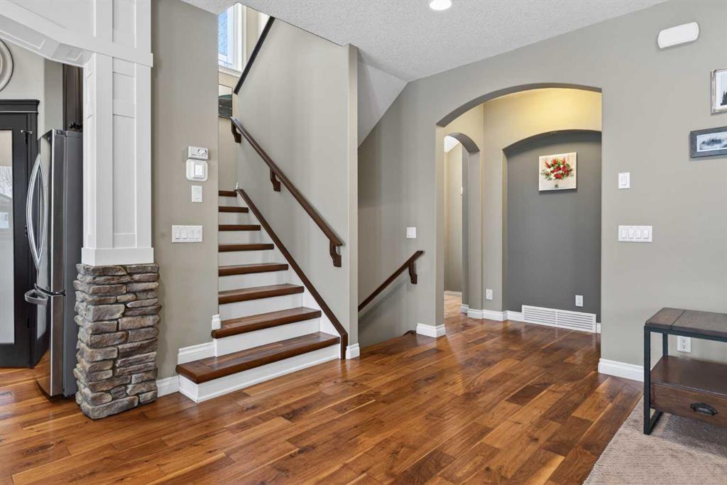 Everything you’ve been looking for in your next home is here in this stunning executive two storey in Cooper’s Crossing…4 BEDROOMS & CENTRAL AIR, highly sought-after HEATED 3 CAR GARAGE, 2 gas fireplaces & wonderful outdoor living space for the family to enjoy! This extensively upgraded custom home boasts WALNUT & ACACIA HARDWOOD FLOORS, fully-loaded chef’s kitchen with GRANITE COUNTERTOPS, 3.5 bathrooms & is WALKING DISTANCE to neighbourhood schools & leisurely stroll to Discovery Park. Complemented by expansive 9ft ceilings & wide-plank walnut flooring, you will truly be impressed by the elegant feel of the main floor with its inviting living room with STONE-FACING FIREPLACE accented by built-in cabinets, airy open concept dining room with picture windows looking out into the backyard & beautiful kitchen with full-height cabinets & island with raised bar, GRANITE COUNTERS, walk-in pantry & sleek stainless steel appliances including BOSCH DISHWASHER & Samsung stove/convection oven. Upstairs there are 3 fantastic bedrooms & 2 full bathrooms – highlighted by the owners’ retreat with vaulted ceilings, big walk-in closet & luxurious soaker tub ensuite with double vanities & separate shower. One of the kid’s bedrooms also has built-in shelving & walk-in closet. Completing the 2nd floor is an OFFICE ALCOVE/LOFT with built-in desk & laundry with front-loading Samsung washer & dryer. The lower level – with 9ft ceilings, is beautifully finished with a 4th bedroom & full bath, PLAYROOM, loads of storage space & wonderful rec room with ANOTHER STONE-FACING FIREPLACE. The 3 CAR GARAGE…tandem-style…is insulated, drywalled & HEATED, with built-in shelving & 1 bay currently set up as an awesome HOME GYM. For your outdoor pleasure, the backyard is fully fenced & landscaped, complete with STONE PATIO WITH FIREPIT, fruit trees (including sour cherry), play structure for the kids & partially covered 300+sqft DECK with gas BBQ line. Additional features include NEW FURNACE (2025) & CENTRAL AIR (2022), main floor mudroom with built-in lockers & walk-in closet, grand foyer with soaring 18ft ceilings, upgraded lighting & fixtures, wrought-iron spindles & granite counters in all the bathrooms. THREE SCHOOLS ARE ALL WITHIN WALKING DISTANCE…Cooper’s Crossing School, St. Veronica School & St. Martin de Porres High School. And only minutes away is COOPER’S TOWN PROMENADE…featuring an open-air stage & firepit, office space, restaurants & a wide variety of shopping (anchored by Shopper’s Drug Mart & Save-On-Foods). Prime location in this highly-desirable Southwest Airdrie neighbourhood within easy reach of the Sierra Springs Shopping Centre & quick access to 40 Avenue & the QE2, Cross Iron Mills, Costco & Calgary.