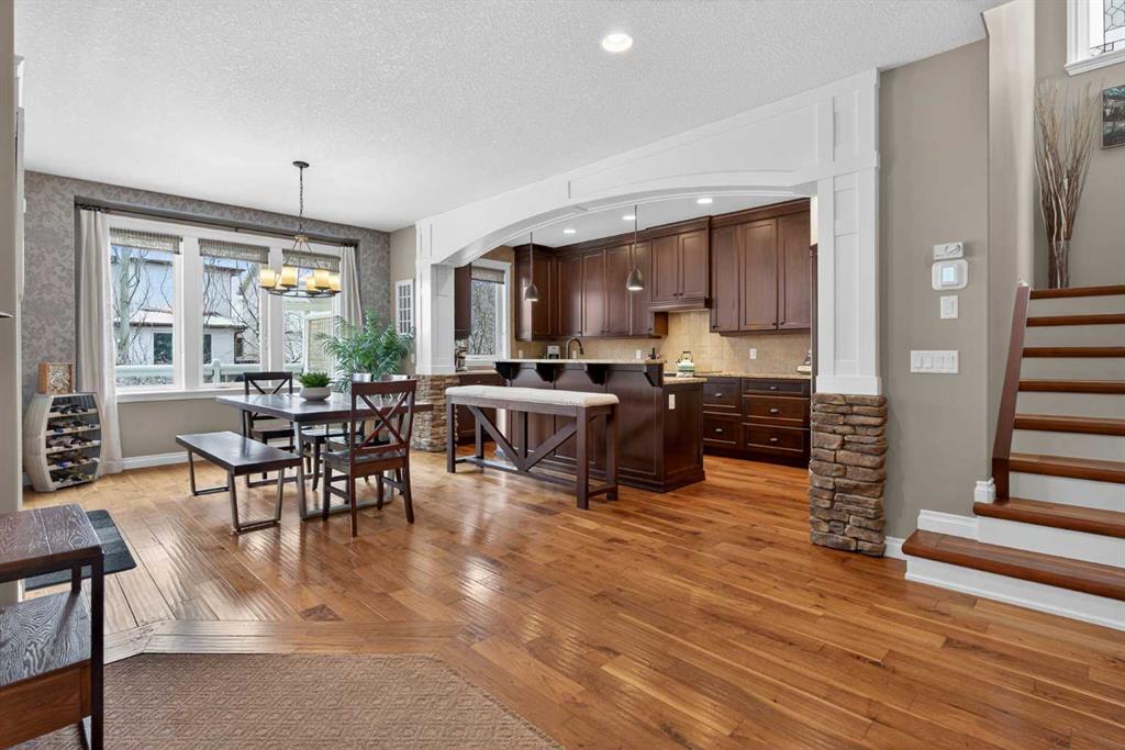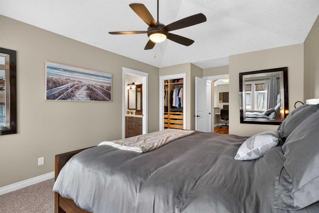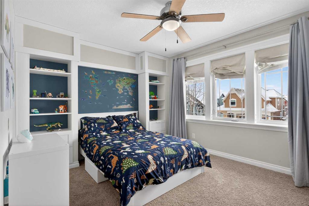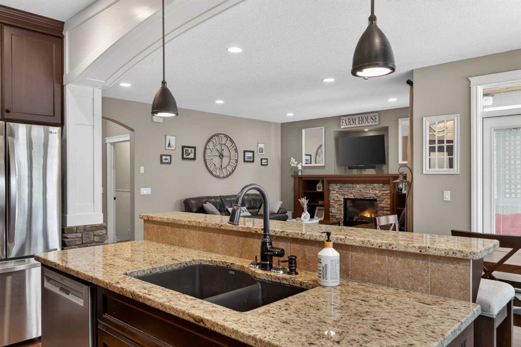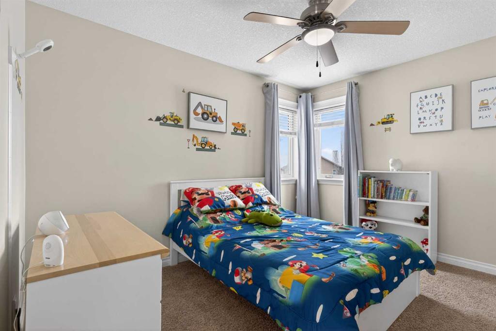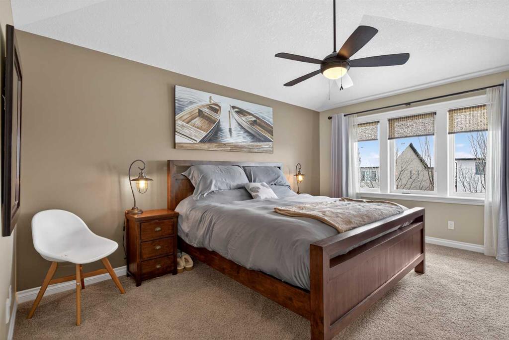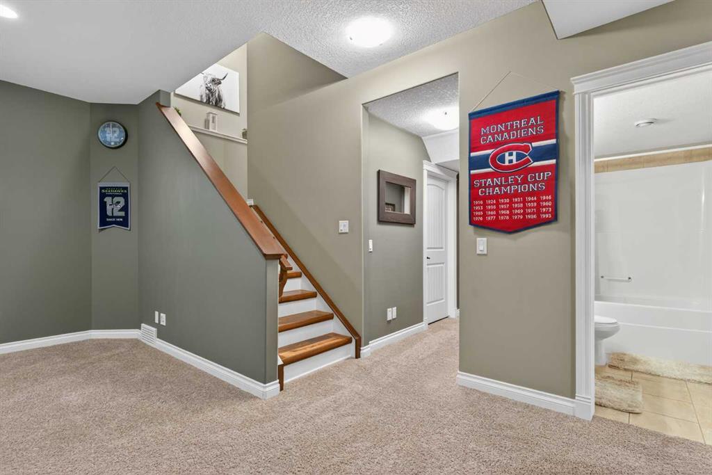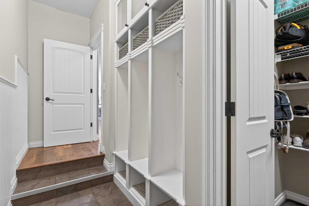 Everything you’ve been looking for in your next home is here in this stunning executive two storey in Cooper’s Crossing…4 BEDROOMS & CENTRAL AIR, highly sought-after HEATED 3 CAR GARAGE, 2 gas fireplaces & wonderful outdoor living space for the family to enjoy! This extensively upgraded custom home boasts WALNUT & ACACIA HARDWOOD FLOORS, fully-loaded chef’s kitchen with GRANITE COUNTERTOPS, 3.5 bathrooms & is WALKING DISTANCE to neighbourhood schools & leisurely stroll to Discovery Park. Complemented by expansive 9ft ceilings & wide-plank walnut flooring, you will truly be impressed by the elegant feel of the main floor with its inviting living room with STONE-FACING FIREPLACE accented by built-in cabinets, airy open concept dining room with picture windows looking out into the backyard & beautiful kitchen with full-height cabinets & island with raised bar, GRANITE COUNTERS, walk-in pantry & sleek stainless steel appliances including BOSCH DISHWASHER & Samsung stove/convection oven. Upstairs there are 3 fantastic bedrooms & 2 full bathrooms – highlighted by the owners’ retreat with vaulted ceilings, big walk-in closet & luxurious soaker tub ensuite with double vanities & separate shower. One of the kid’s bedrooms also has built-in shelving & walk-in closet. Completing the 2nd floor is an OFFICE ALCOVE/LOFT with built-in desk & laundry with front-loading Samsung washer & dryer. The lower level – with 9ft ceilings, is beautifully finished with a 4th bedroom & full bath, PLAYROOM, loads of storage space & wonderful rec room with ANOTHER STONE-FACING FIREPLACE. The 3 CAR GARAGE…tandem-style…is insulated, drywalled & HEATED, with built-in shelving & 1 bay currently set up as an awesome HOME GYM. For your outdoor pleasure, the backyard is fully fenced & landscaped, complete with STONE PATIO WITH FIREPIT, fruit trees (including sour cherry), play structure for the kids & partially covered 300+sqft DECK with gas BBQ line. Additional features include NEW FURNACE (2025) & CENTRAL AIR (2022), main floor mudroom with built-in lockers & walk-in closet, grand foyer with soaring 18ft ceilings, upgraded lighting & fixtures, wrought-iron spindles & granite counters in all the bathrooms. THREE SCHOOLS ARE ALL WITHIN WALKING DISTANCE…Cooper’s Crossing School, St. Veronica School & St. Martin de Porres High School. And only minutes away is COOPER’S TOWN PROMENADE…featuring an open-air stage & firepit, office space, restaurants & a wide variety of shopping (anchored by Shopper’s Drug Mart & Save-On-Foods). Prime location in this highly-desirable Southwest Airdrie neighbourhood within easy reach of the Sierra Springs Shopping Centre & quick access to 40 Avenue & the QE2, Cross Iron Mills, Costco & Calgary.