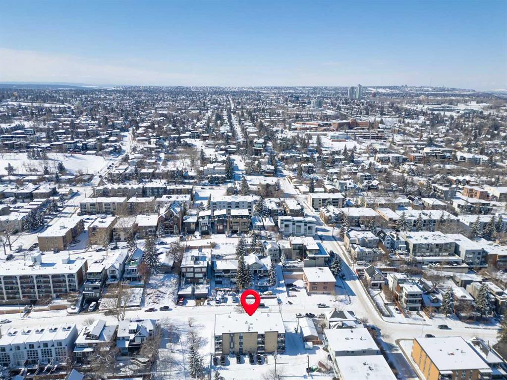 Immaculate and excellent value in this turnkey west-facing corner condo located next to Buckmaster Park in the heart of Bankview. Enjoy immediate access to one of the community’s best outdoor spaces, with the community centre, tennis courts, community gardens, and off-leash dog park just steps away. This bright and recently renovated condo offers abundant natural light and a spacious secure sunroom perfect for relaxing. The updated kitchen features granite countertops, stainless steel appliances, and modern finishes. The unit has been professionally painted with brand new flooring throughout, creating a fresh, move-in ready space. The well-designed layout includes two bedrooms and a renovated bathroom with granite counters and updated tile surround. Additional highlights include in-suite laundry, an oversized parking stall, a separate storage locker, and convenient bicycle storage. Located in a quiet, pet-friendly concrete building, this condo is just a short walk to transit, shops, restaurants, and amenities, with easy access to downtown, 17th Avenue and Marda Loop. A fantastic opportunity offering exceptional value and strong investment potential in one of Calgary’s most walkable inner-city neighbourhoods.