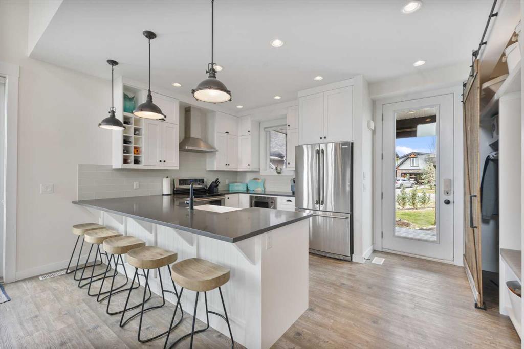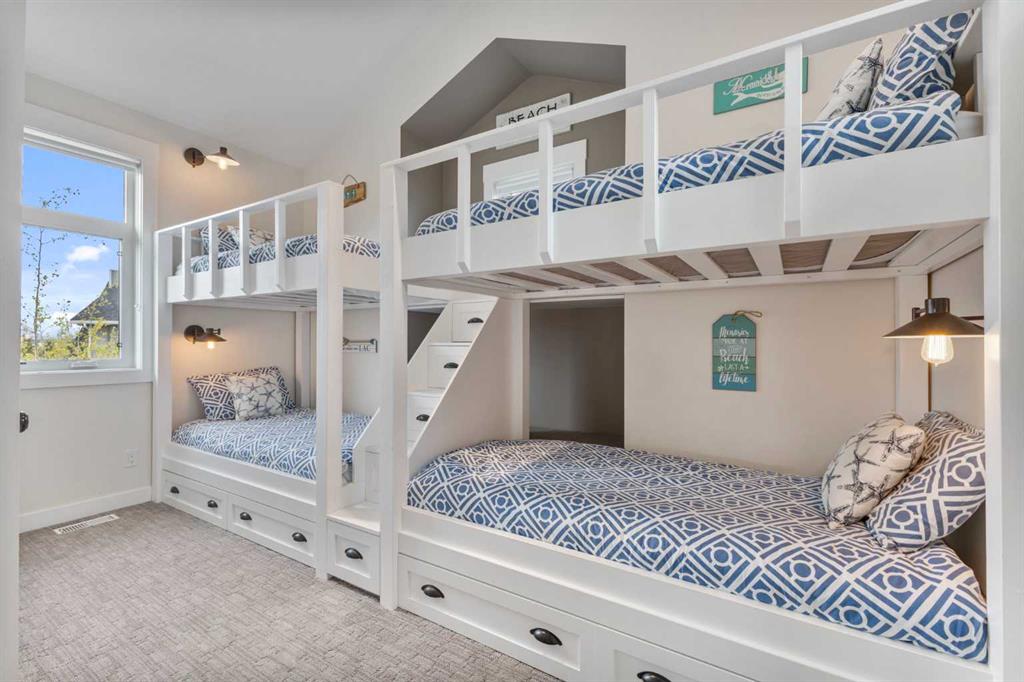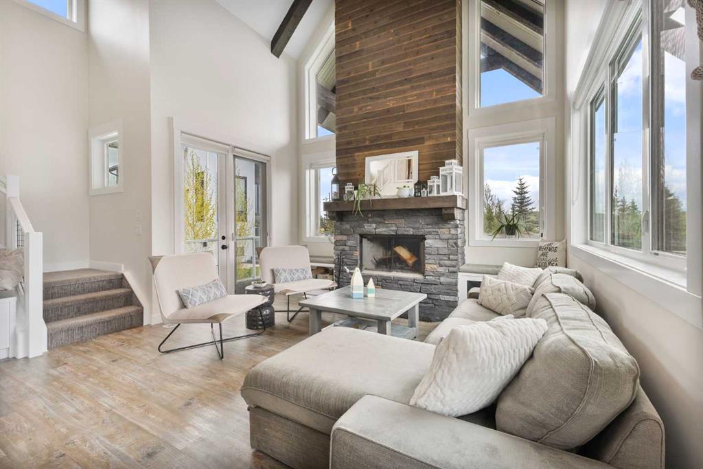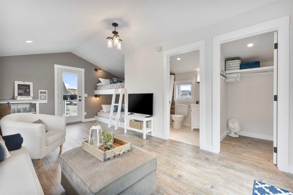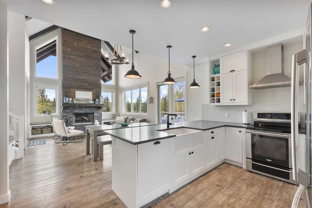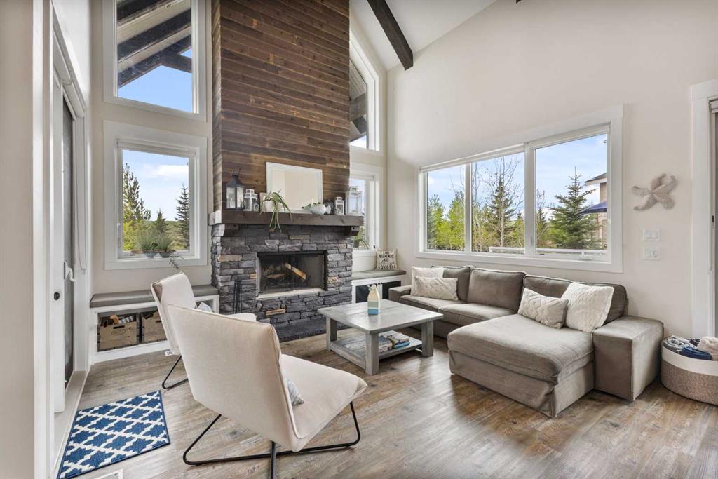 Welcome to your dream lake retreat at Ghost Lake – a truly exceptional property nestled on the largest developed lot in this prestigious gated community. This elegant and thoughtfully designed home backs onto a tranquil green space, offering the perfect blend of privacy, natural beauty, and high-end living. The luxury touches throughout such as premium triple-pane windows, offering superior comfort and energy efficiency along with the beautiful copper roof accents add timeless elegance and durability, reflective of the home's commitment to quality craftmanship. Step inside the main house and be greeted by a breathtaking 21-foot vaulted ceiling that crowns the open-concept main floor. The wood-burning fireplace creates a cozy and inviting atmosphere, ideal for relaxing after a day on the lake or entertaining friends and family. A stylish powder room adds convenience and charm to the space. Upstairs, you’ll find a cozy bunk room that sleeps four, perfect for kids or guests, alongside the primary bedroom and a 3-piece bathroom. The fully finished basement extends your living space with a generous recreation room and hosts the laundry area, offering both comfort and practicality. The magic continues outdoors where a wraparound deck invites you to host unforgettable gatherings under the stars. Lounge by the second wood-burning fireplace, unwind in the inflatable hot tub, or simply soak in the peaceful surroundings of this dark sky community. A separate carriage house offers even more flexibility, featuring its own coffee bar, queen sized bunk beds, and another 3-piece bathroom – perfect for hosting extended family, guests, or creating a private retreat space. As part of this exclusive lakeside community, you’ll enjoy unmatched amenities including lake access, an indoor pool, hot tub, tennis courts, fitness facility, community dock, kitchen, and beach volleyball courts – all set against the stunning backdrop of the Rocky Mountains. Whether you’re looking for a luxurious full-time residence or an upscale weekend getaway, this remarkable Ghost Lake property offers an unparalleled lifestyle. Don't miss this rare opportunity to own a premier piece of paradise – where nature, luxury, and community come together beautifully.