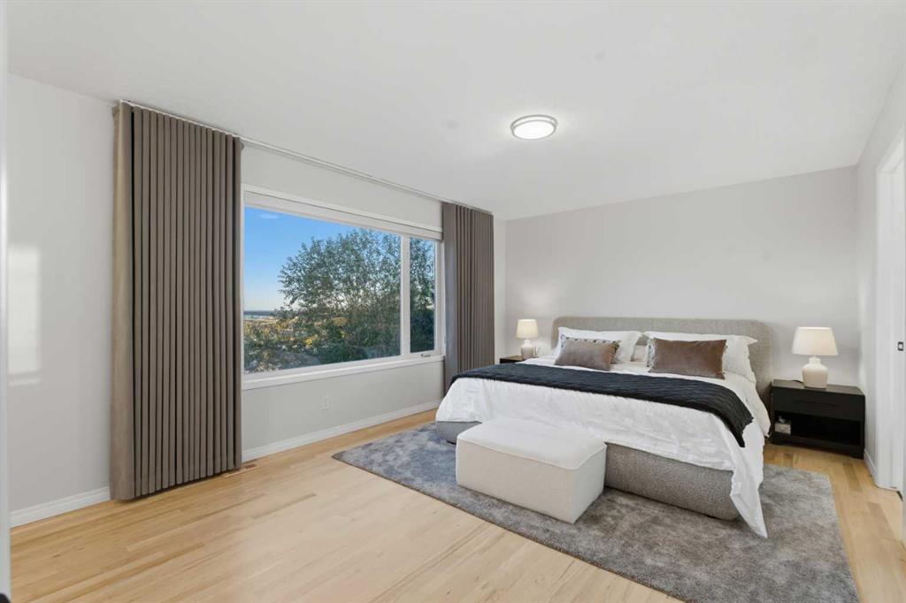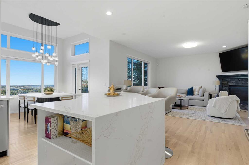 PANORAMIC BLUFF VIEWS | BACKING ONTO SPRINGBANK HILL RIDGE | HUGE PIE LOT | FINISHED WALKOUT BASEMENT | DESIGNER UPGRADES | HEATED DOUBLE GARAGE | Panoramic ridge views and a coveted position backing onto the bluffs of Springbank Hill define this beautifully updated residence set on a huge pie-shaped lot. Contemporary design elements and thoughtful upgrades introduce a refined aesthetic while an open-concept layout allows natural light and sweeping vistas to shape the atmosphere throughout the home. Oversized windows frame the landscape beyond the backyard while a gas fireplace establishes a warm focal point within the welcoming living area. Culinary creativity finds its place in a carefully designed kitchen equipped with a gas cooktop, stainless steel appliances, crisp white cabinetry, a hexagon tile backsplash and a generous waterfall-edge breakfast bar island suited for casual dining and conversation. Walls of glass surround the dining space where soaring ceilings and cascading designer lighting accompany uninterrupted views, creating an impressive setting for gatherings and everyday meals alike. Glass railings border the elevated deck, offering an exceptional vantage point over the bluffs and an inviting outdoor destination for BBQs, relaxing and warm-weather entertaining. Time spent together continues upstairs in a vaulted bonus room that provides ample space for movie nights or games. Tranquility defines the primary retreat where breathtaking views, a comfortable sitting area and a custom walk-in closet enhance everyday living while the ensuite includes dual sinks, a deep soaker tub and an oversized rain shower. One additional bright bedroom and a full bathroom complete the upper level. Style continues into the fully finished walkout basement where a sleek wet bar supports effortless entertaining alongside a built-in bar-top workspace and a spacious recreation area centered around a second fireplace. Two more bedrooms, a full bathroom and a second laundry area introduce flexibility for guests, extended family or short-term rental possibilities. Outdoor living extends across multiple seating areas including a covered lower patio and rear deck, all surrounded by mature trees and panoramic southwest skyline views. Year-round convenience comes from the insulated, drywalled and heated double garage. Direct access to nearby walking paths enhances the lifestyle offered in this sought-after community, with top-rated schools, several golf courses and everyday amenities just minutes away at West 85th, Aspen Landing and Westhills Towne Centre. Recreation opportunities await at Westside Recreation Centre and Griffith Woods Park while downtown Calgary remains easily accessible. Carefully curated upgrades and exceptional surroundings combine to create a modern retreat designed to embrace the best of Springbank Hill living.