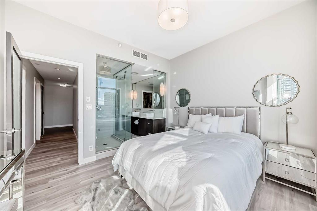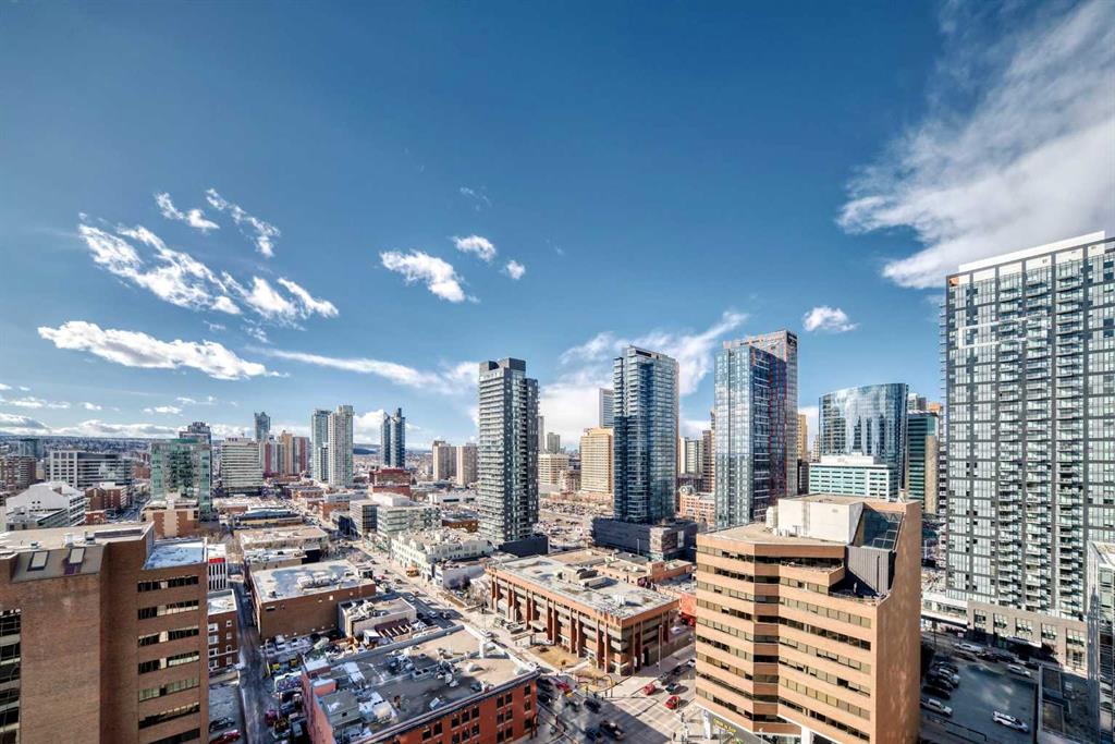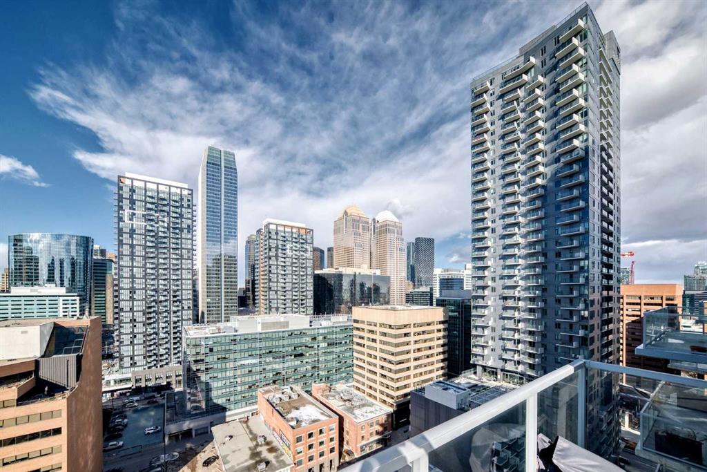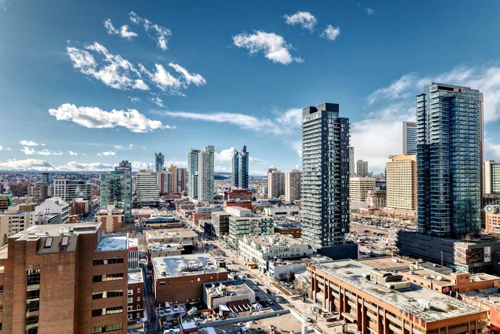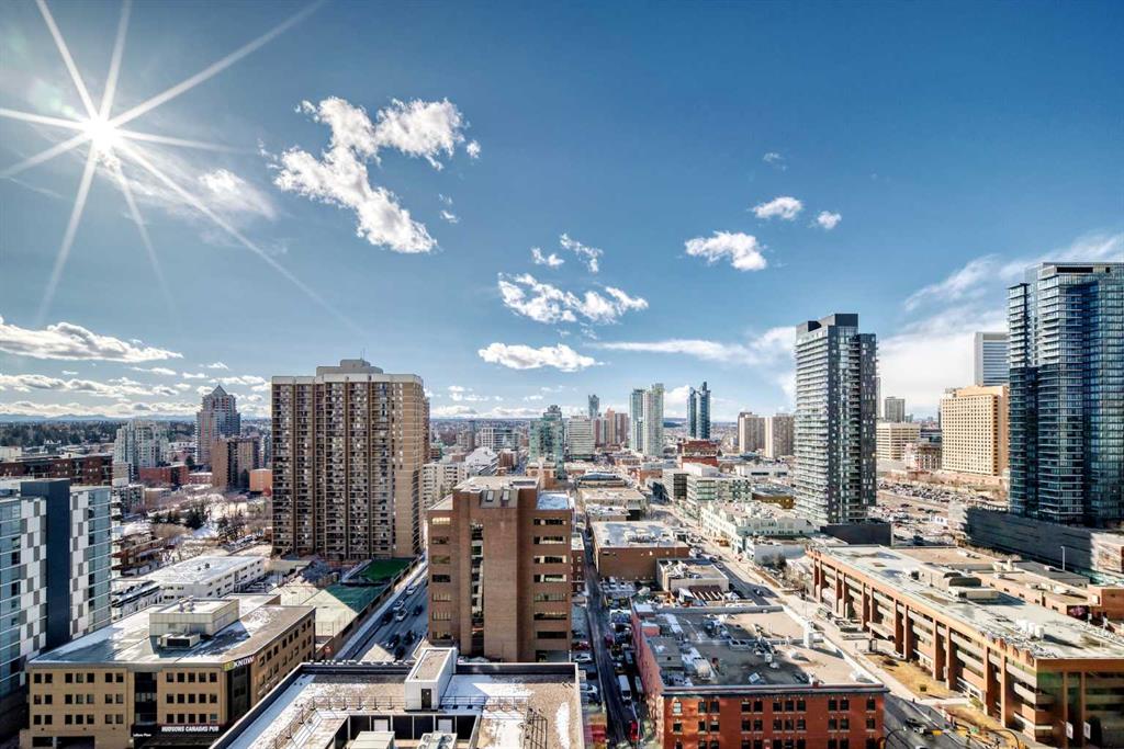 Sub Penthouse!! Experience elevated urban living in this stunning executive condo, featuring unobstructed panoramic city and mountain views. Flooded with natural light by day and illuminated by the glow of city lights at night, this spacious and immaculate suite offers an open floor plan with 9-ft ceilings, floor-to-ceiling windows, modern floors, and solid concrete construction. The generous kitchen is designed for both everyday living and entertaining, complete with extensive cabinetry, stainless steel appliances, quartz countertops, and a built-in wine cooler. The bright living area is surrounded by glass and seamlessly extends to an impressive 190 sq. ft. balcony with sweeping city views, creating the perfect setting for entertaining or relaxing while enjoying spectacular sunsets and the vibrant downtown skyline. The primary retreat features a spa-inspired ensuite with quartz counters, double vanity, large glass-enclosed steam shower, and walk-in closet. A spacious second bedroom, full bath, and convenient laundry complete the interior. Additional highlights include central air conditioning, titled storage locker, and 2 titled parking stalls. Ideally located in the heart of Calgary’s vibrant urban core, this exceptional residence offers the perfect blend of luxury, comfort, and lifestyle.