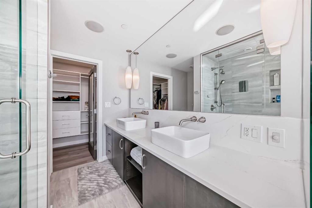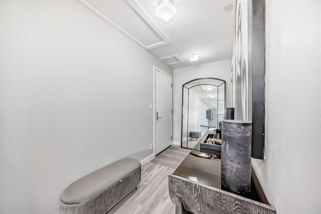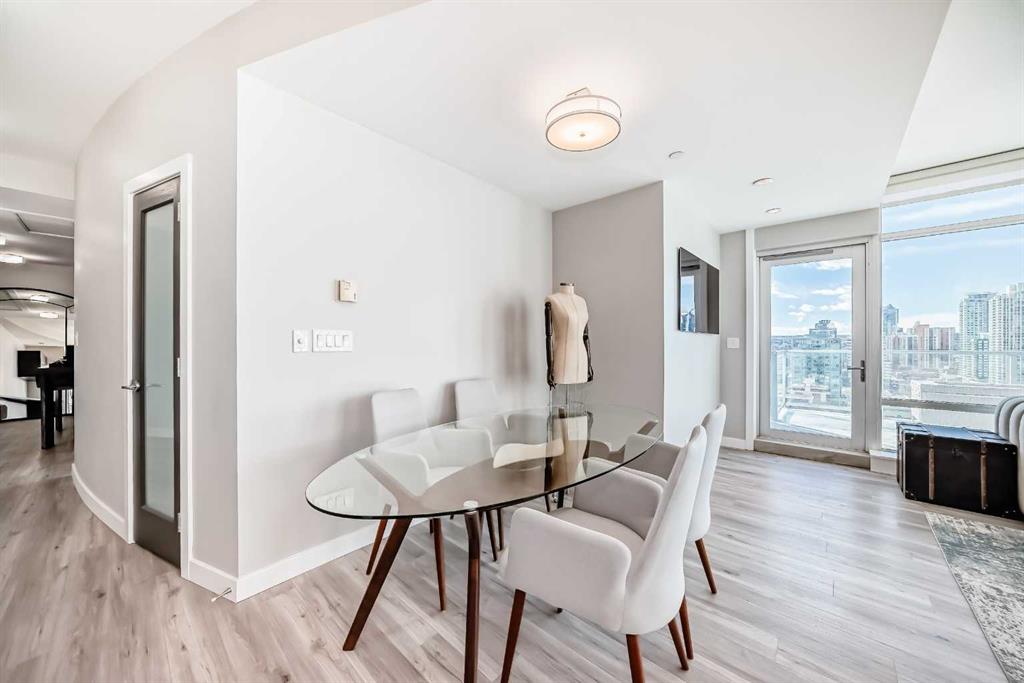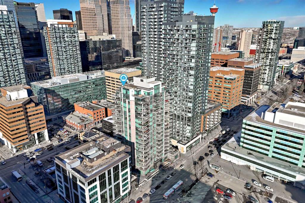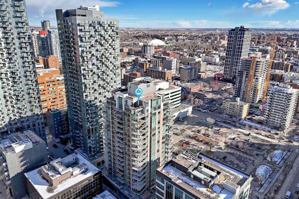 Sub Penthouse!! Experience elevated urban living in this stunning executive condo, featuring unobstructed panoramic city and mountain views. Flooded with natural light by day and illuminated by the glow of city lights at night, this spacious and immaculate suite offers an open floor plan with 9-ft ceilings, floor-to-ceiling windows, modern floors, and solid concrete construction. The generous kitchen is designed for both everyday living and entertaining, complete with extensive cabinetry, stainless steel appliances, quartz countertops, and a built-in wine cooler. The bright living area is surrounded by glass and seamlessly extends to an impressive 190 sq. ft. balcony with sweeping city views, creating the perfect setting for entertaining or relaxing while enjoying spectacular sunsets and the vibrant downtown skyline. The primary retreat features a spa-inspired ensuite with quartz counters, double vanity, large glass-enclosed steam shower, and walk-in closet. A spacious second bedroom, full bath, and convenient laundry complete the interior. Additional highlights include central air conditioning, titled storage locker, and 2 titled parking stalls. Ideally located in the heart of Calgary’s vibrant urban core, this exceptional residence offers the perfect blend of luxury, comfort, and lifestyle.