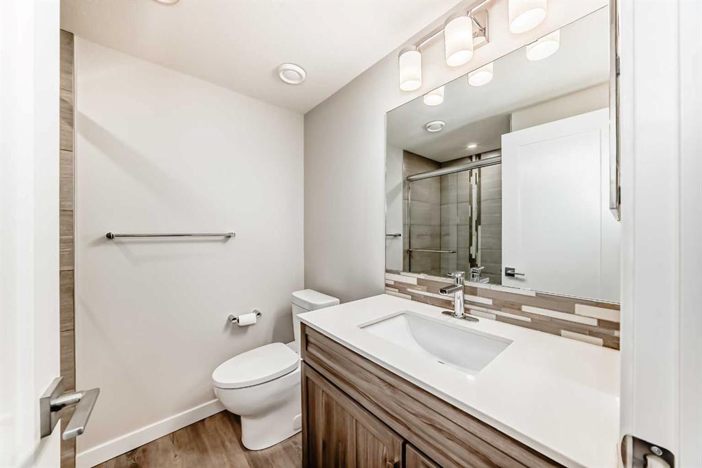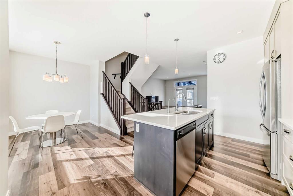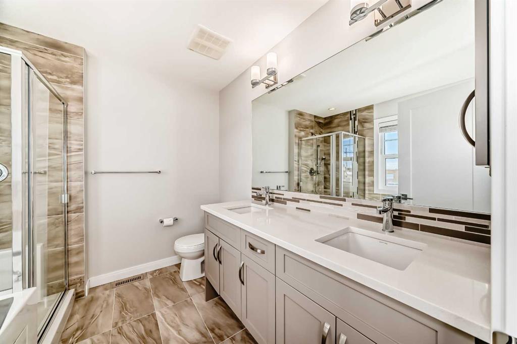 Located in the desirable community of West Springs, this well-maintained three-storey townhouse offers bright, functional living space throughout. The entry level features 9-ft ceilings, tile and laminate flooring, and a spacious den/office. The main floor showcases 9-ft ceilings and laminate flooring, with a generous kitchen featuring quartz countertops, stainless steel appliances including a gas stove, and a large island with a flush eating bar. The open layout flows into the dining area and spacious living room with a study nook/additional paly area, plus a 2-pc bathroom and access to the west-facing balcony. Upstairs offers two huge primary bedrooms, each with a walk-in closet and private ensuite. One ensuite includes double sinks, a soaker tub, and separate shower. Laundry is conveniently located on this level. The fully finished basement adds a third bedroom, a 3-pc bathroom, and a long storage room. Additional features include a double attached garage, front patio, A/C, and plenty of natural light. Walk to shopping, restaurants, schools, pathways. Pride of ownership throughout.