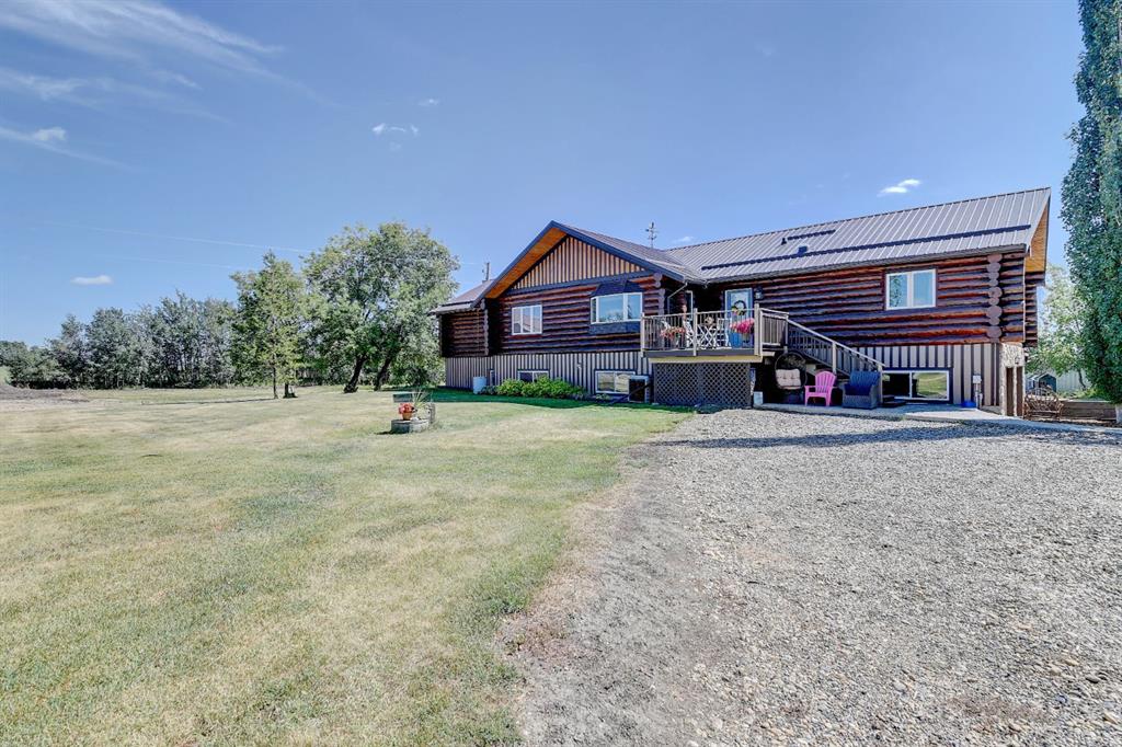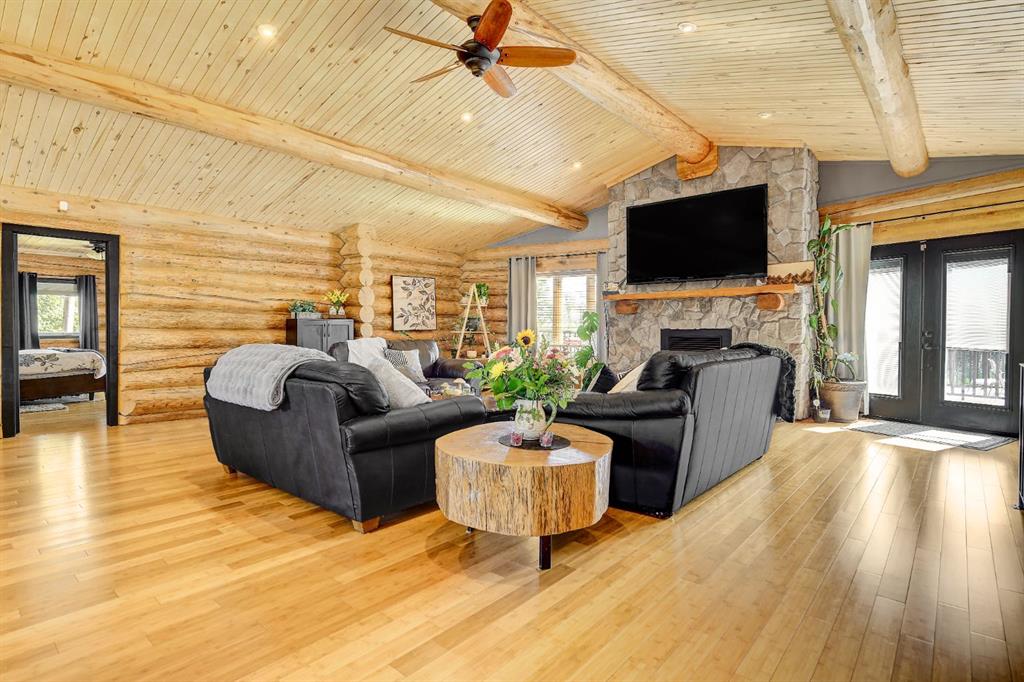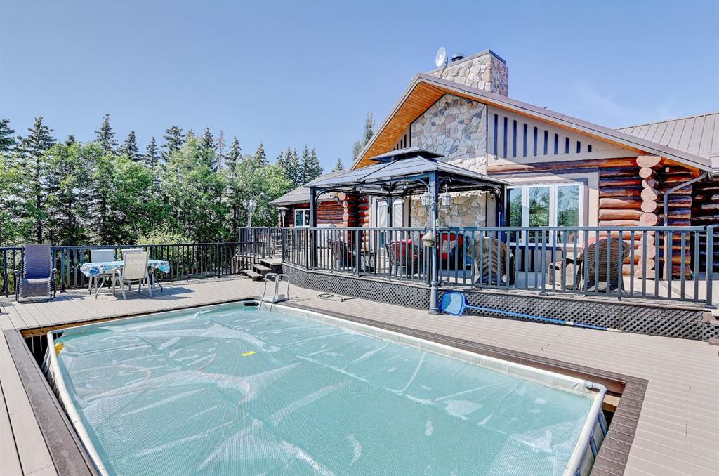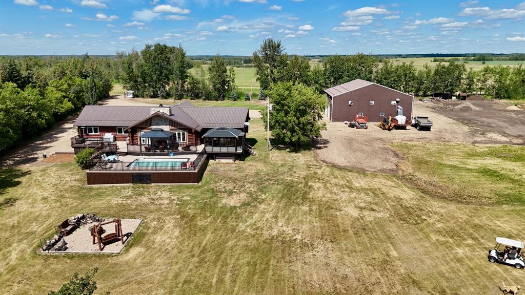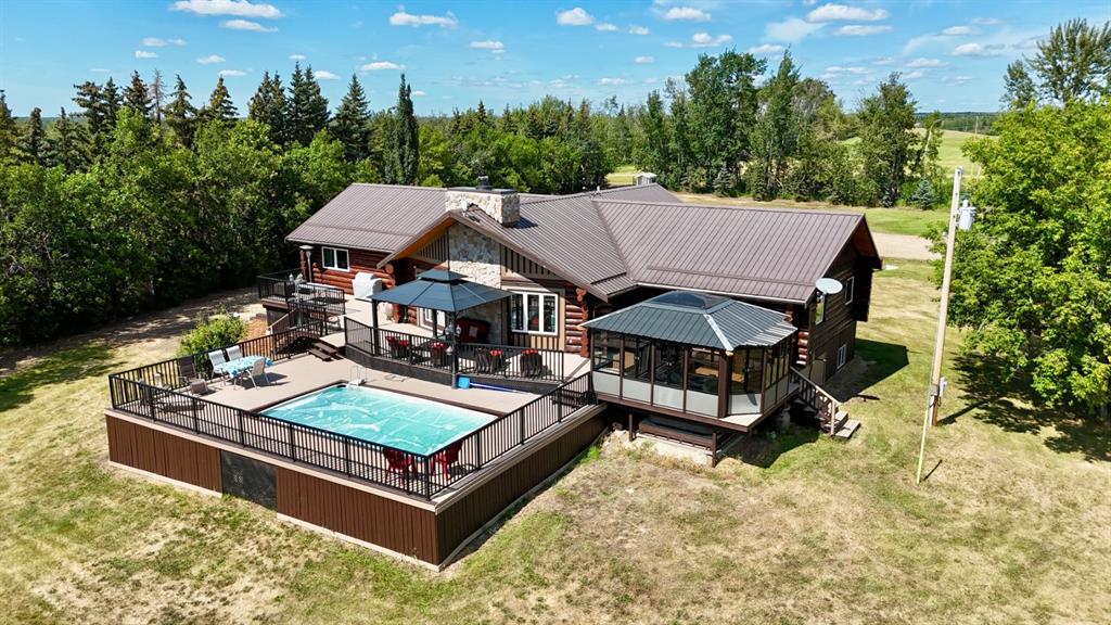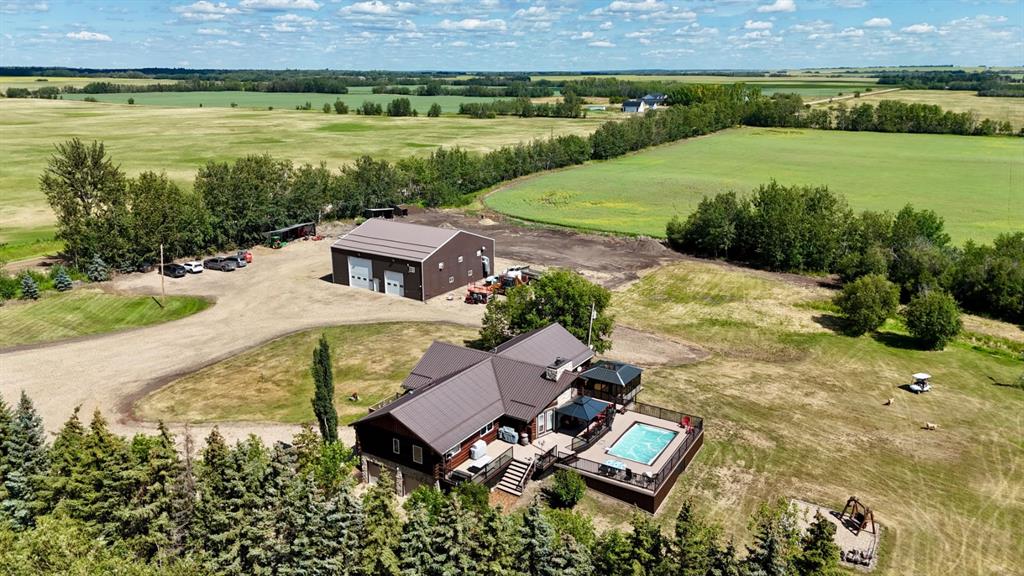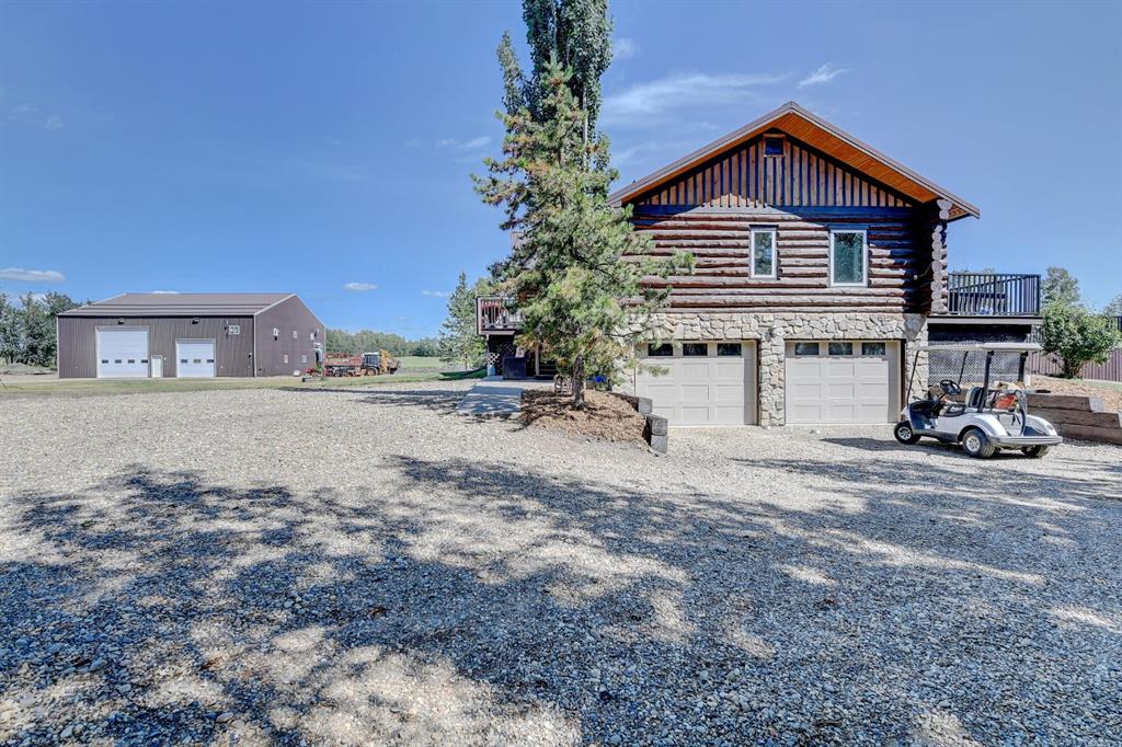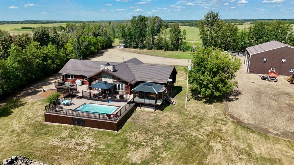 PRIVATE GATED 7-ACRE RETREAT WITH LUXURY LOG HOME AND 60’x60’ HEATED SHOP! Welcome to this extraordinary 7-acre gated and fully fenced estate, showcasing a stunning 2,518 sq ft custom log home built in 2009. This one-of-a-kind property is the perfect blend of rustic elegance and modern comfort, featuring 4 spacious bedrooms, 3 luxurious bathrooms, and a heated 26’ x 28’ attached garage. Step into the open-concept main floor, where you’ll find soaring ceilings, warm bamboo flooring, and a cozy wood-burning fireplace in the expansive living area. The chef’s kitchen is a true highlight with stainless steel appliances, a massive island with quartz counter tops, and ample cabinetry—perfect for entertaining. Enjoy ultimate relaxation in the massive primary suite complete with access to the private deck, pool, and hot tub. The ensuite boasts a steam shower and jetted jacuzzi tub. Three additional bedrooms, a full bathroom with charming clawfoot tub, main floor laundry, and deck access from both the primary and living areas complete the main floor. The fully finished basement features in-floor heating, a large craft room (easily converted back to a 5th bedroom), a gym area, a spacious theatre room, a third full bathroom, and a built-in sauna. Extensive Upgrades Include: • All exterior logs professionally refinished with premium log oil stain • All surrounding decks refinished with high-quality products • New 200,000 BTU boiler • New high-velocity air exchanger • New Boiler Mate hot water system • Central A/C • In-floor basement heat + forced air heating throughout Backyard Oasis: • Above-ground pool with gas heater • Hot tub in enclosed gazebo • 3 natural gas BBQ hookups • Private powered entrance gate Massive 60’ x 60’ Heated Shop: • Fully finished with 11’ x 48’ mezzanine man cave • In-floor heat with insulated floor • Full-length radiant make-up heater • Dual stainless steel sink, shower, RV sewer dump • 50-amp interior & exterior RV plugs • Multiple 20-amp plugs throughout • 220V outlets for welder, air compressor, and pressure washer *. Dug out water source for water all outside areas and trees This exceptional property offers peace, privacy, and high-end amenities rarely found together. Whether you’re seeking a luxurious family retreat or a hobbyist’s paradise, this property delivers it all.