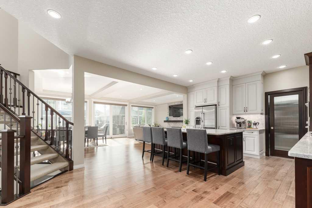 Exceptional custom-built estate by Albi Homes offering 5 bedrooms, 4.5 bathrooms, and over 4,400 sq. ft. of beautifully developed living space, ideally located on a quiet street in Aspen Rose within prestigious Aspen Woods. With 3,055 sq. ft. above grade plus a professionally finished 1,392 sq. ft. basement, this stunning home blends timeless design with everyday functionality and includes A/C for year-round comfort. The main level showcases a sophisticated formal dining room, private home office, functional mudroom, and an inviting living room anchored by a striking travertine stone fireplace. At the heart of the home is a chef-inspired kitchen featuring granite countertops, Legacy cabinetry, premium Bosch appliances, a gas cooktop, built-in wall oven and microwave, a spacious walk-in pantry, and an elegant Carrara herringbone backsplash. Engineered hardwood flooring and rounded wall corners add warmth and architectural character throughout. Upstairs, you’ll find three generously sized bedrooms, each complete with its own walk-in closet and private ensuite, along with the convenience of upper-level laundry. The professionally finished basement by Albi Homes adds exceptional flexibility with two additional bedrooms, a full bathroom, a large recreation room, and ample storage. A triple garage offers abundant space for vehicles and storage. The beautifully landscaped south-backing yard is a true outdoor retreat, designed for both relaxation and entertaining with a great deck, stone patio, and fire pit, all framed by mature trees that provide privacy and a serene setting with all-day sun. Perfectly positioned in one of West Calgary’s most desirable communities, this home offers outstanding access to Aspen Landing Shopping Centre, the West LRT, Stoney Trail, and Bow Trail. Nearby schools include Roberta Bondar School, Ernest Manning High School, Webber Academy, and Rundle College, with Mount Royal University, the University of Calgary, SAIT, and Ambrose University also within easy reach. Some images have been virtually staged.