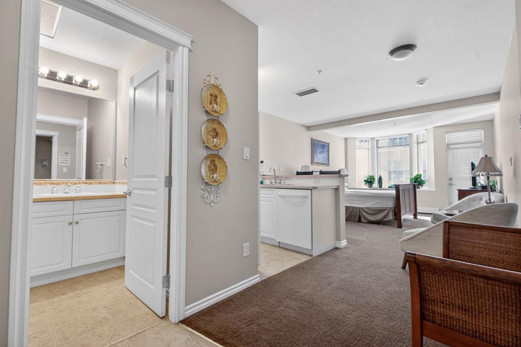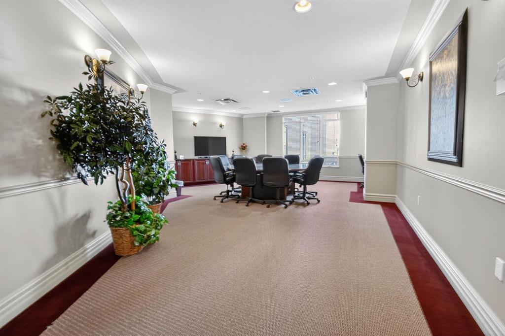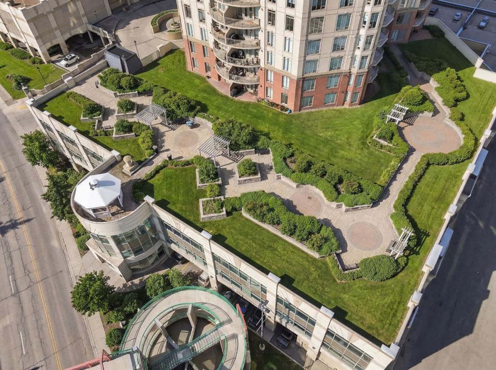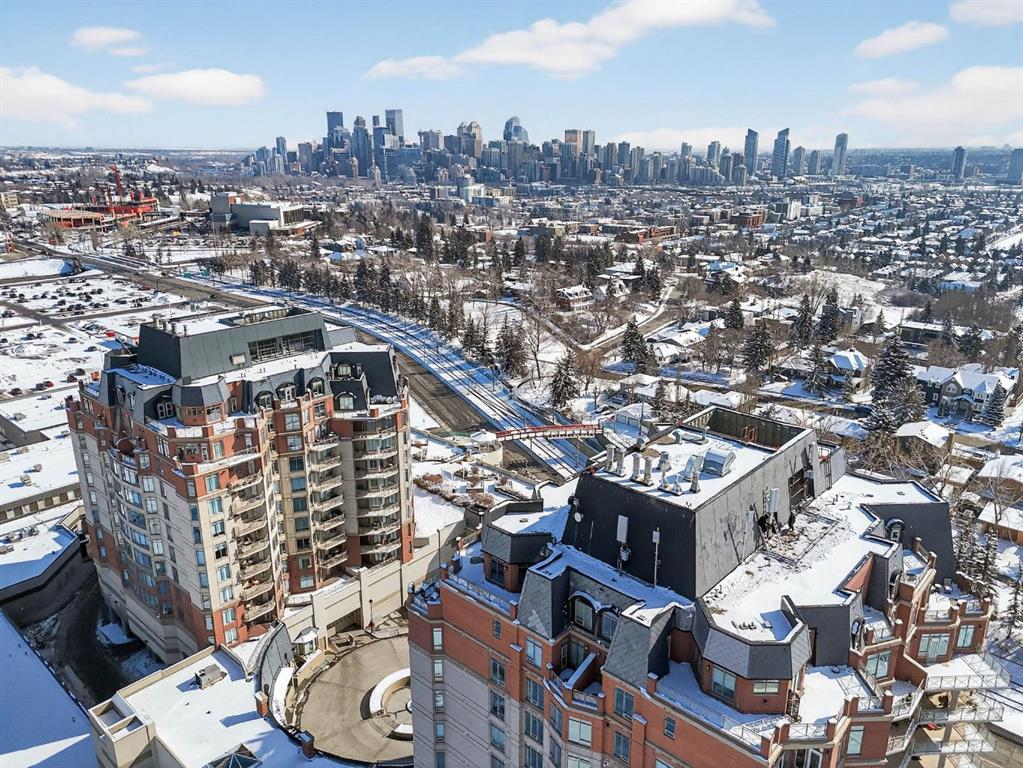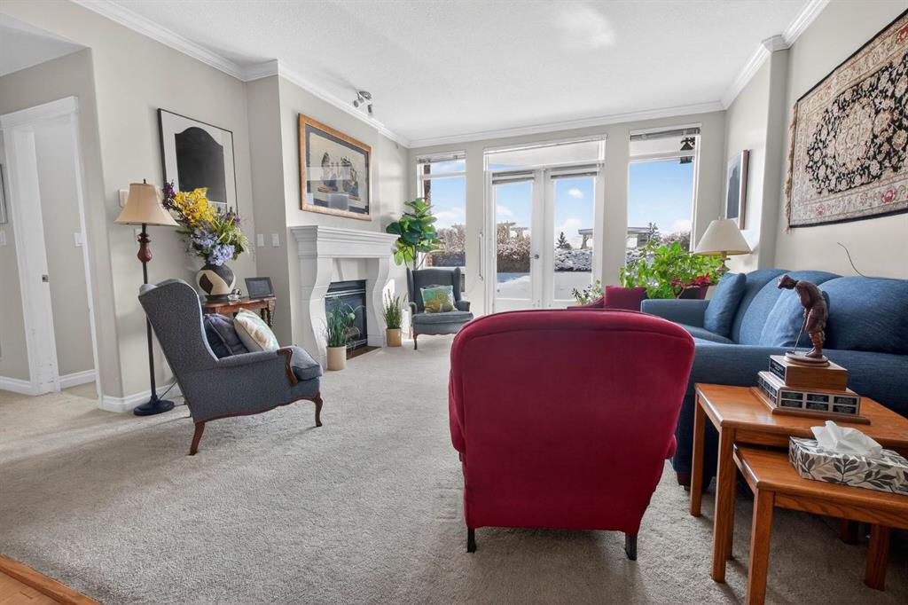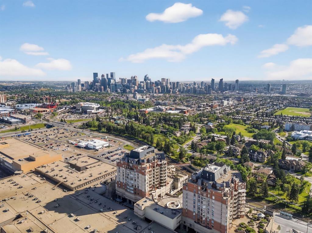 Enjoy this rare unit featuring a combination of greenspace and city views from this spacious ground floor walkout condo in The Renaissance, one of Calgary’s most desirable premier adult living condo buildings with an extensive list of amenities. Offering 1,412 sq.ft., 2 bedrooms, 2 bathrooms, plus a den/office, this bright south-facing unit is filled with tons of natural light through large windows overlooking beautifully landscaped greenspace. Inside, the home features hardwood flooring, freshly shampooed carpet, a spacious open living and dining area, a well-sized kitchen with stainless steel appliances and pantry, in-suite washer and dryer, central air cooling and a cozy gas fireplace. The versatile den is perfect for a home office or computer room. The thoughtful layout provides comfortable everyday living while offering plenty of room to entertain. The spacious primary bedroom features a large walk-in closet, and the same amazing views from the patio can also be enjoyed from the bedroom windows, creating a peaceful backdrop year-round. The 4-piece ensuite includes a standing shower as well as a walk-in jetted Jacuzzi tub. The second bedroom is conveniently located across from the full main bathroom. Step outside through the double French doors to your walkout patio with a natural gas line for your BBQ, where the quiet and peaceful setting feels more like stepping into your own private yard than a condo. Ground floor units with this type of outdoor access are rarely available in the building! Additional highlights include a Vacuflo system, secure titled underground heated parking and a large storage room located on the same level just steps from your front door, another rare and convenient feature. Residents enjoy the outstanding amenities of The Renaissance, including 24/7 concierge and security service, fitness facilities, social and recreation spaces such as the games and hobby room, guest suites, a movie theatre, library, car wash bay, and beautifully maintained common areas inside and outside with gazebos and BBQ areas. The building also offers a garbage chute on each floor, no more wrestling garbage bags going down to the parkade! You also have secure, heated indoor access to North Hill Centre, which includes Safeway, Shoppers Drug Mart, restaurants, medical and dental offices, banks and more, making grocery shopping, dining, and daily errands effortless year-round. Just steps away is the LRT Station, providing quick access to downtown and the rest of the city. The Calgary Public Library, SAIT, and the Jubilee Auditorium are also just minutes away. A rare opportunity to enjoy spacious living, incredible views, and unbeatable inner-city convenience in one of Calgary’s most sought-after condo communities.
