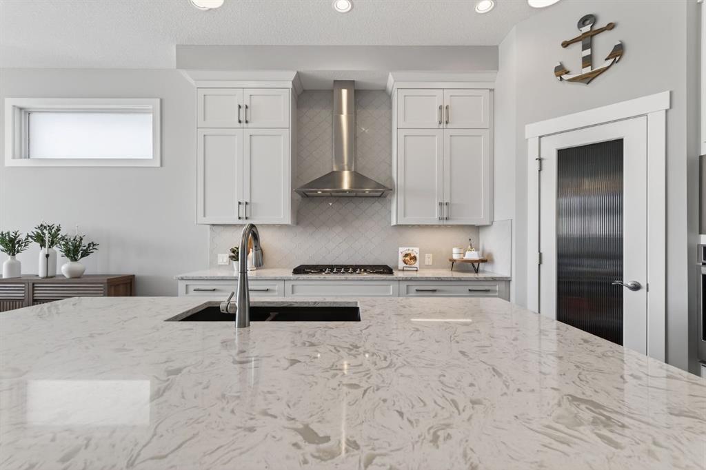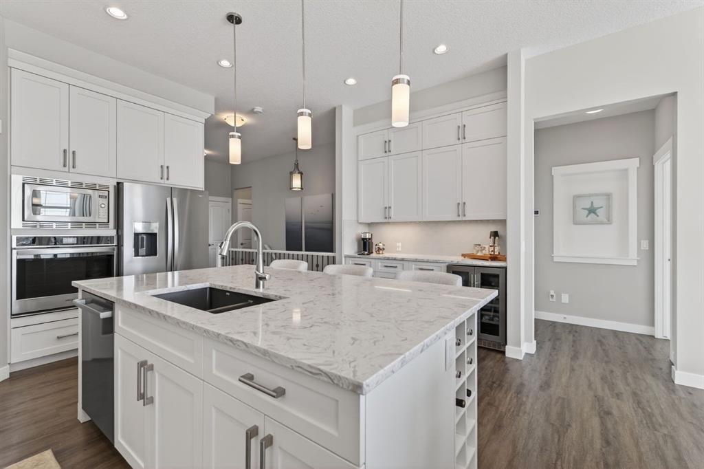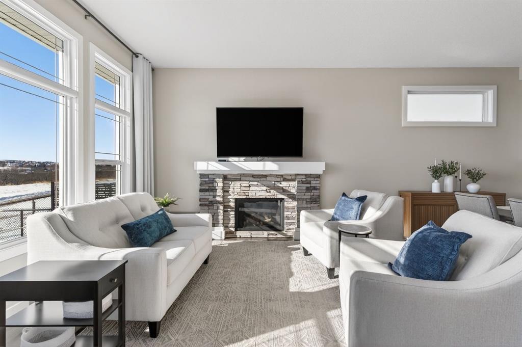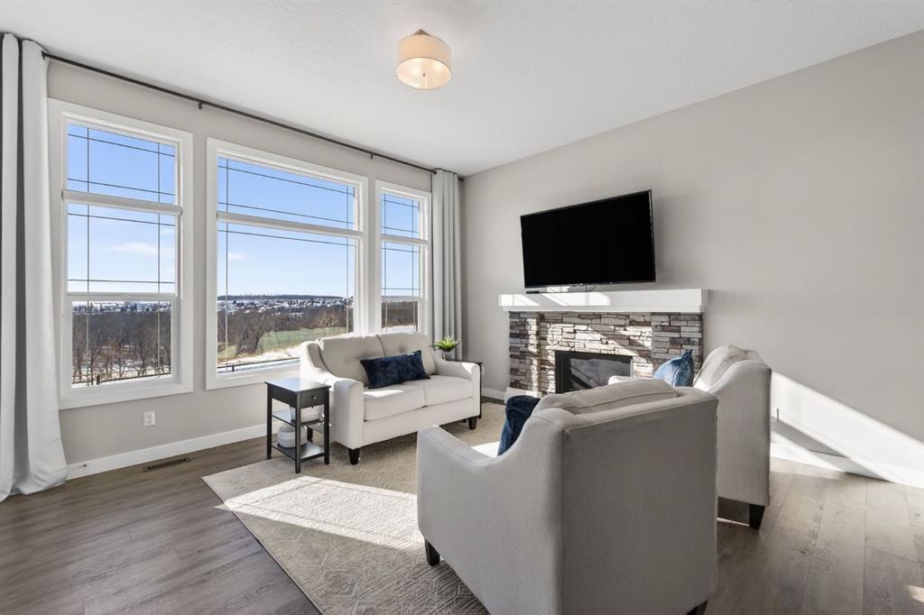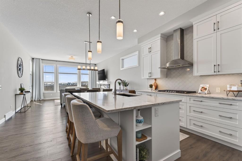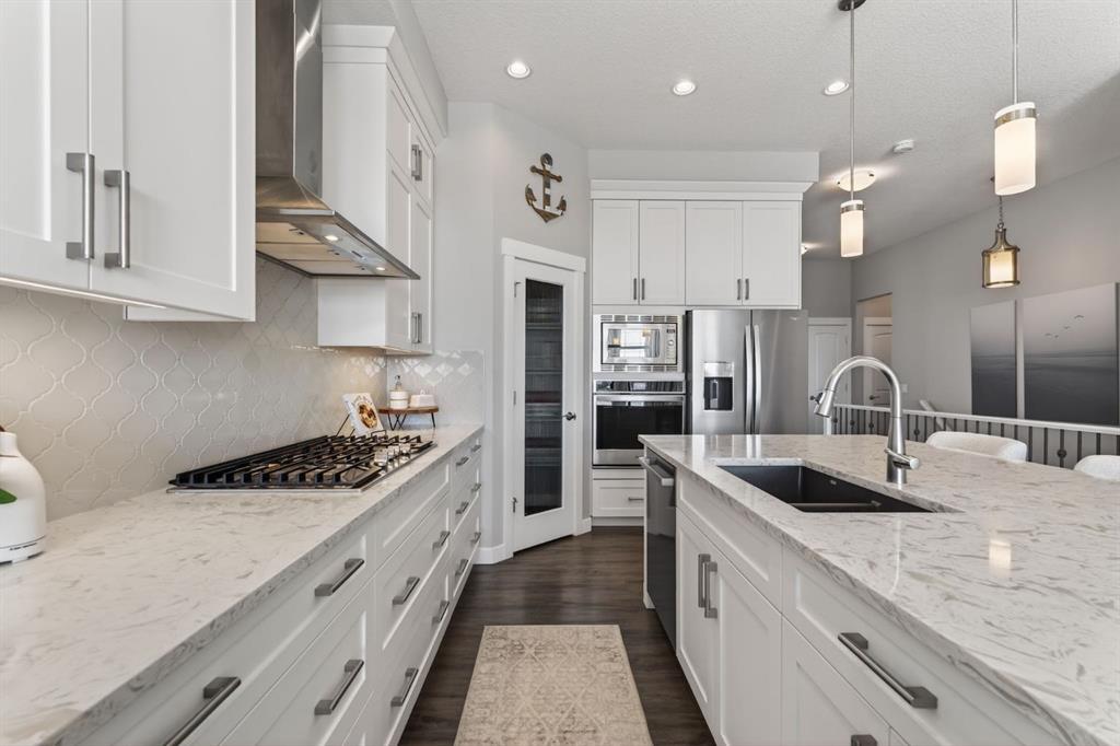 Welcome to this beautifully maintained bungalow located in the desirable community of Mountainview in Okotoks, perfectly positioned on a quiet street and backing onto scenic green space. Offering a rare combination of style, functionality, and breathtaking views, this home is ideal for those seeking both comfort and elevated everyday living. From the moment you arrive, you’ll appreciate the exceptional curb appeal, ample parking, and double attached garage. Inside, the bright and open-concept main floor is designed to impress, featuring large windows that flood the space with natural light and showcase the stunning ridge views behind the home. The heart of the home is the thoughtfully designed kitchen, complete with a large central island, quartz countertops, stainless steel appliances, and a convenient corner pantry. The seamless flow into the separate dining area and spacious living room makes this layout perfect for both entertaining and everyday living. The cozy gas fireplace anchors the living room, creating a warm and inviting atmosphere year-round. The main level also offers the convenience of laundry and a dedicated office—perfect for working from home or creating a quiet, flexible space to suit your needs. The primary bedroom is a true retreat, featuring a generous walk-in closet and a luxurious 5-piece ensuite with dual vanities, a soaking tub, and a separate stand-up shower. Downstairs, the fully developed basement expands your living space with two large recreation areas, ideal for a media room, games area, or home gym. Two additional bedrooms—one with a walk-in closet—and a full 4-piece bathroom provide plenty of room for family or guests. Step outside to the beautifully designed outdoor living space, perfectly positioned to take in the incredible views. Whether you’re hosting summer gatherings or enjoying quiet evenings, this backyard offers the perfect blend of privacy and connection to nature. Located in the sought-after Mountainview community, this home offers easy access to walking paths, parks, schools, and all the amenities Okotoks has to offer—while still providing a peaceful, scenic setting. This is a rare opportunity to own a move-in ready bungalow with a fully developed basement, stunning views, and exceptional indoor-outdoor living.
