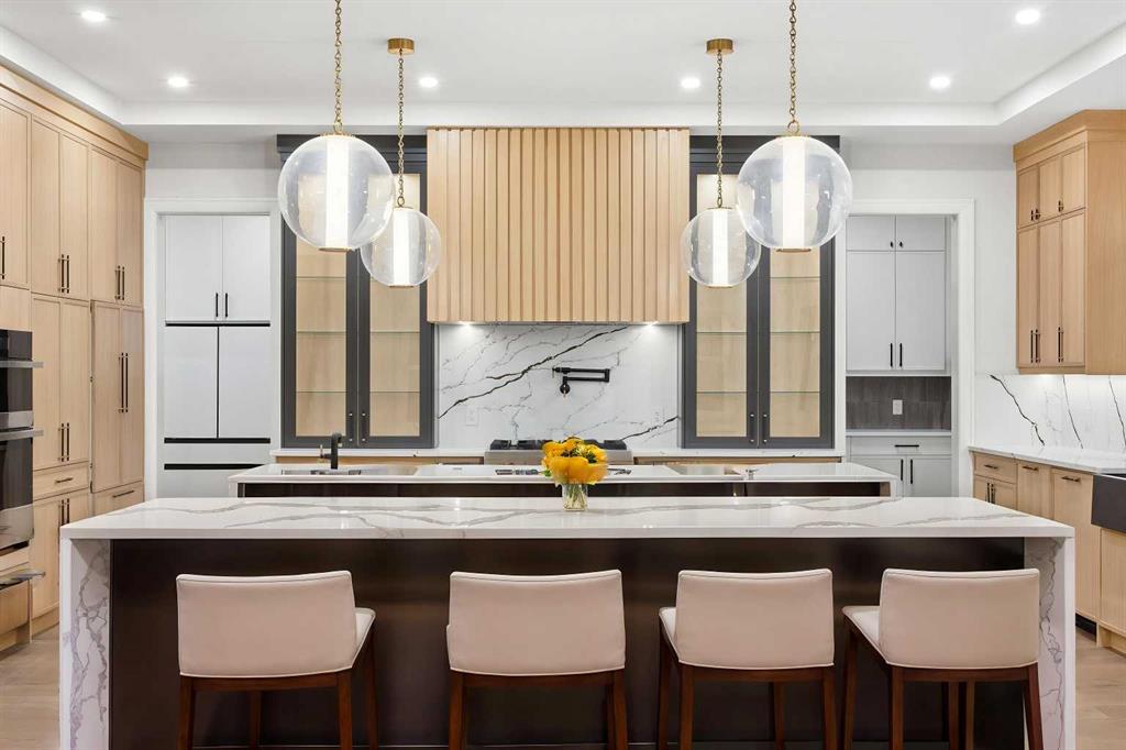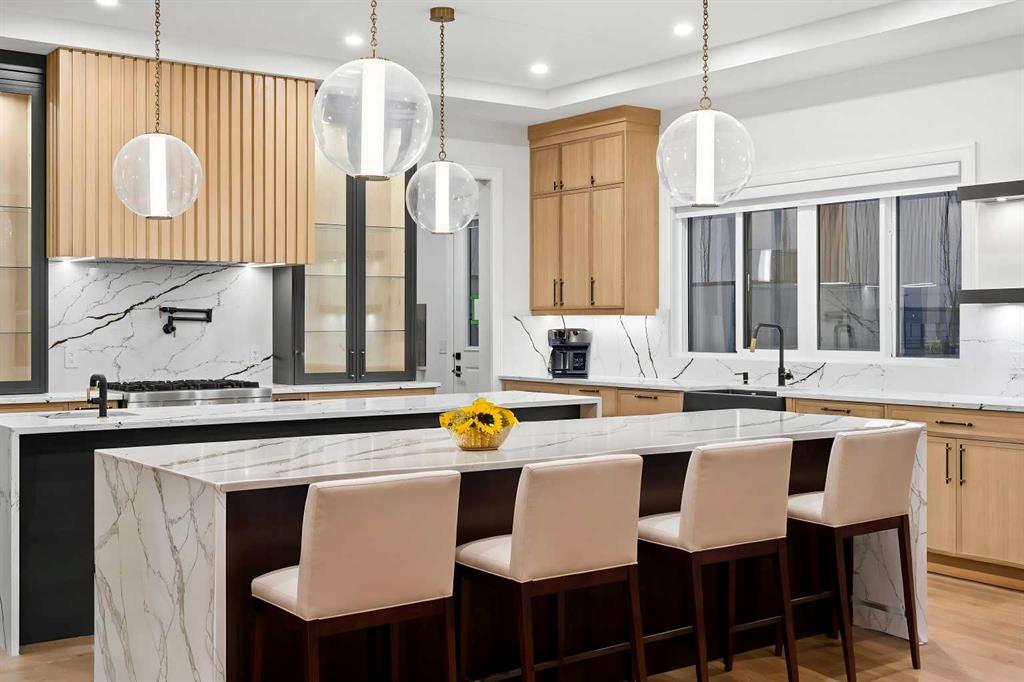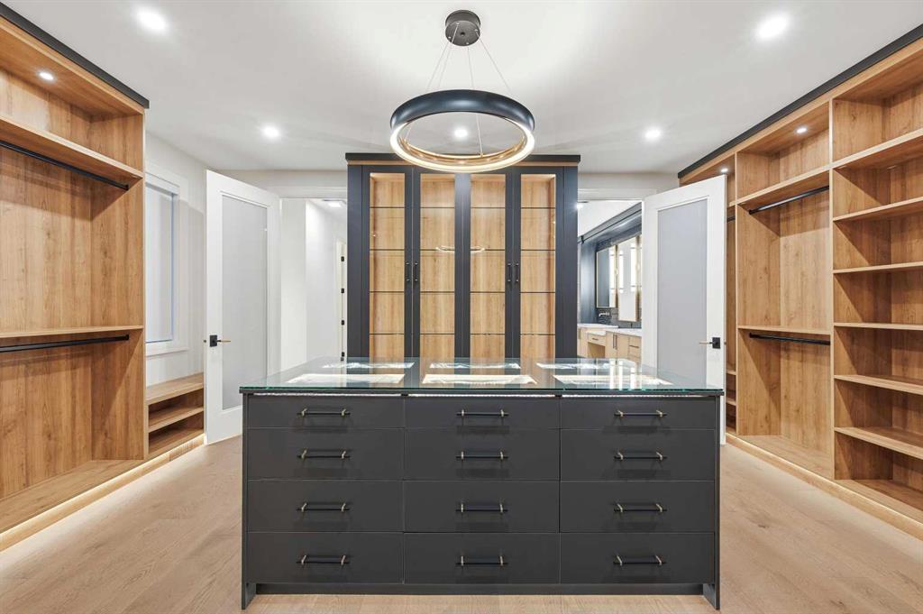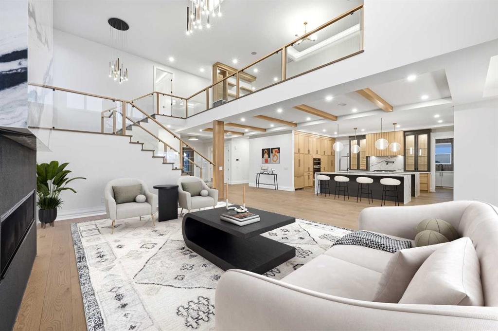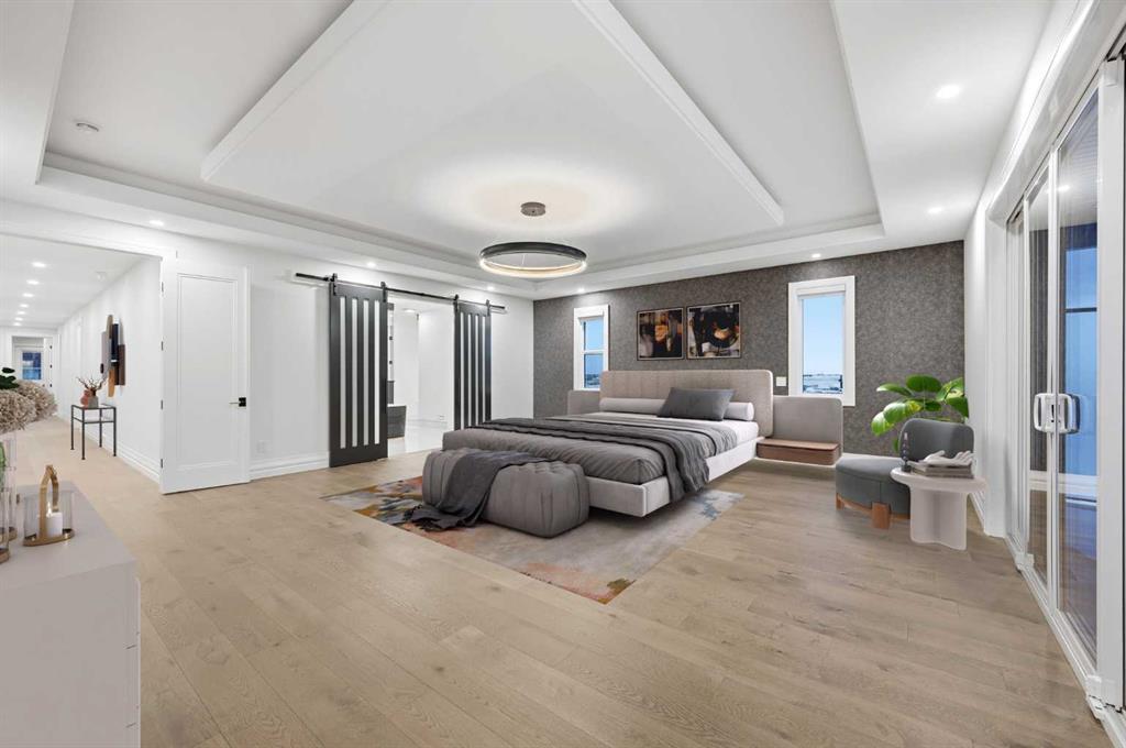 Luxury meets refined functionality in this exceptional custom-built 2-storey residence, ideally situated on one of the largest and most sought-after lots in the community. Offering 5 bedrooms, 5 full bathrooms, and a powder room, this meticulously designed home showcases soaring 10-ft ceilings on the main floor and basement, 9-ft ceilings upstairs, and rich hardwood flooring throughout, creating an elegant and airy ambiance. The chef-inspired kitchen is a true centerpiece, featuring quartz countertops, ceiling-height custom cabinetry, premium built-in appliances, a gas cooktop with pot filler, and an oversized island perfect for entertaining. A fully equipped spice kitchen adds both convenience and sophistication. The open-concept living and family rooms are designed to impress, highlighted by a dramatic open-to-below layout, a sleek natural gas fireplace, tray ceilings with ambient LED lighting, and modern glass railings. The main floor offers a versatile bedroom or private office with a full bath, ideal for guests or multi-generational living, along with a thoughtfully designed mudroom complete with built-in storage. Upstairs, four generously sized bedrooms each offer ensuite access, including a luxurious primary retreat featuring a private balcony, designer feature wall, spa-inspired ensuite, and a custom walk-in closet. A spacious bonus room with wet bar and an upper-level laundry equipped with dual washer and dryer enhance everyday comfort and convenience. The undeveloped basement presents endless possibilities, complete with a separate side entry and bathroom rough-in. Completing this remarkable home is a rare attached 4-car garage with sleek glass doors, professionally landscaped grounds, a concrete patio with gas BBQ line, and premium exterior finishes that elevate the home’s curb appeal.