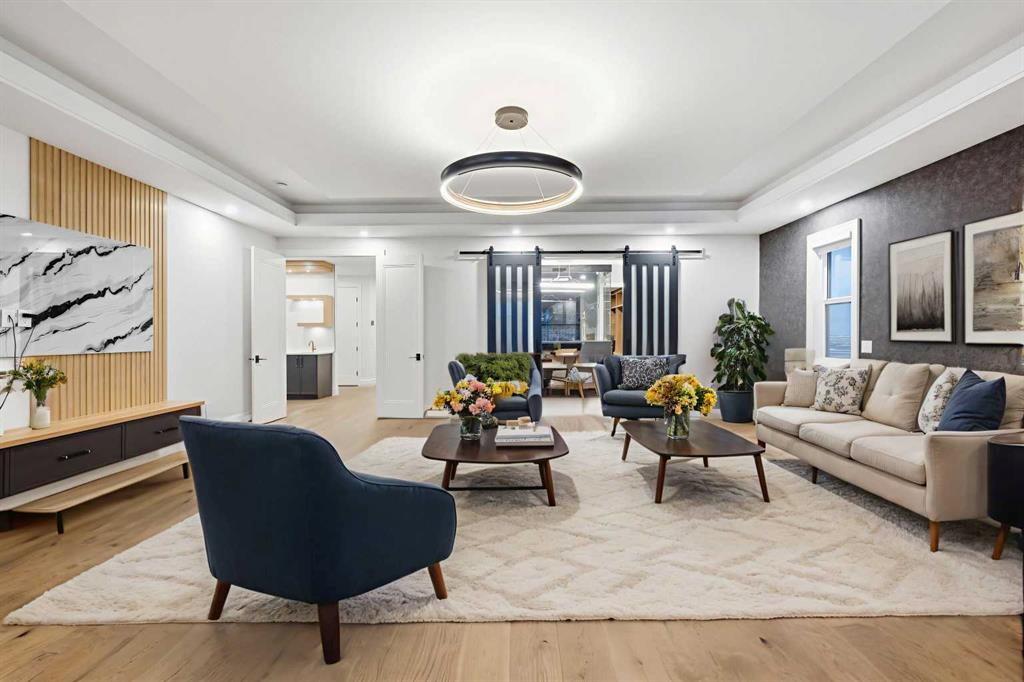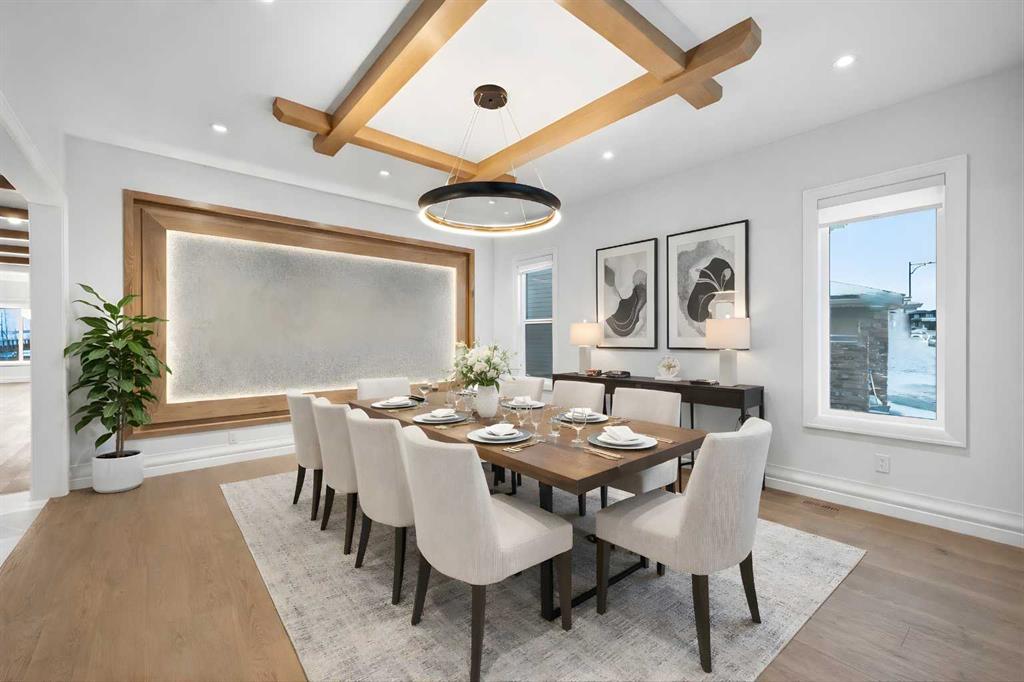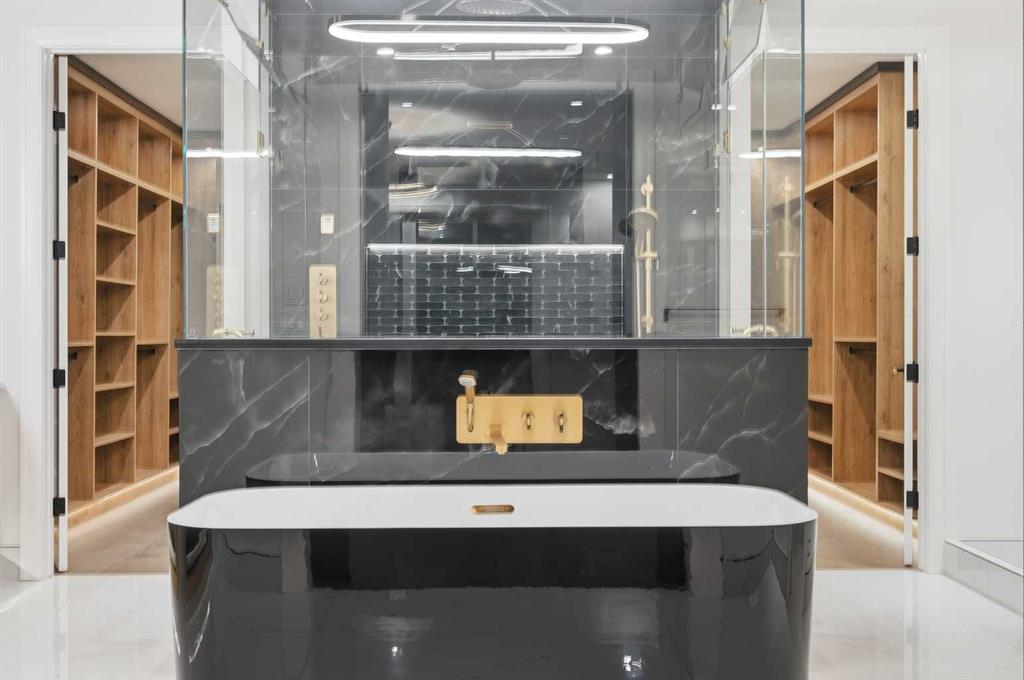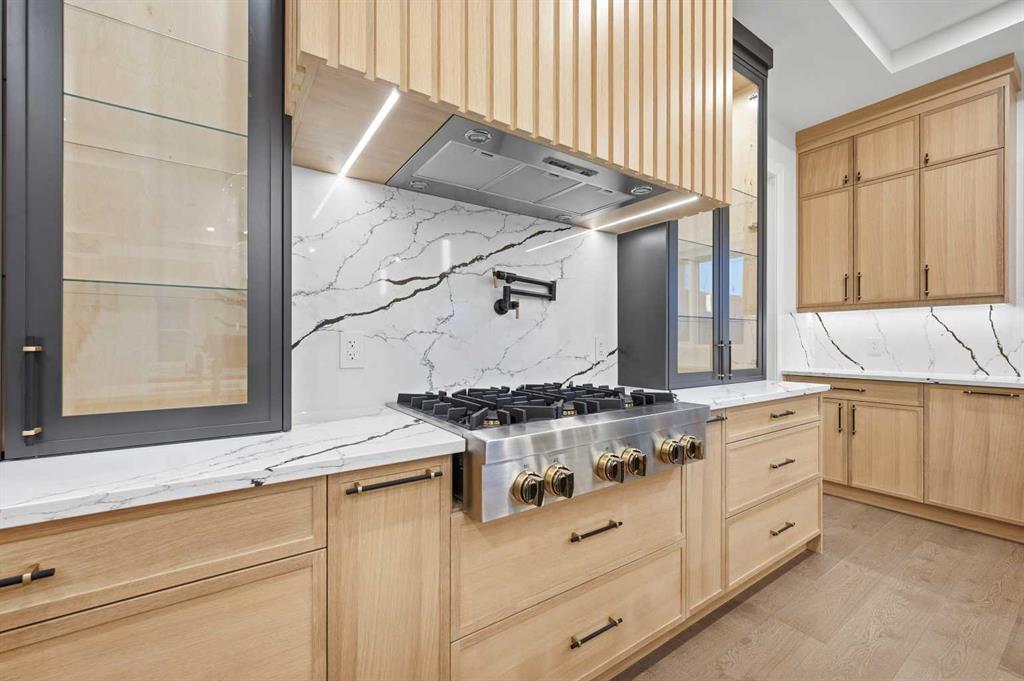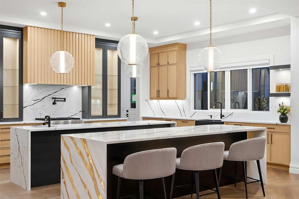 Luxury meets refined functionality in this exceptional custom-built 2-storey residence, ideally situated on one of the largest and most sought-after lots in the community. Offering 5 bedrooms, 5 full bathrooms, and a powder room, this meticulously designed home showcases soaring 10-ft ceilings on the main floor and basement, 9-ft ceilings upstairs, and rich hardwood flooring throughout, creating an elegant and airy ambiance. The chef-inspired kitchen is a true centerpiece, featuring quartz countertops, ceiling-height custom cabinetry, premium built-in appliances, a gas cooktop with pot filler, and an oversized island perfect for entertaining. A fully equipped spice kitchen adds both convenience and sophistication. The open-concept living and family rooms are designed to impress, highlighted by a dramatic open-to-below layout, a sleek natural gas fireplace, tray ceilings with ambient LED lighting, and modern glass railings. The main floor offers a versatile bedroom or private office with a full bath, ideal for guests or multi-generational living, along with a thoughtfully designed mudroom complete with built-in storage. Upstairs, four generously sized bedrooms each offer ensuite access, including a luxurious primary retreat featuring a private balcony, designer feature wall, spa-inspired ensuite, and a custom walk-in closet. A spacious bonus room with wet bar and an upper-level laundry equipped with dual washer and dryer enhance everyday comfort and convenience. The undeveloped basement presents endless possibilities, complete with a separate side entry and bathroom rough-in. Completing this remarkable home is a rare attached 4-car garage with sleek glass doors, professionally landscaped grounds, a concrete patio with gas BBQ line, and premium exterior finishes that elevate the home’s curb appeal.