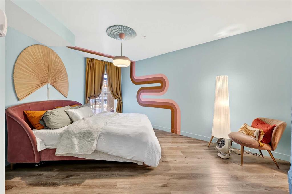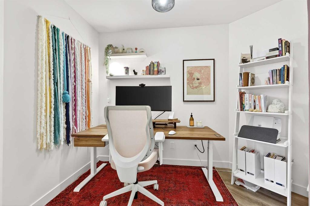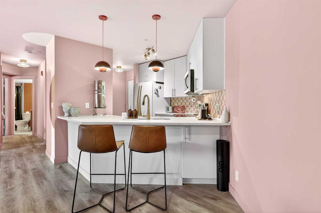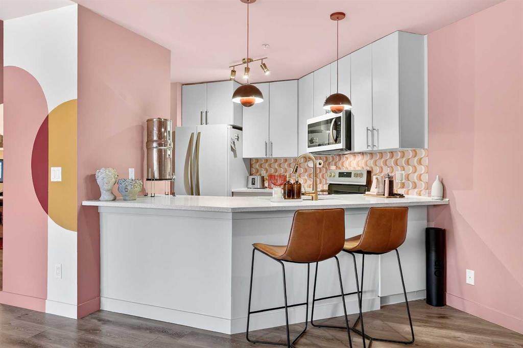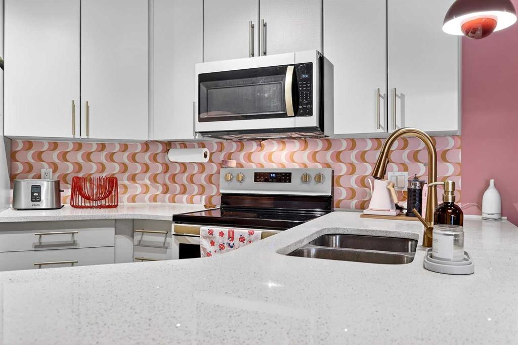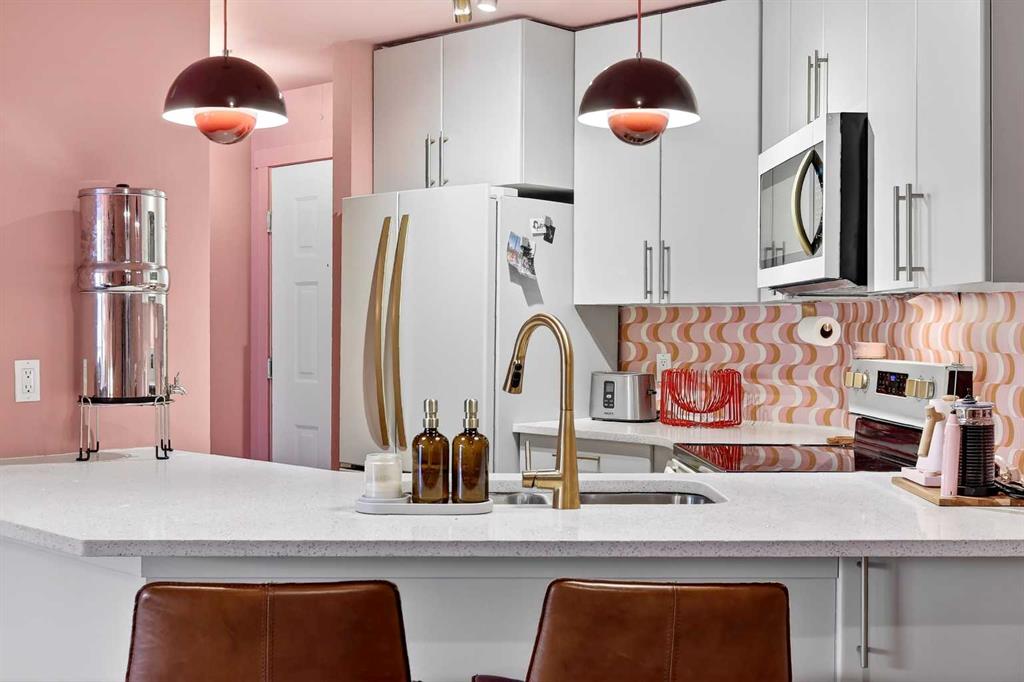 Style meets function in this fully upgraded, one-of-a-kind condo in the heart of Lincoln Park! This bright and beautifully updated 1-bedroom + den unit in Laurel House at the Park is bursting with personality—perfect for someone who loves a home with character. From the custom paint and statement wallpaper to the eye-catching light fixtures, this space delivers serious retro-inspired charm with a modern twist. Step inside to an open-concept layout featuring newer laminate flooring and a stunning, fully renovated kitchen complete with crisp white quartz countertops, updated appliances, and elegant satin brass hardware. Whether you’re hosting friends or enjoying a quiet night in, this space is as functional as it is stylish. The spacious living and dining areas are flooded with natural light, thanks to large patio doors that lead to your private balcony overlooking a peaceful courtyard—your own little escape in the city. Down the hall, a versatile den framed by a custom archway creates the perfect home office, reading nook, or creative studio. The beautifully updated 4-piece bathroom showcases a new vanity, tile work, tub surround, and bold designer wallpaper. The primary bedroom continues the vibe with a custom walk-in closet, retro sliding door, and more curated design touches. Additional features include in-suite laundry, titled underground parking, and storage for ultimate convenience. This well-managed building offers fantastic amenities including a fitness centre, party room, and secure underground parking. Tucked away on a quiet cul-de-sac, you’re just steps from MRU, local favourites, shopping, transit, and major roadways. If you’re looking for a home that stands out from the crowd and reflects your unique style—this is it.