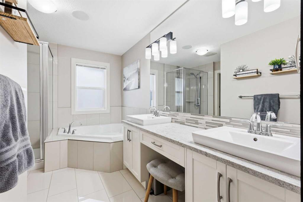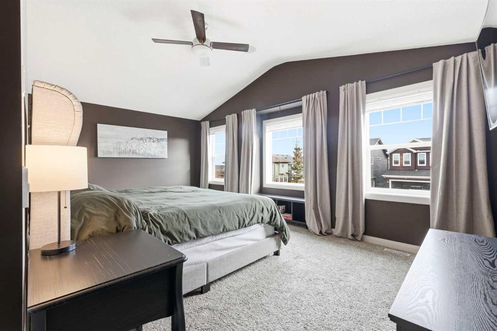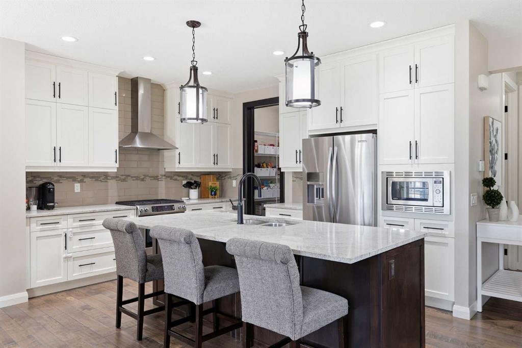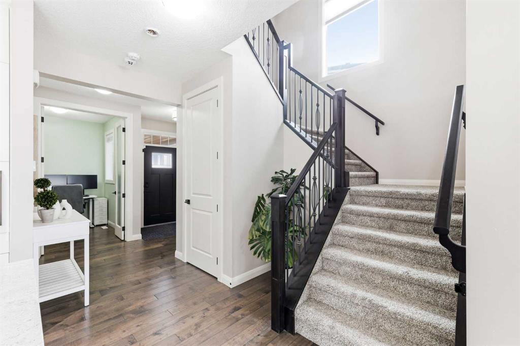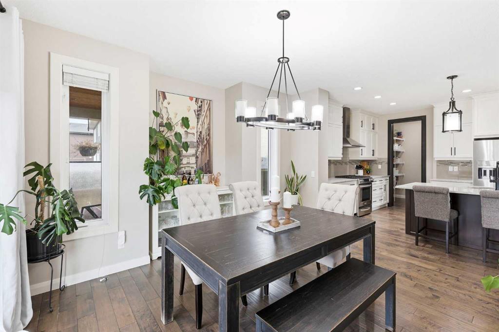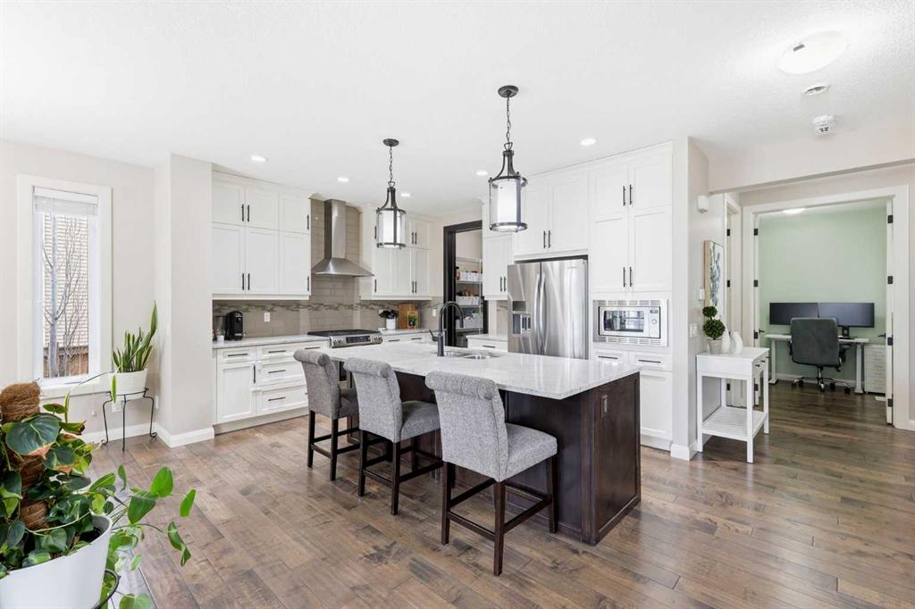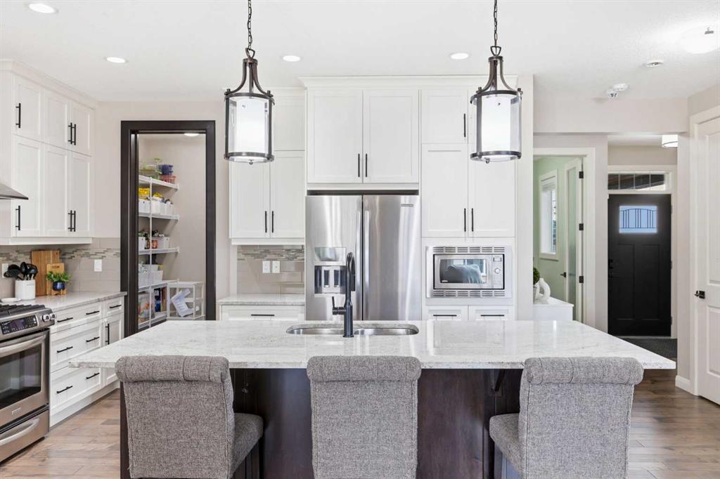 Welcome to 113 Kinniburgh Way, a stunning family home wrapped in premium concrete fibre siding, nestled in Chestermere’s highly desirable Kinniburgh community. Boasting over 2,400 sq. ft. of bright, above-grade living space, the open-concept main floor is elevated by soaring 9ft ceilings and built-in in-home speakers. The layout is designed for both entertaining and everyday life, featuring a dedicated home office, a spacious living and dining area, and a gorgeous kitchen showcasing granite counters and a walk-through pantry. This connects right to the mudroom and the oversized 24' x 22' heated double attached garage, complete with ample storage, and luxury Epoxy flooring, making Alberta winters a breeze. Upstairs, you'll find a massive family room perfect for movie nights, an upper-level laundry room, and three generous bedrooms—including a luxurious primary suite with a large walk-in closet and a spa-like 5-piece ensuite. The fully finished basement adds incredible value with a sprawling 25' x 25' rec room, a private fourth bedroom, and an additional full bath. Outside, your backyard oasis awaits: enjoy summer evenings on the maintenance-free composite covered deck complete with built-in lighting, overlooking a beautifully landscaped yard equipped with a convenient irrigation system and an oversized shed for extra storage. Located just minutes from Chestermere Lake, top-rated schools, and parks, this exceptional 4-bedroom, 3.5-bath home truly has it all, including A/C—schedule your private showing today!