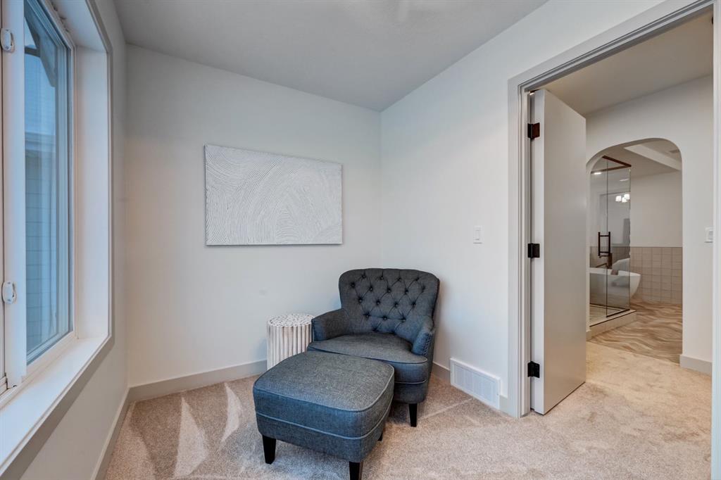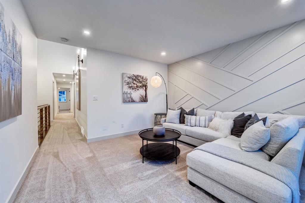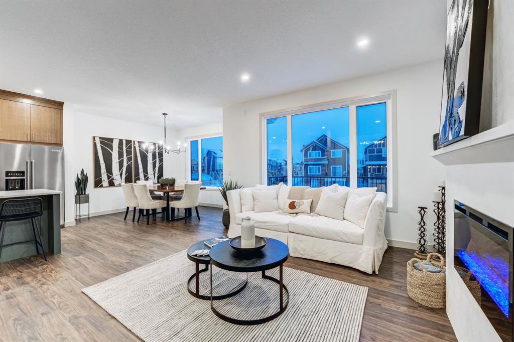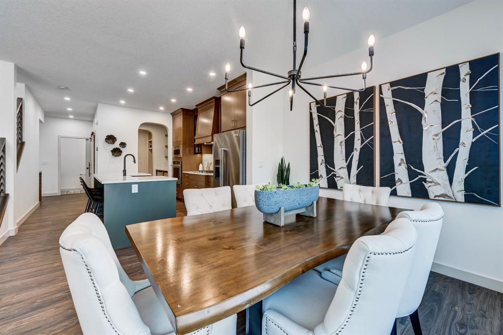 This spectacular walkout showhome by Castellano Custom Homes in the sought after Sunset Ridge community of Cochrane offers the perfect blend of modern luxury and family friendly living. Backing directly onto a peaceful green space with a playground just steps away, this never lived in beauty creates an ideal backyard setting for outdoor relaxation, playtime, and everyday enjoyment. All while providing quick access to walking paths, parks, schools, shopping, dining, and seamless commutes to Calgary and the Rockies. Step inside this stunning two storey walkout home, and be greeted by an inviting foyer featuring elegant built in shelving, neutral tones, and luxury vinyl plank flooring that flows seamlessly throughout. The open concept main floor is designed for effortless entertaining and family life, highlighted by a gourmet kitchen with a massive island boasting waterfall edge quartz countertops, premium custom cabinetry, high end KitchenAid appliances (including gas range and spacious fridge), a deep farmhouse sink, and stylish arched transitions that frame the adjacent dining and living areas. The living space impresses with soaring ceilings, a custom fireplace with dramatic surround and mantel, chic modern chandelier, and large sliding doors opening to the backyard green space. Perfect for seamless indoor outdoor enjoyment and family gatherings. A versatile den/flex room, and practical mudroom add everyday convenience. Upstairs, retreat to a generous primary suite complete with a luxurious 5-piece ensuite (featuring a freestanding soaker tub, frameless glass shower, dual vanity, and herringbone tile accents), plus an expansive walk-in closet with fully customized white cabinetry, shelving, drawers, and organizers. Which cleverly opens to your own private hidden room tucked behind the shelves looking out onto a beautiful green space. The spacious bonus/family room is a real stunner with vaulted ceilings, tons of light flooding in from the windows and skylights, and a striking geometric board and batten accent wall ideal for media nights, or relaxation. In addition there are 2 additional large sized bedrooms and laundry room conveniently located upstairs for ultimate family ease. This showhome at 128 Sunrise Heath is more than a display it’s inspiration for your dream home. Visit today to tour this exceptional Castellano Custom build, speak with the team about customizing your own residence in Sunset Ridge (including walkout options), and discover why families choose Castellano for quality, personalization, and lifelong value.