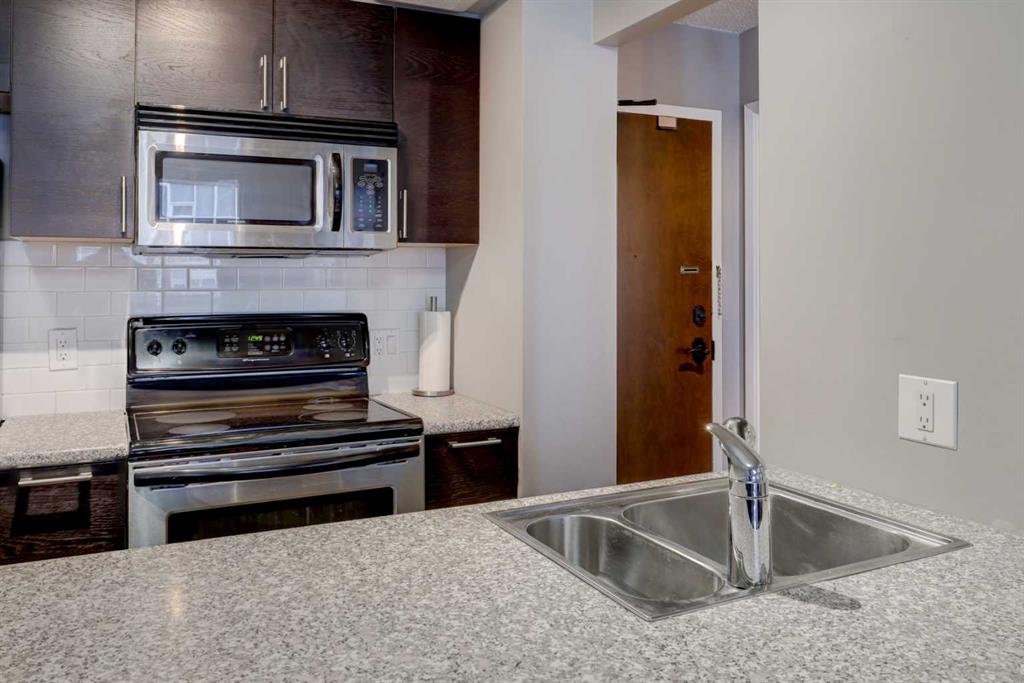 WELCOME HOME to this quiet, and meticulously maintained apartment condo in Calgary’s premier riverside community of Eau Claire! Perfect for a single professional, couple working downtown, weekend retreat, or investment property, this unit offers both comfort and convenience in an unbeatable location. Thoughtfully updated in 2013, renovations include rich walnut cabinetry in the kitchen and bathroom, stainless steel appliances, new backsplash and countertops, updated lighting and switches, fresh paint, door trim, baseboards, and elegant tile flooring throughout. A functional breakfast bar seamlessly connects the kitchen to the spacious living room—ideal for everyday living and entertaining. The generously sized primary bedroom features ample closet space, while the versatile storage/den area offers potential for conversion to in-suite laundry. Step outside to your tiled balcony—perfect for relaxing or summer barbecues. This unit includes a titled underground parking stall and low monthly condo fees of $541, covering all utilities and access to exceptional amenities: a fully equipped fitness centre, sauna, bicycle storage, common laundry, concierge service (Mon–Fri, 8 AM–11 PM), and weekend security. Enjoy the added convenience of an on-site store, wellness centre, and restaurant, all just steps from the Bow River pathways, downtown offices, shopping, dining, and public transit. Don’t miss your chance to own in one of Calgary’s most desirable downtown communities! Be sure to check out the VIRTUAL TOUR link for hi-tech interactive floor plans, hi-def photos, and state of the art virtual tours where you can take a "walk" throughout the rooms of the property.