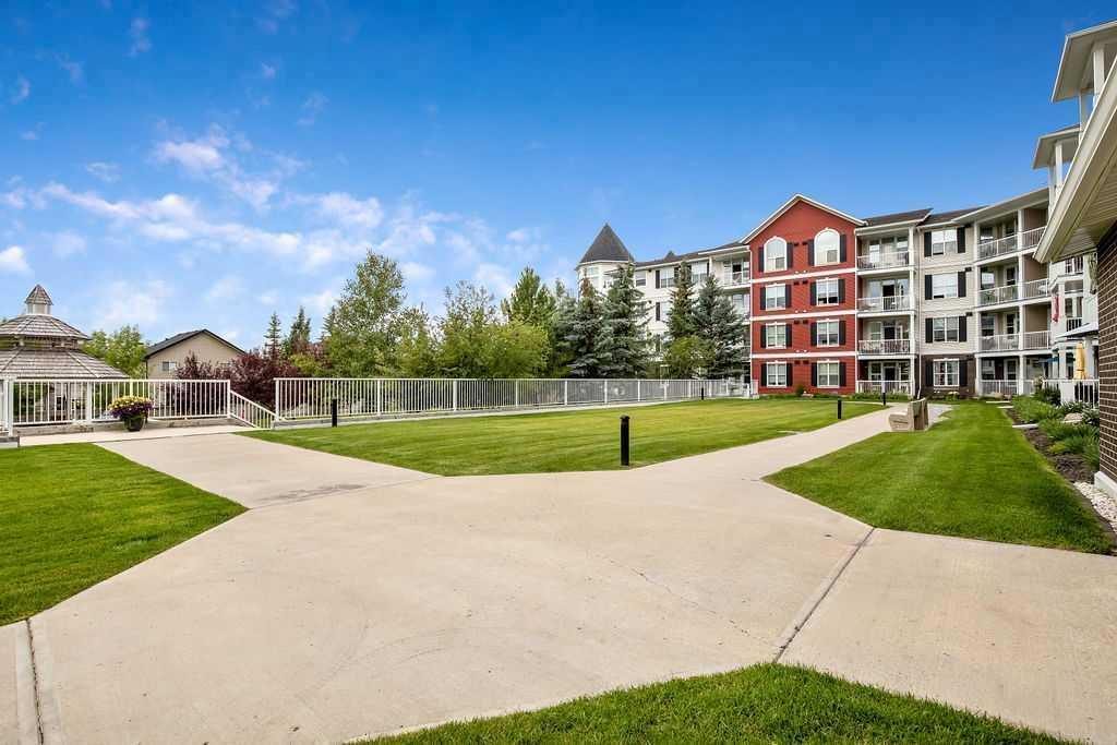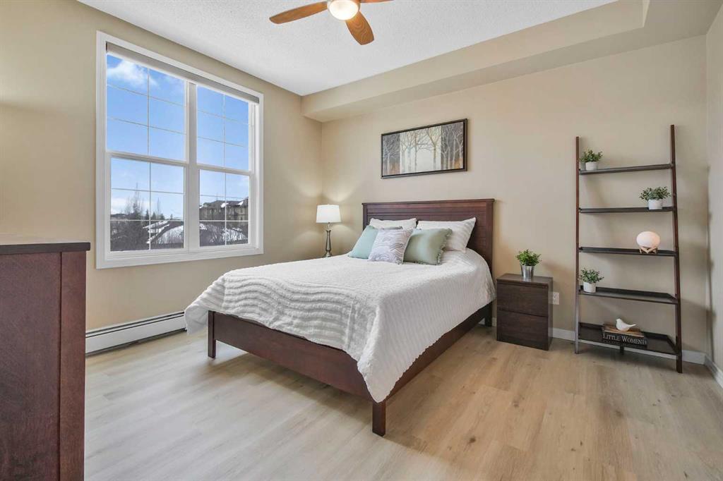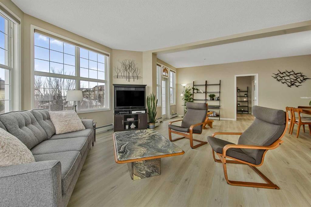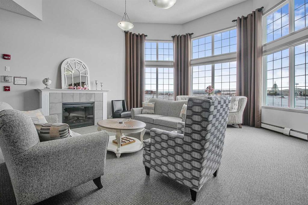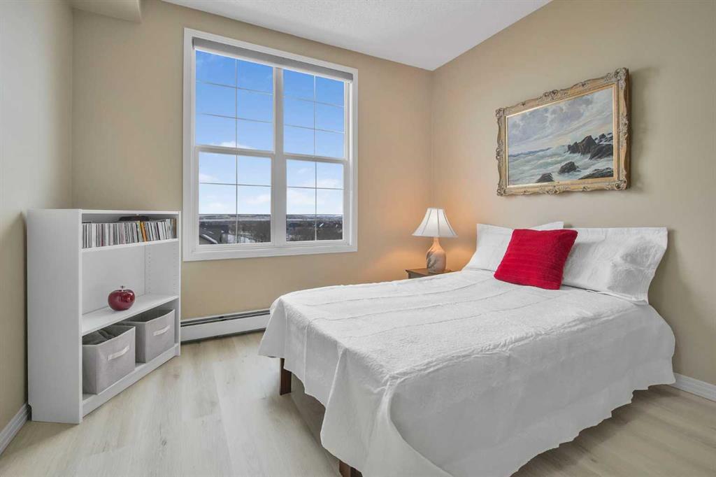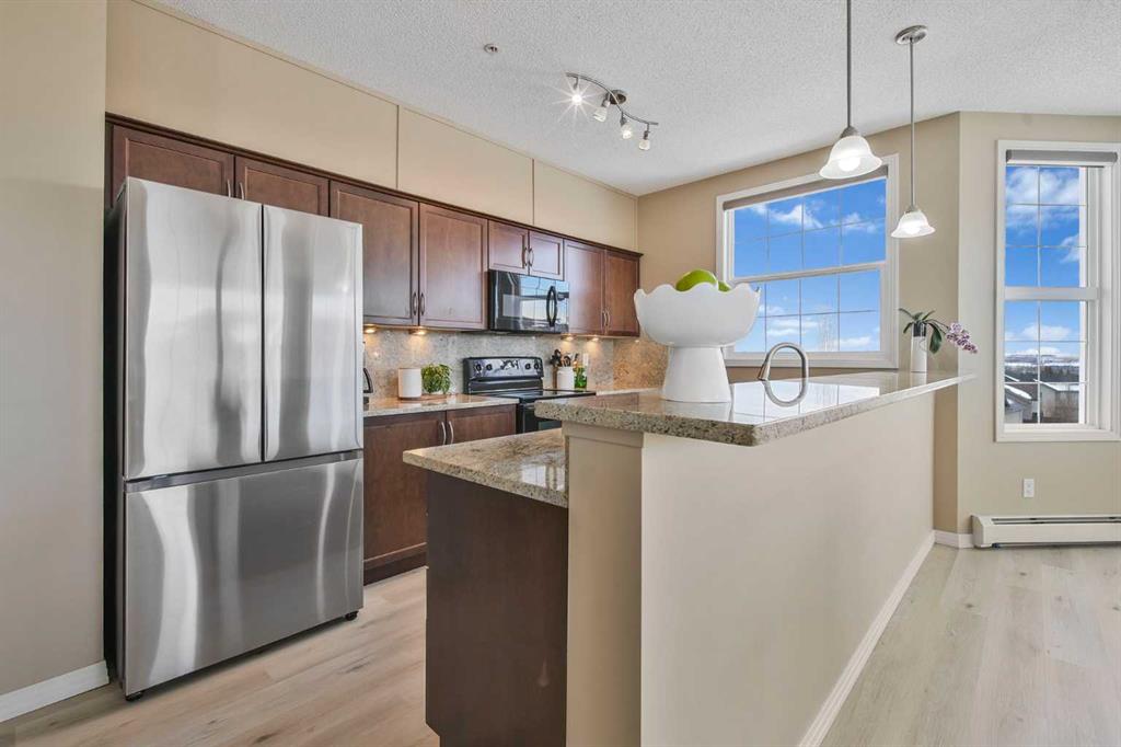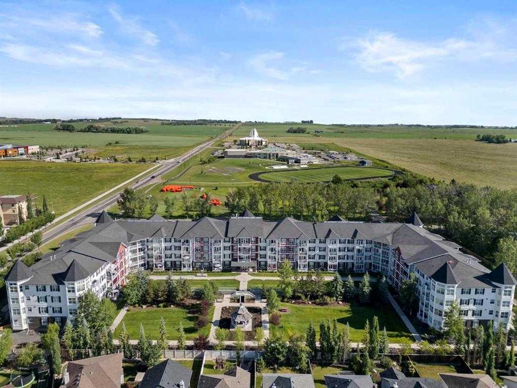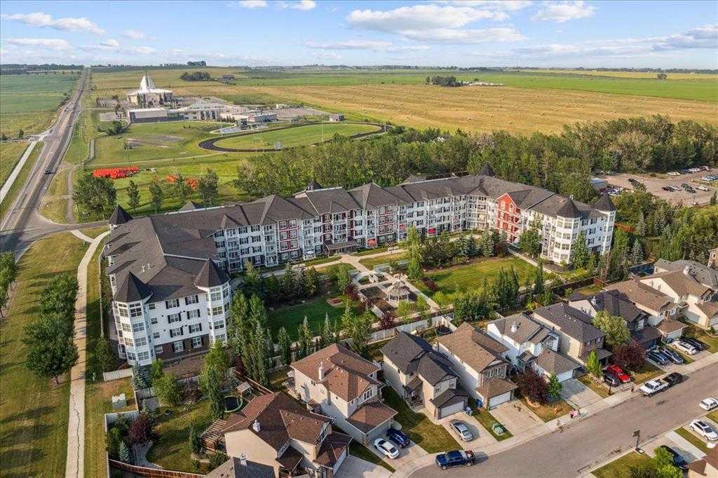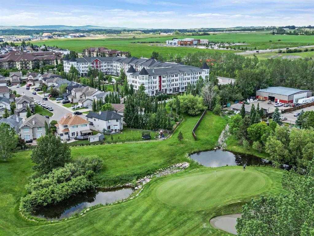 OPEN HOUSE SATURDAY APRIL 4TH 2-4 PM - VIEWS, VIEWS & MORE VIEWS! The wow factor this home presents the moment you walk through the door is undeniable. Expansive windows draw your eye immediately to sweeping town and valley views stretching toward the mountains while filling the home with natural light, creating a space that feels both elevated and incredibly inviting. Offering OVER 1,200 sq ft, this beautifully maintained 2 bedroom, 2 bathroom residence combines spacious design with LOCK & LEAVE CONVENIENCE. Thoughtfully updated with luxury vinyl plank flooring, granite countertops and backsplash, PREMIUM REMOTE HUNTER DOUGLAS BLINDS worth over $12,000, and a new oversized Samsung refrigerator. The open layout supports both comfortable everyday living and effortless entertaining. The generous living and dining area feels more like a bungalow than a typical condominium. The living space extends effortlessly onto the private balcony, enhanced by a custom retractable sliding screen doors allowing seamless indoor outdoor living. The kitchen sits at the heart of the home with ample cabinetry, functional workspace and a seamless connection to the main living area, allowing you to remain part of the conversation while preparing meals or hosting guests. The primary suite is a true retreat with walk in closet and private ensuite, while the second bedroom offers flexibility for guests, a home office or hobby space. Located in the highly sought after Penncross complex in Crystal Green, residents enjoy a quiet, exceptionally well managed building distinguished by its unique architectural design, with charming rooflines, varied elevations and a courtyard centered layout creating visual character and a true sense of community. Amenities include themed common areas on each floor, a well equipped fitness room, beautifully maintained courtyard with outdoor BBQ area, TWO TITLED HEATED UNDERGROUND PARKING STALLS, assigned storage and elevator access. Just steps from Crystal Ridge Golf Course and with YEAR-ROUND LAKE PRIVILEGES at Crystal Shores Lake including swimming, skating and recreation, this location offers an exceptional lifestyle balance of recreation, tranquility and convenience. Whether downsizing, relocating or simply seeking a brighter place to call home, this standout property represents one of the most desirable condo opportunities currently available in Okotoks. AND YES… THE VIEWS REALLY ARE THAT GOOD.