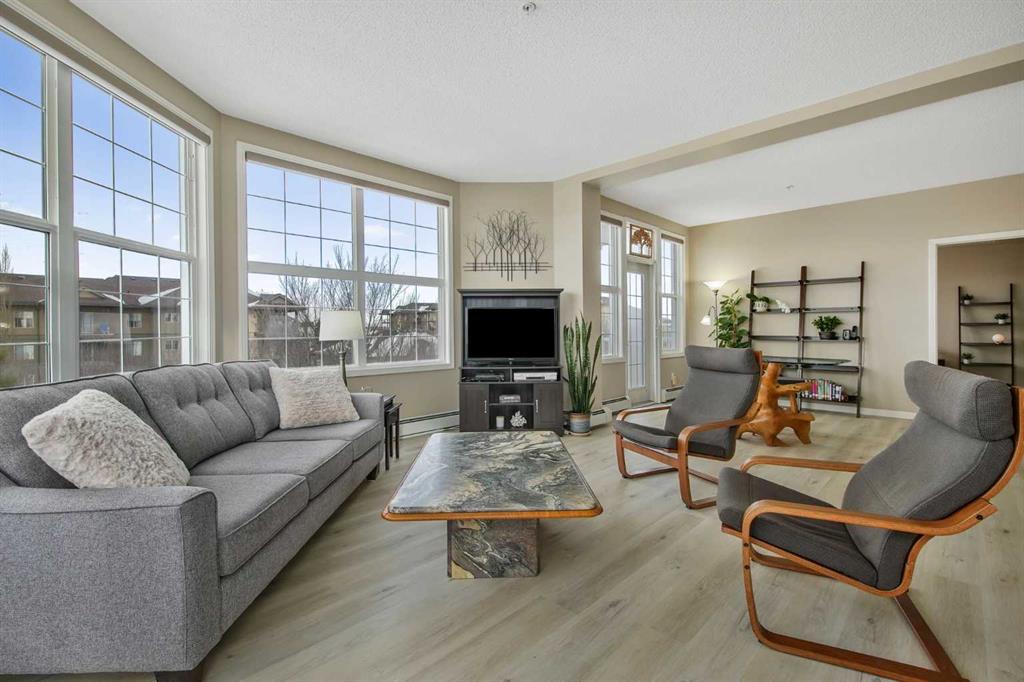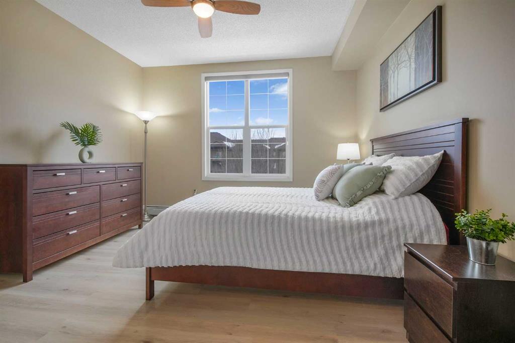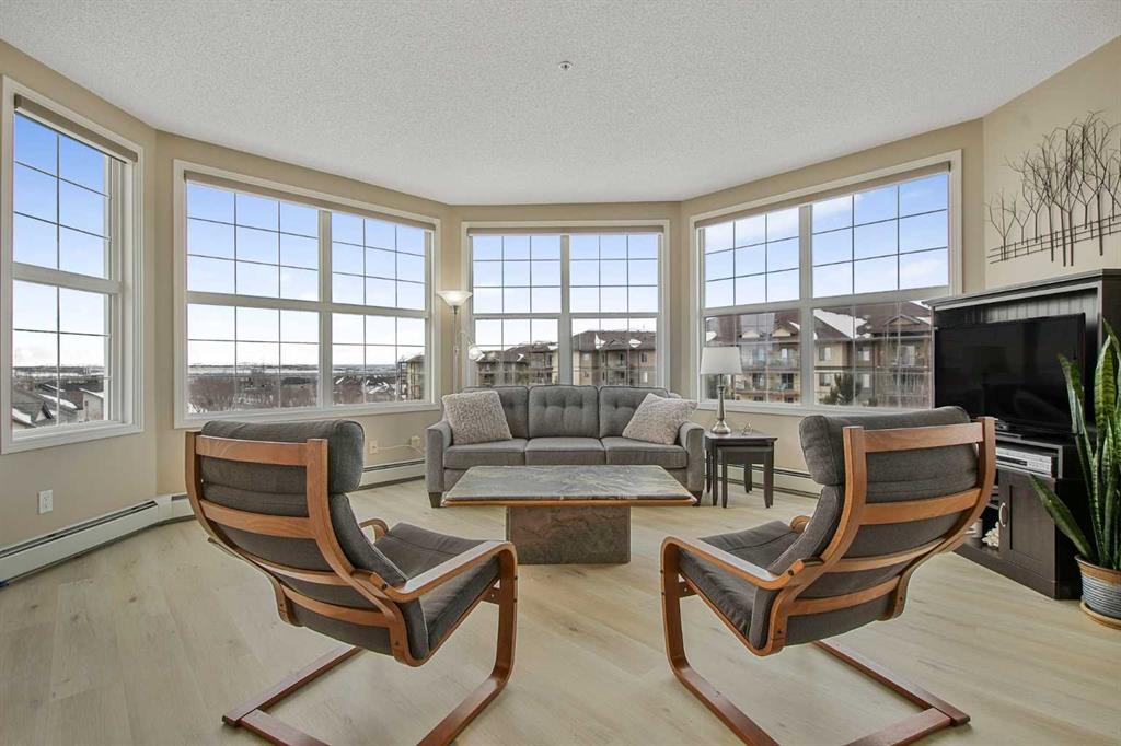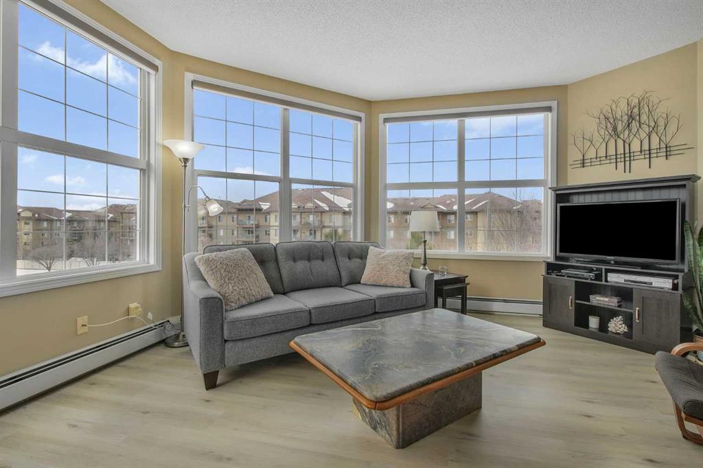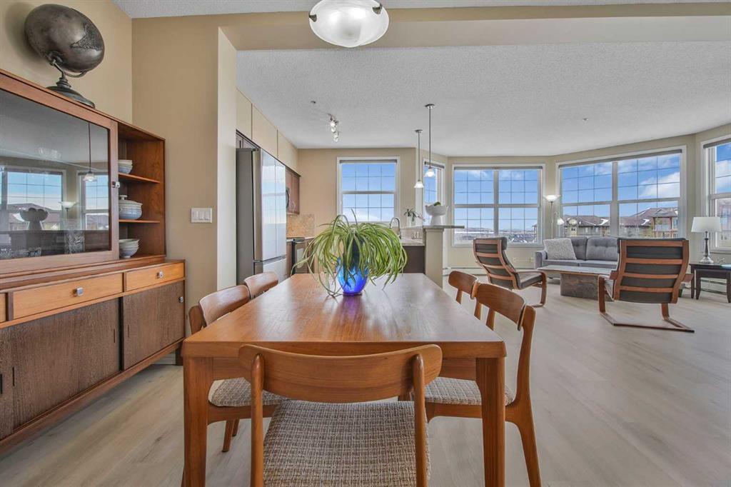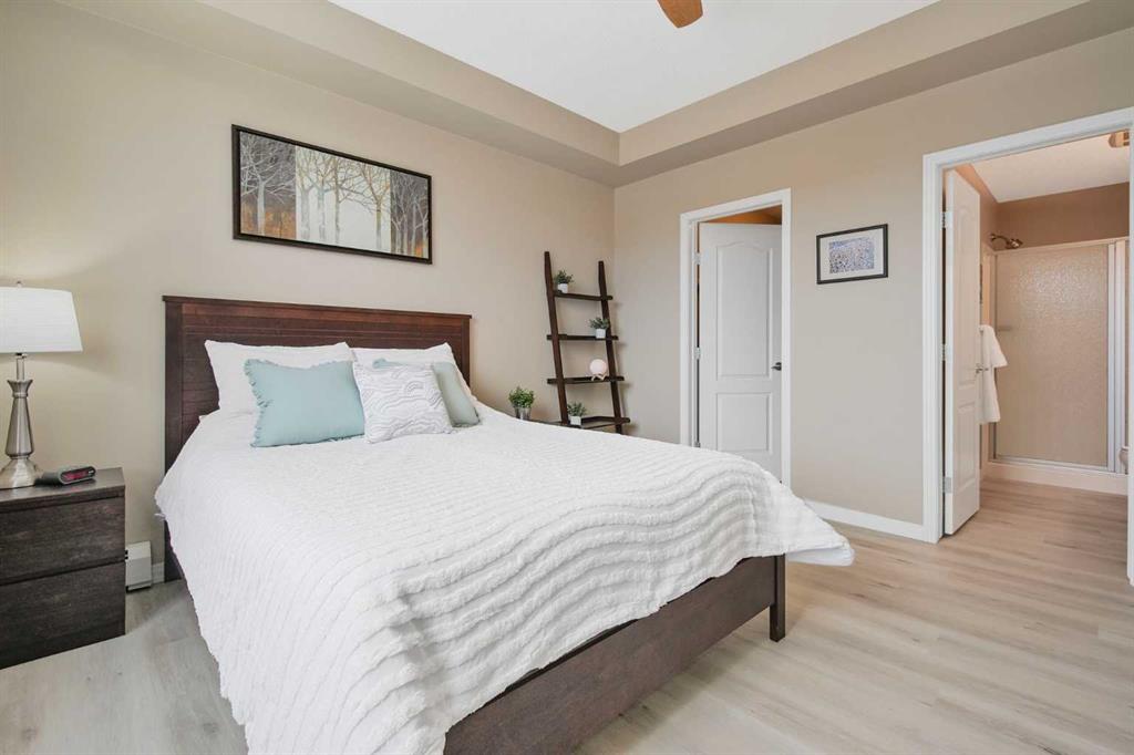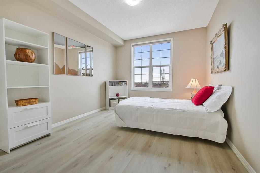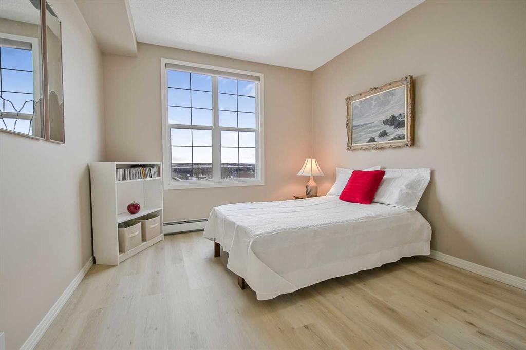 OPEN HOUSE SATURDAY APRIL 4TH 2-4 PM - VIEWS, VIEWS & MORE VIEWS! The wow factor this home presents the moment you walk through the door is undeniable. Expansive windows draw your eye immediately to sweeping town and valley views stretching toward the mountains while filling the home with natural light, creating a space that feels both elevated and incredibly inviting. Offering OVER 1,200 sq ft, this beautifully maintained 2 bedroom, 2 bathroom residence combines spacious design with LOCK & LEAVE CONVENIENCE. Thoughtfully updated with luxury vinyl plank flooring, granite countertops and backsplash, PREMIUM REMOTE HUNTER DOUGLAS BLINDS worth over $12,000, and a new oversized Samsung refrigerator. The open layout supports both comfortable everyday living and effortless entertaining. The generous living and dining area feels more like a bungalow than a typical condominium. The living space extends effortlessly onto the private balcony, enhanced by a custom retractable sliding screen doors allowing seamless indoor outdoor living. The kitchen sits at the heart of the home with ample cabinetry, functional workspace and a seamless connection to the main living area, allowing you to remain part of the conversation while preparing meals or hosting guests. The primary suite is a true retreat with walk in closet and private ensuite, while the second bedroom offers flexibility for guests, a home office or hobby space. Located in the highly sought after Penncross complex in Crystal Green, residents enjoy a quiet, exceptionally well managed building distinguished by its unique architectural design, with charming rooflines, varied elevations and a courtyard centered layout creating visual character and a true sense of community. Amenities include themed common areas on each floor, a well equipped fitness room, beautifully maintained courtyard with outdoor BBQ area, TWO TITLED HEATED UNDERGROUND PARKING STALLS, assigned storage and elevator access. Just steps from Crystal Ridge Golf Course and with YEAR-ROUND LAKE PRIVILEGES at Crystal Shores Lake including swimming, skating and recreation, this location offers an exceptional lifestyle balance of recreation, tranquility and convenience. Whether downsizing, relocating or simply seeking a brighter place to call home, this standout property represents one of the most desirable condo opportunities currently available in Okotoks. AND YES… THE VIEWS REALLY ARE THAT GOOD.