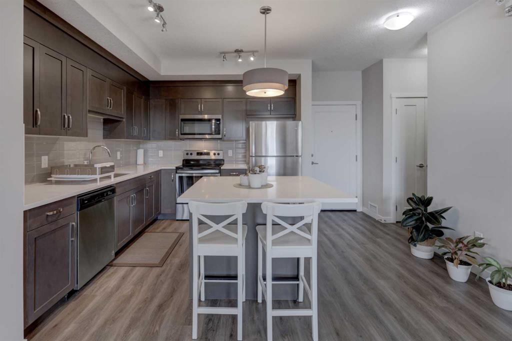 Fantastic 2 bedrooms, 2 bathrooms corner top floor unit ideally located just one block from the Fish Creek LRT station. This bright and spacious 785 sqft home is steps from neighbourhood parks and local amenities, with quick access to dining, shopping, and everyday conveniences—perfect for professionals or empty-nesters. The thoughtfully designed open-concept layout features quartz countertops and tile backsplashes in both the kitchen and bathrooms, stainless steel appliances, and a separate laundry room with stacked washer and dryer. Large rooms, LVP flooring throughout, and abundant storage enhance everyday comfort. Enjoy the private balcony complete with a BBQ gas line and expansive north and west views, including glimpses of downtown and beautiful sunset skies. With no units above, this top-floor residence provides exceptional quiet without the penthouse price. The unit also includes a titled underground parking stall and a separate titled storage locker for added value and convenience.