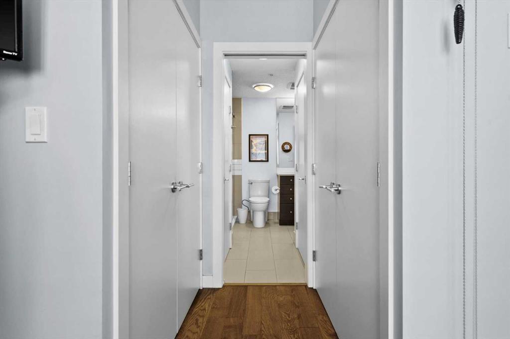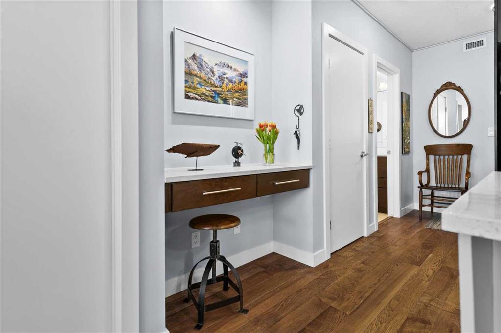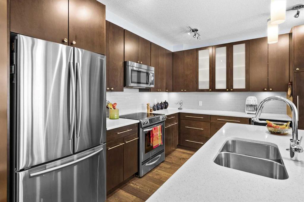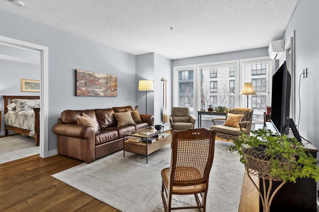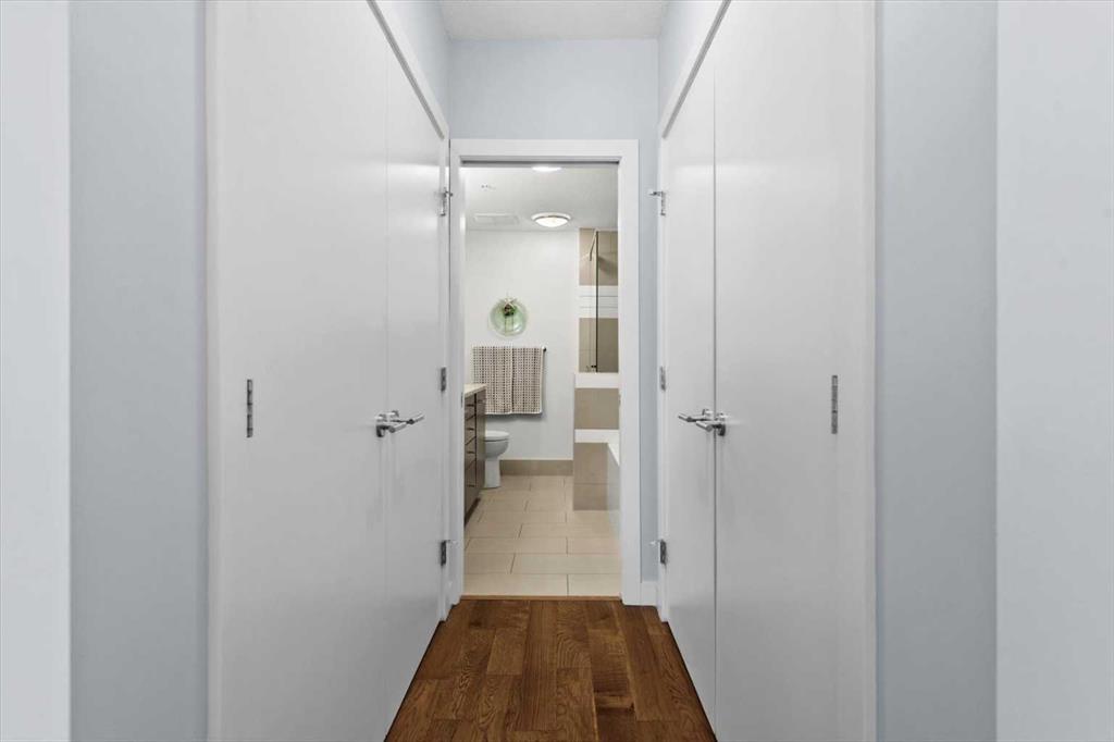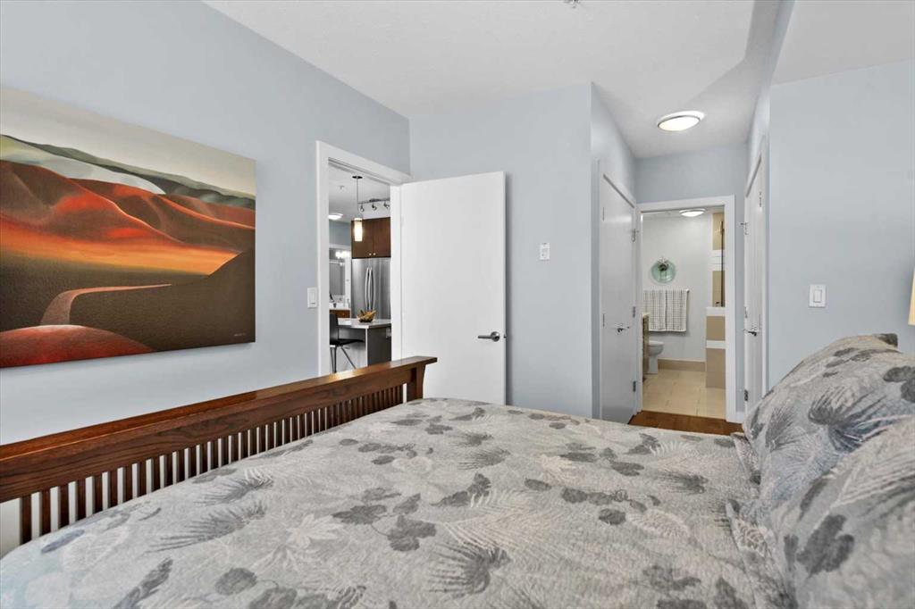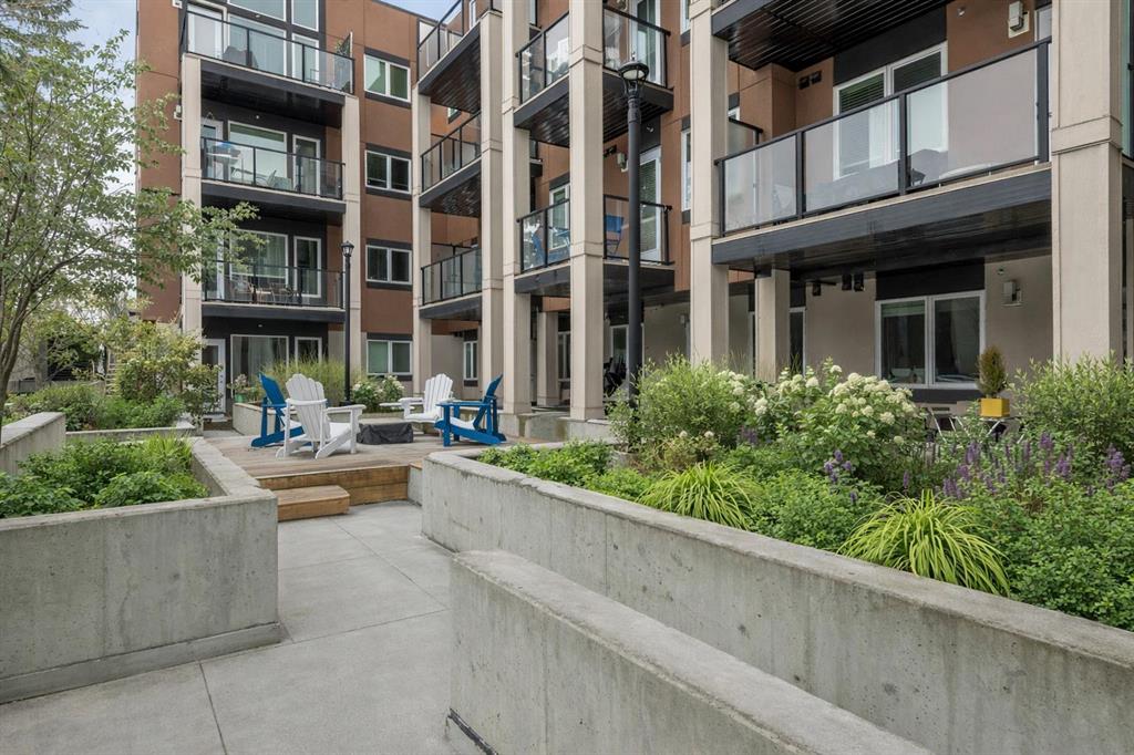 Welcome to refined inner-city living at UNO Condos, ideally positioned in the heart of Lower Mount Royal, one of Calgary’s most established and sought-after neighborhoods. Here, the charm of tree-lined streets and stately homes blends seamlessly with the vibrancy of urban life, just moments from the energy of 17th Avenue SW and the boutique appeal of 4th Street SW in Mission, this location offers both lifestyle and convenience in equal measure. This beautifully curated south-facing residence presents a thoughtful balance of comfort and sophistication, offering one of the largest unit layouts available within this complex. Recently refreshed with a modern palette of paint, the home is elevated by quartz countertops, engineered hardwood flooring, ceramic tile, and a sleek suite of stainless-steel appliances complemented by a wine fridge, built-in workspace, and in-suite laundry. The covered south-facing balcony invites year-round enjoyment, complete with a gas line and intimate balcony seating. In-floor heating ensures warmth through Calgary’s winters, while the addition of air conditioning provides welcome relief in the summer months. UNO is a well-managed, boutique building supported by a proactive and engaged board, with condo fees kept at a reasonable level and backed by a strong, 2025 Reserve Fund Study. Residents also enjoy access to a serene, shared courtyard deck and garden; an unexpected retreat tucked quietly behind the property. Inside, this home is both inviting and functional, ideal for relaxing or entertaining. The spacious primary suite comfortably accommodates a king-sized bed and features a walk-through closet leading to a luxurious five-piece ensuite with dual vanities, a soaker tub, and an upgraded glass shower. Thoughtfully separated for privacy, the second bedroom or optional den, includes its own walk-through closet and direct access to a stylish three-piece cheater ensuite. An oversized titled underground parking stall, secure assigned storage locker, bike room, and an exceptional Royal Avenue SW address. A home that effortlessly combines comfort, style, and location; this is Lower Mount Royal living at its finest.