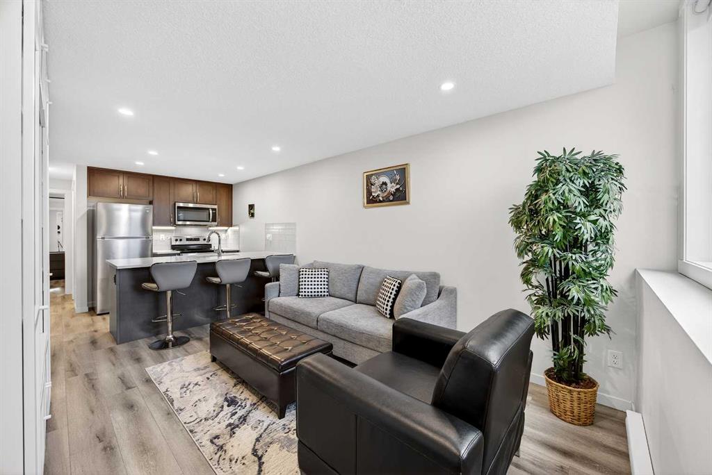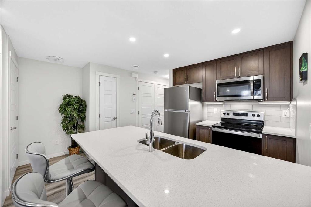Step into modern, maintenance-free living in the vibrant community of Rockland Park. This well-designed one-bedroom, one-bathroom townhome offers approximately 516 sq. ft. of functional living space, along with a generous 178 sq. ft. patio. It’s an excellent opportunity for first-time buyers, downsizers, or investors (short-term rental/AirBnB allowed). Tucked into a quiet corner of the ZEN complex, this home enjoys a peaceful setting with scenic views toward the nearby pond, green space and serene pathways. Inside, the open-concept layout creates a comfortable flow between the living area and kitchen, maximizing every square foot. The kitchen is both stylish and practical, complete with full-size stainless steel appliances, quartz countertops, sleek cabinetry, a pantry closet and a convenient eating bar. The bedroom is bright and efficiently laid out, featuring his-and-hers closets, while the four-piece bathroom is finished with matching quartz surfaces. In-suite laundry with a full-size washer and dryer adds everyday convenience. This unit also includes durable laminate flooring throughout, recessed lighting, a private front gated patio for fresh air, and an assigned powered parking stall. Its entirely below grade position entrance level offers easy access with minimal stairs. Located just steps from walking paths and the community pond, and close to the residents’ centre with planned amenities such as an outdoor pool, hot tub, pickleball/basketball courts and child care. This home is perfectly positioned to enjoy everything Rockland Park has to offer. With quick connections to major routes like Stoney Trail, Crowchild Trail, and the Trans-Canada Highway, commuting and weekend getaways are effortless. A fantastic opportunity to own in a growing northwest community—don’t miss it.