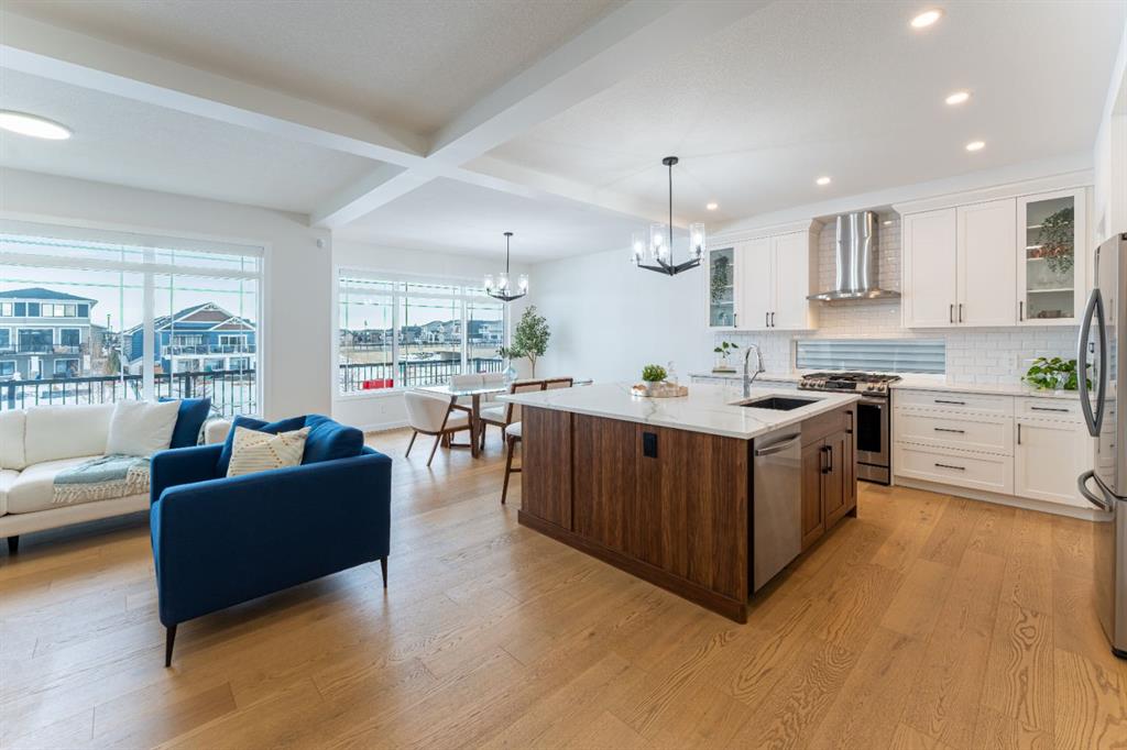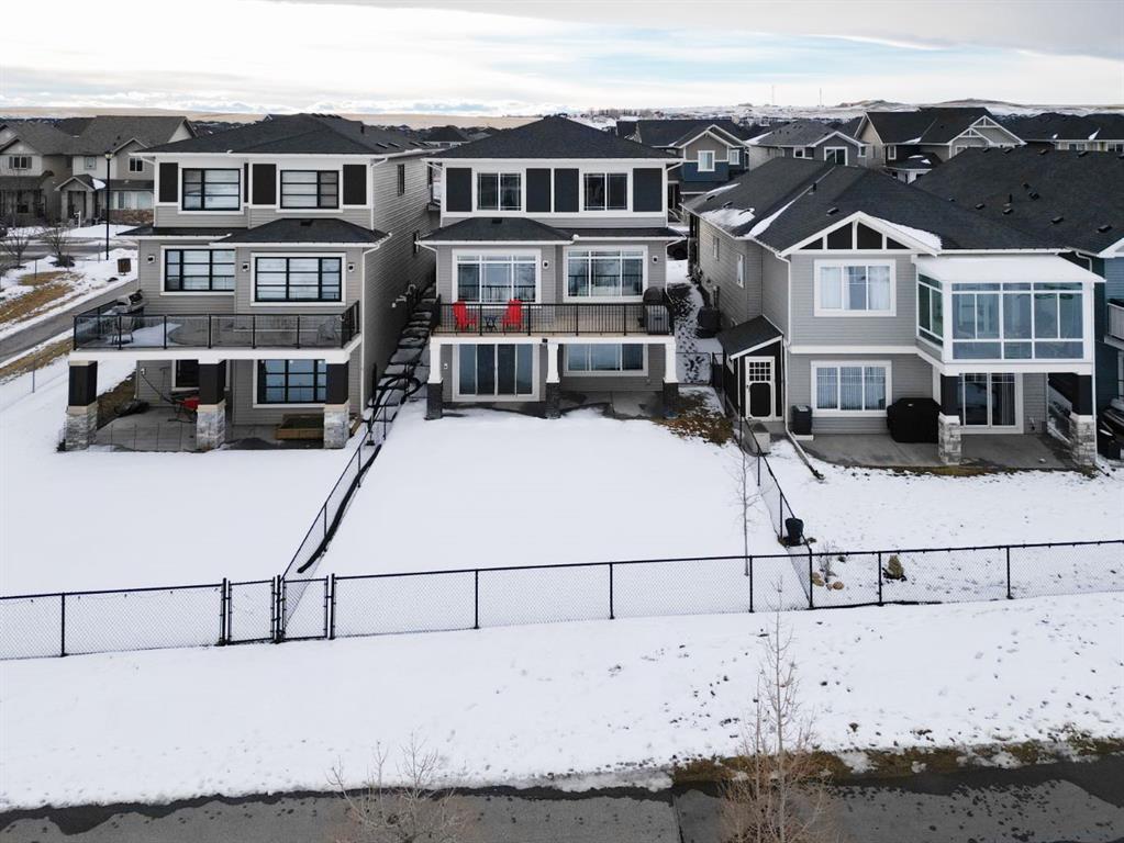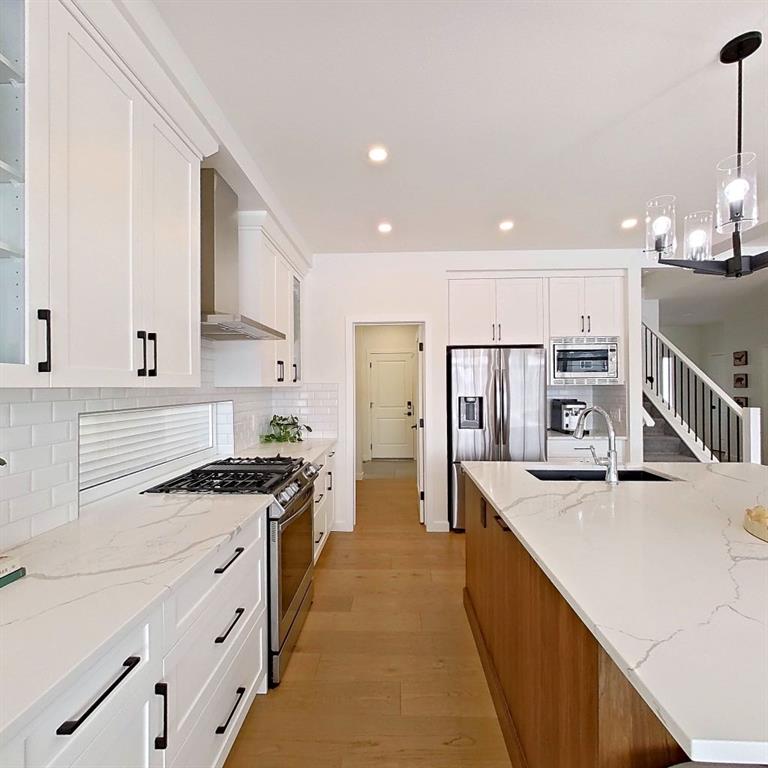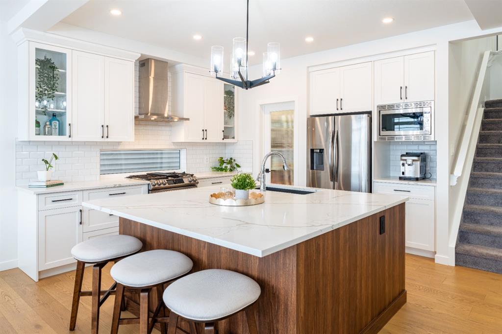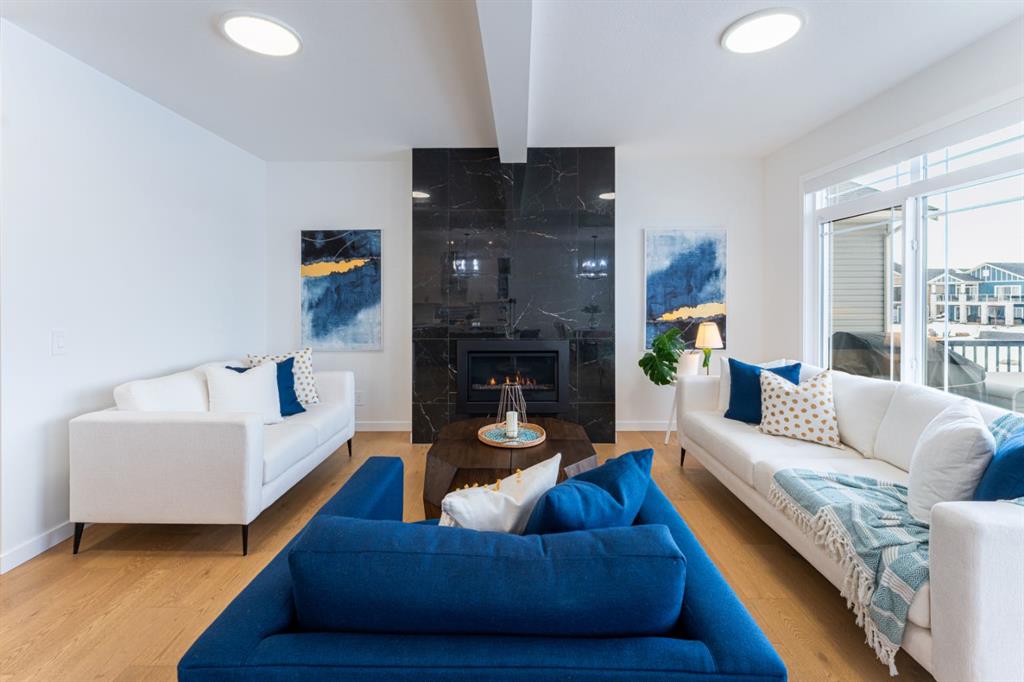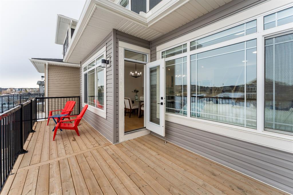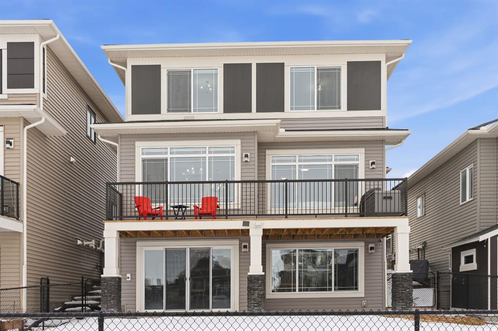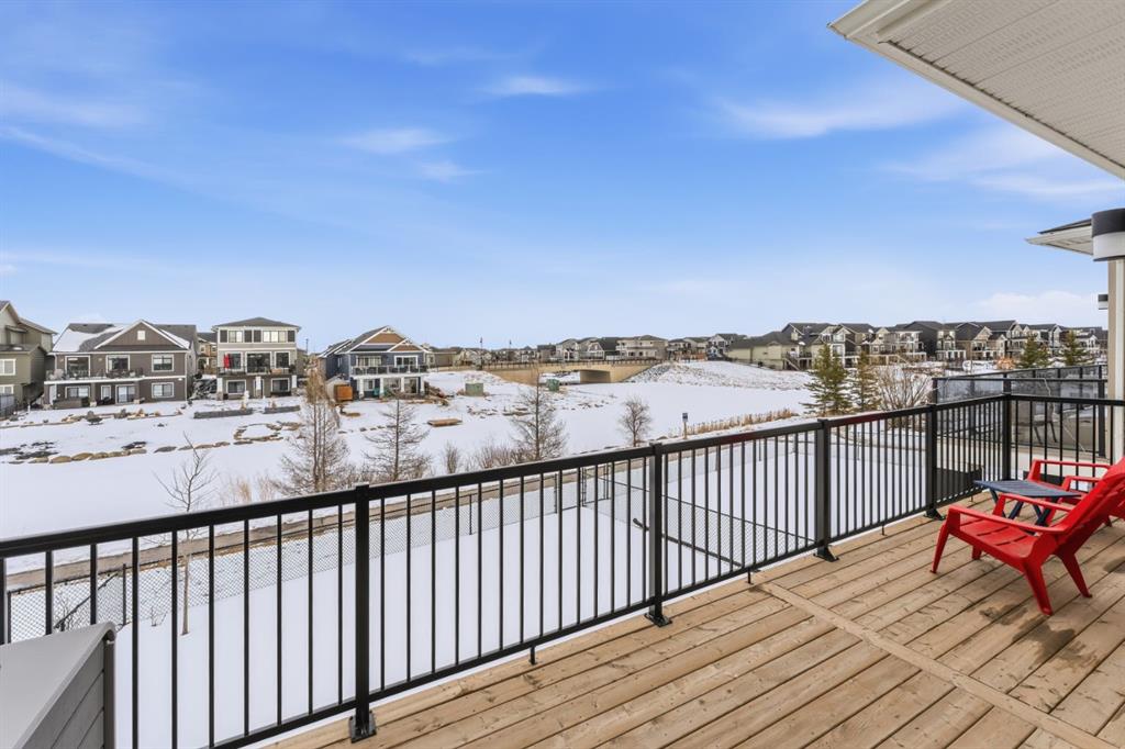 Welcome to this beautifully upgraded 2-Storey WALKOUT MCKEE built home in the desirable community of BAYSIDE. Close to 2400 SQFT it is perfectly suited for those who love to spend time outdoors. Just a short walk to Nose Creek Elementary, this home is surrounded by an abundance of parks, scenic walking paths, and the much loved canal system—perfect for year-round enjoyment, from skating in the winter to kayaking or boating in the summer. Backing onto the canal and walking paths, the home offers incredible water views through oversized rear windows and an extended FULL WIDTH DECK with matching concrete patio below. The lower level has an upgraded QUAD Slider door and a convenient gas line for your BBQ—ideal for entertaining or simply relaxing while taking in the view. The kitchen is thoughtfully designed, featuring a SILGRANITE undermount sink, GAS stove, built-in microwave, chimney hood fan, 2 TONE cabinetry and elegant GLASS upper cabinets. You’ll love the abundance of storage, including pot and pan drawers and a large recycling pullout integrated into the island. Inside, the home is finished with upgraded window coverings, including remote-controlled blinds in the dining and living rooms. TRENDY HARDWOOD flooring extends throughout the main floor (with tile in the mudroom) and into the den, replacing standard carpet for a more elevated feel. Check out the floor to ceiling TILED Fireplace as well as the black METAL SPINDLE railings on your way upstairs. The primary suite is like none other, we dare you to find a LARGER bathroom. Complete with a stylish BARN DOOR, a large tiled shower with a built-in bench, a relaxing soaker tub, and upgraded 12 x 24 tile throughout. A bank of three drawers adds both convenience and extra storage as well as a large walk-in closet. Additional thoughtful features include rough-ins in the basement for a future wet bar, making it easy to customize the space to suit your needs. The laundry room is equally impressive, offering ample storage, a quartz folding counter over the washer and dryer, and a convenient sink. This home truly offers the perfect blend of luxury, functionality, and an unbeatable location in one of Airdrie’s most sought-after communities.