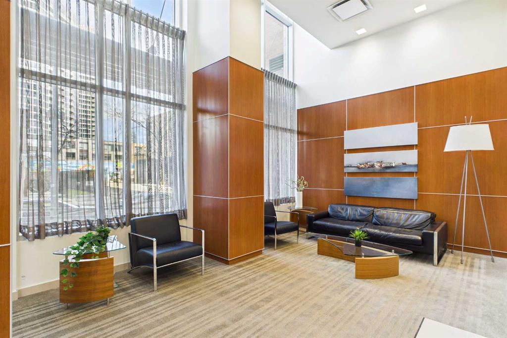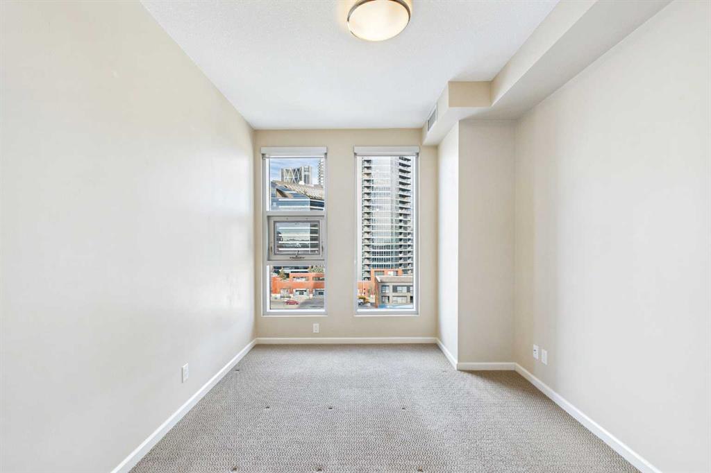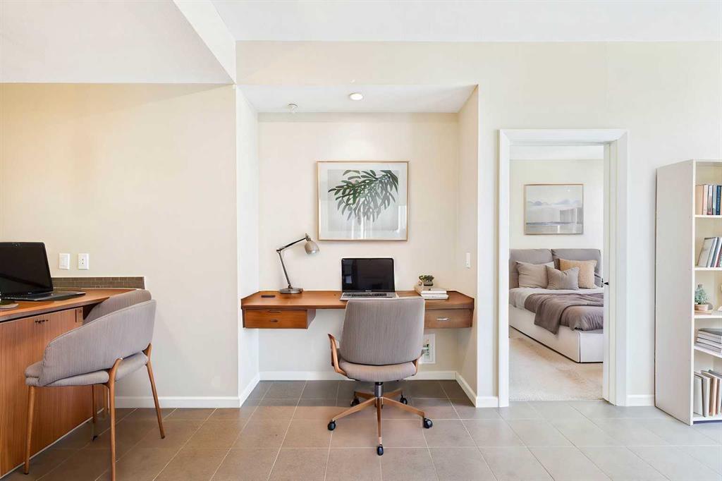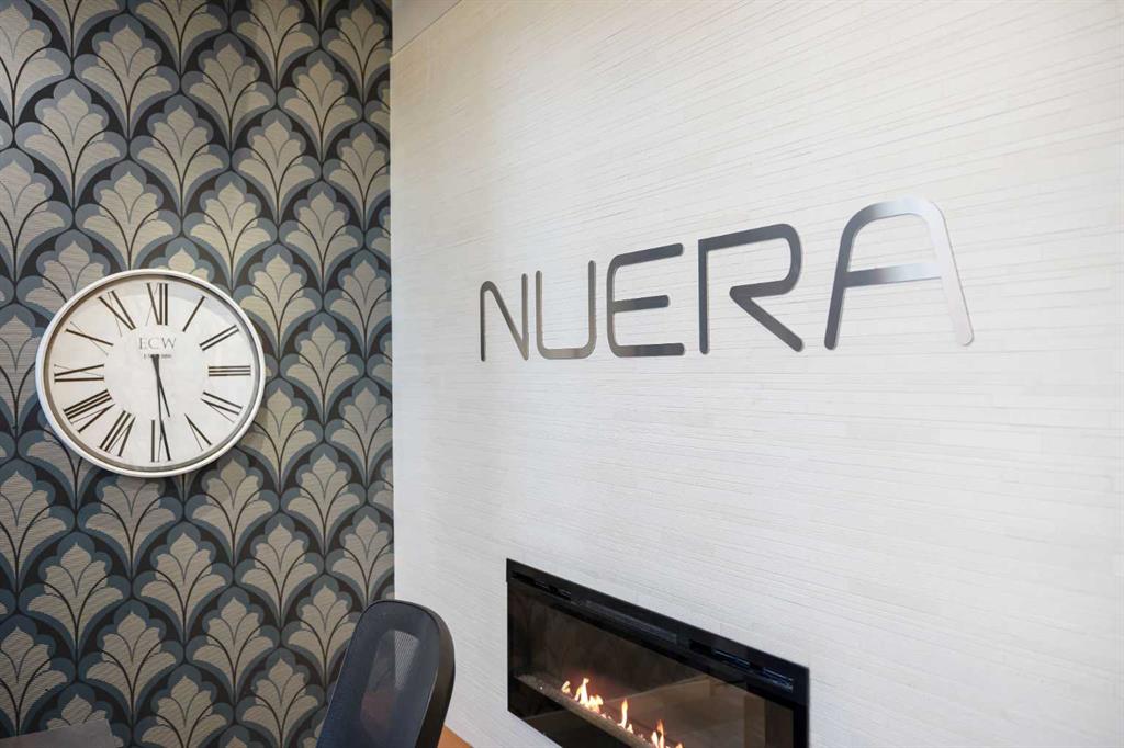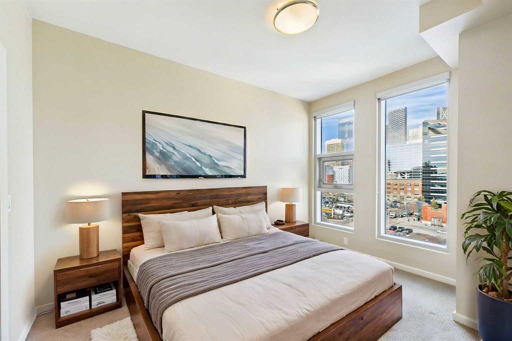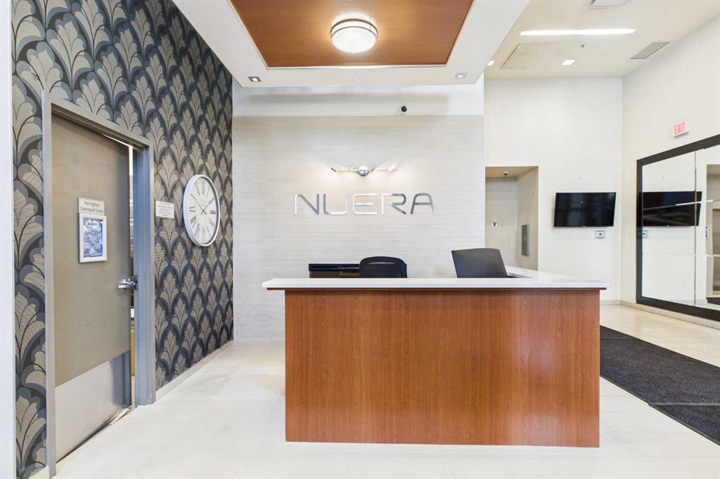 Welcome to Nuera—ideally located near shopping, dining, entertainment, and the vibrant boutiques and restaurants of Victoria Park. This contemporary residence features a spacious, open-concept floor plan, thoughtfully designed with modern finishes and a refined color palette throughout. The unit offers 9-foot ceilings, ceramic tile flooring, floor-to-ceiling windows, and central air conditioning. It includes two well-appointed bedrooms, an open kitchen, a formal dining area, and a convenient built-in desk—perfect for a home office. The bright and expansive living room features French doors leading to a private balcony. Additional highlights include a 3-piece main bathroom, a 4-piece ensuite, in-suite laundry, and a Titled heated underground parking stall. The primary bedroom is filled with natural light and showcases floor-to-ceiling windows, a walk-through closet, and a private 4-piece ensuite. Enjoy sweeping downtown views from this exceptional home. This well-maintained concrete building offers excellent security and concierge service, impressive fitness centre, a rooftop patio, and is ideally situated just steps from the Stampede Grounds, MNP Sports Centre, Sunterra Market, H-Mart, coffee shops, and the C-Train. A truly outstanding opportunity for refined urban living!