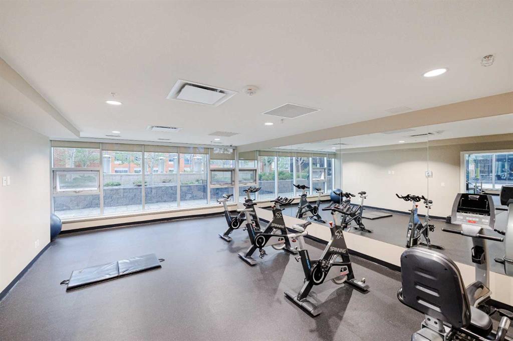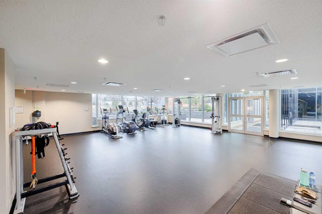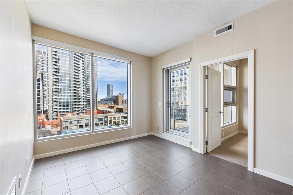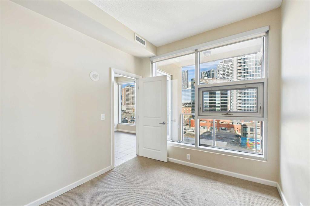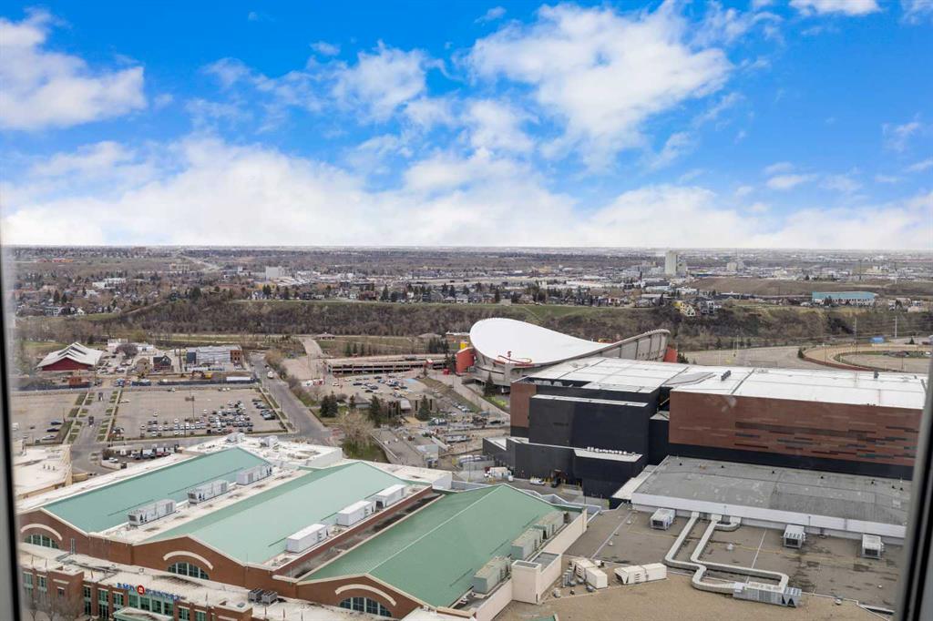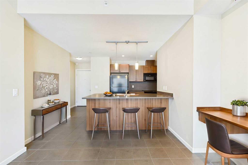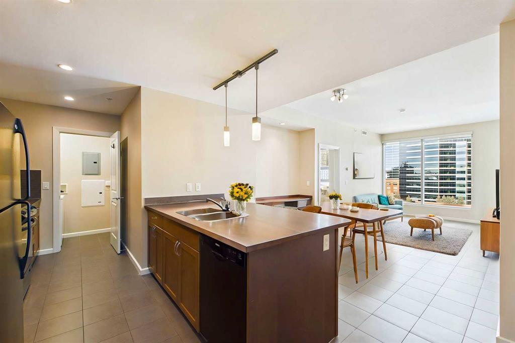 Welcome to Nuera—ideally located near shopping, dining, entertainment, and the vibrant boutiques and restaurants of Victoria Park. This contemporary residence features a spacious, open-concept floor plan, thoughtfully designed with modern finishes and a refined color palette throughout. The unit offers 9-foot ceilings, ceramic tile flooring, floor-to-ceiling windows, and central air conditioning. It includes two well-appointed bedrooms, an open kitchen, a formal dining area, and a convenient built-in desk—perfect for a home office. The bright and expansive living room features French doors leading to a private balcony. Additional highlights include a 3-piece main bathroom, a 4-piece ensuite, in-suite laundry, and a Titled heated underground parking stall. The primary bedroom is filled with natural light and showcases floor-to-ceiling windows, a walk-through closet, and a private 4-piece ensuite. Enjoy sweeping downtown views from this exceptional home. This well-maintained concrete building offers excellent security and concierge service, impressive fitness centre, a rooftop patio, and is ideally situated just steps from the Stampede Grounds, MNP Sports Centre, Sunterra Market, H-Mart, coffee shops, and the C-Train. A truly outstanding opportunity for refined urban living!