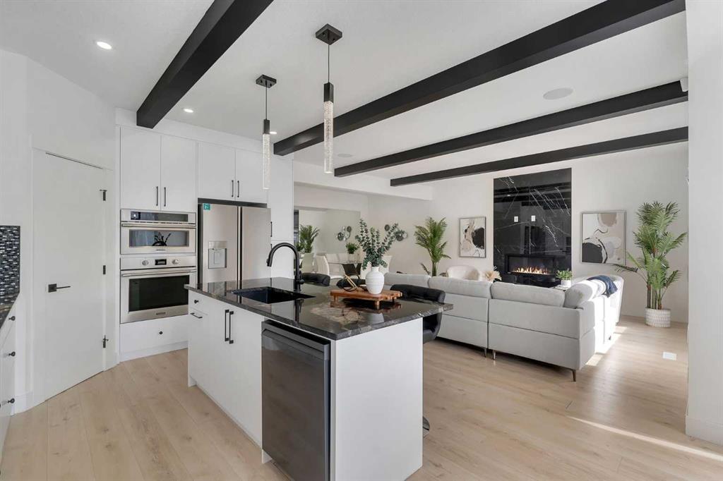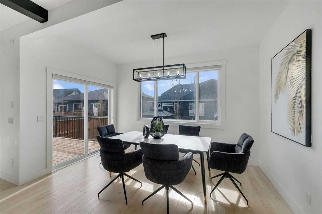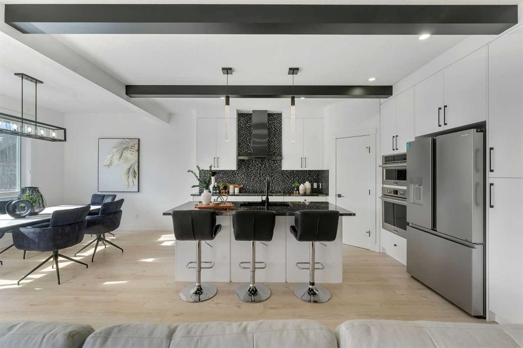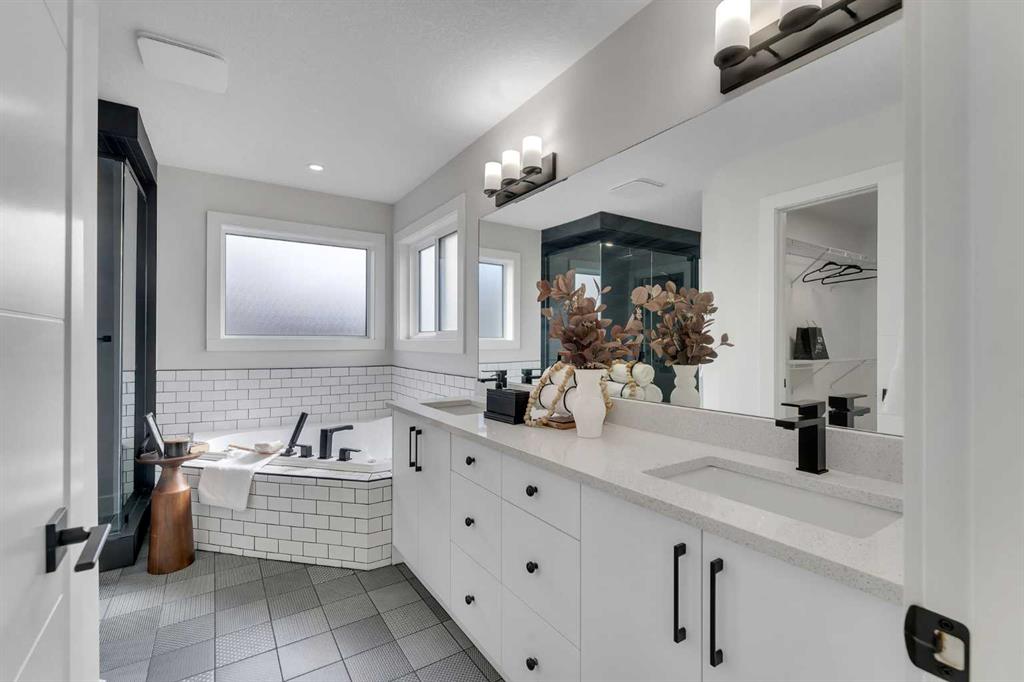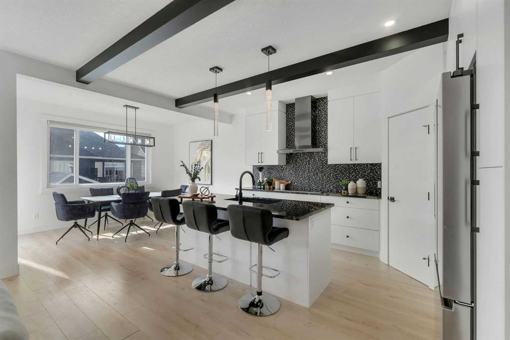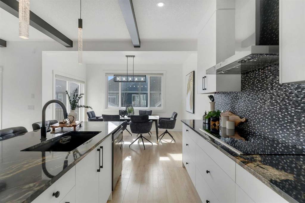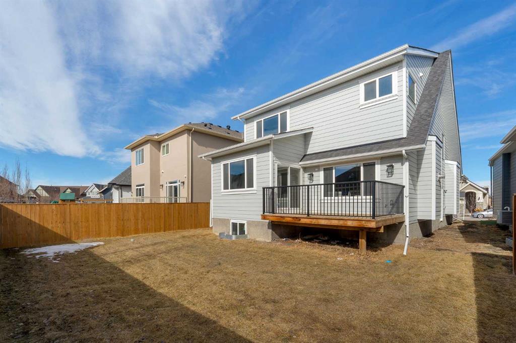 Welcome to this stunning luxury home located in the highly sought-after community of Coopers Crossing. Offering approximately 2,637 sq. ft. of thoughtfully designed living space, this elegant two-storey residence perfectly combines modern upgrades with timeless style. This home features 5 spacious bedrooms and 4 full bathrooms, ideal for growing families or multi-generational living. The main floor boasts a bright and open layout, complete with two dining areas, a full bedroom, and a 3-piece bathroom with a standing shower. The grand double-door entrance creates a welcoming first impression. The chef-inspired kitchen is beautifully upgraded with built-in appliances, a chimney-style hood fan, ceiling-height cabinetry, and sleek black hardware throughout. The living room showcases a striking feature fireplace with bold black tile detailing, adding warmth and sophistication. Large windows across the main floor allow for an abundance of natural light, while the elegant spindle railing enhances the overall design. Upstairs, you will find 4 generously sized bedrooms and 3 full bathrooms, along with a spacious bonus/family room featuring a vaulted ceiling—perfect for relaxation or entertainment. The primary bedroom offers a tray ceiling, a luxurious 5-piece ensuite with a jetted tub, separate glass shower, and a large walk-in closet. The upper-level laundry room is equipped with a sink and additional storage for convenience. All secondary bedrooms are well-proportioned, with access to two additional full bathrooms. Step outside to enjoy a large rear deck and fully fenced backyard—ideal for outdoor living. A side entrance to the basement provides excellent potential for future development. The home is further enhanced with durable and premium James Hardie (Hardie Board) exterior siding and features a Double wide car garage, offering extended parking space or additional storage flexibility. Conveniently located close to schools, parks, playgrounds, and shopping plazas, this home delivers exceptional value in one of Airdrie’s most prestigious neighbourhoods. Don’t miss this incredible opportunity to own a premium home in Coopers Crossing.