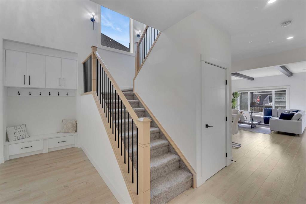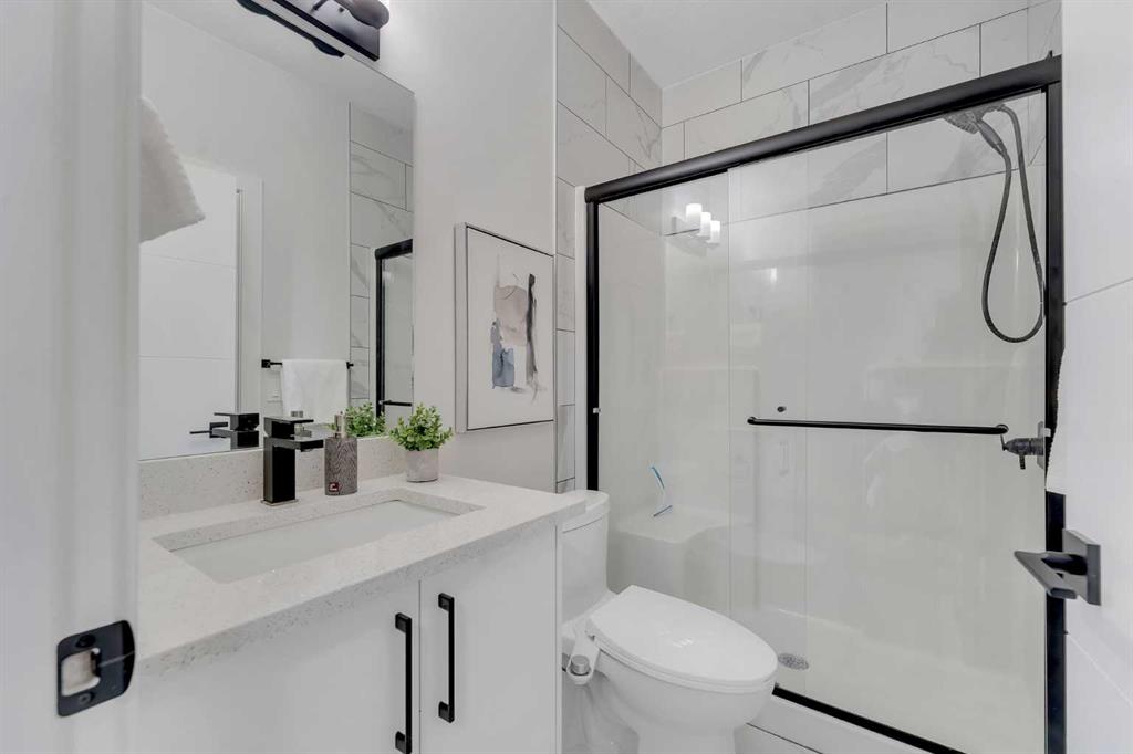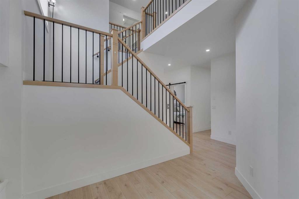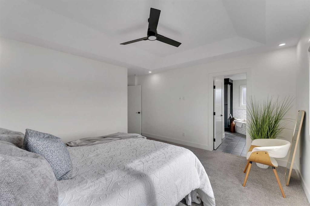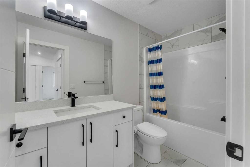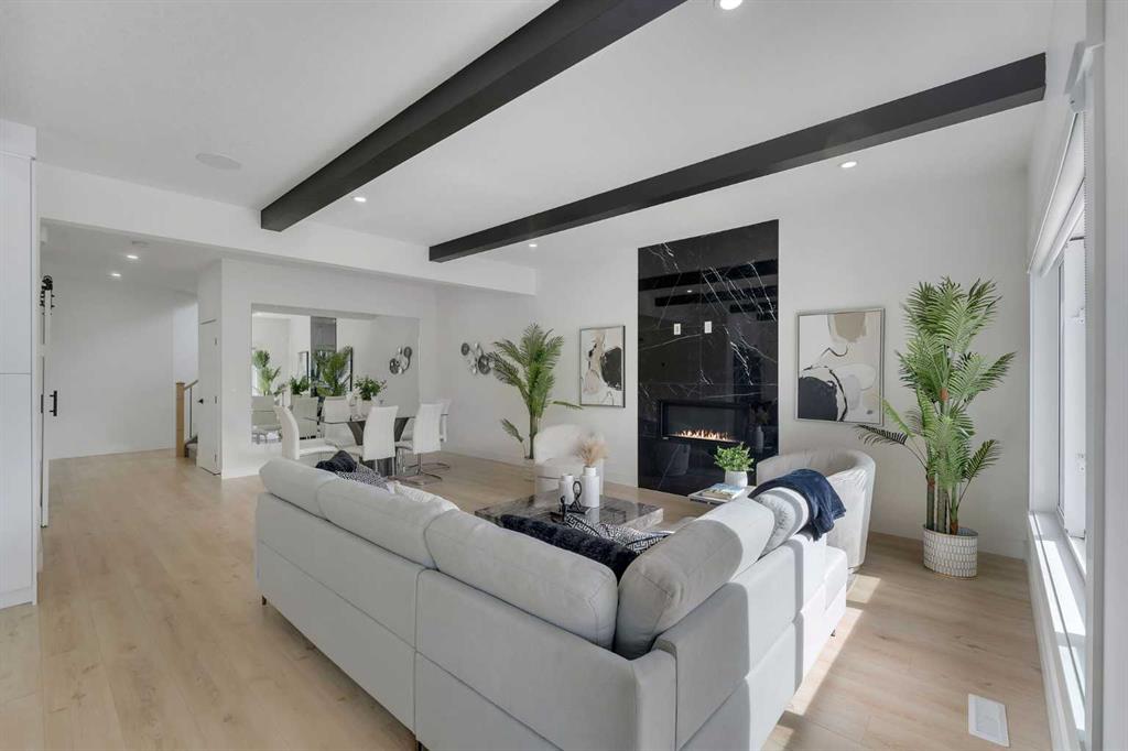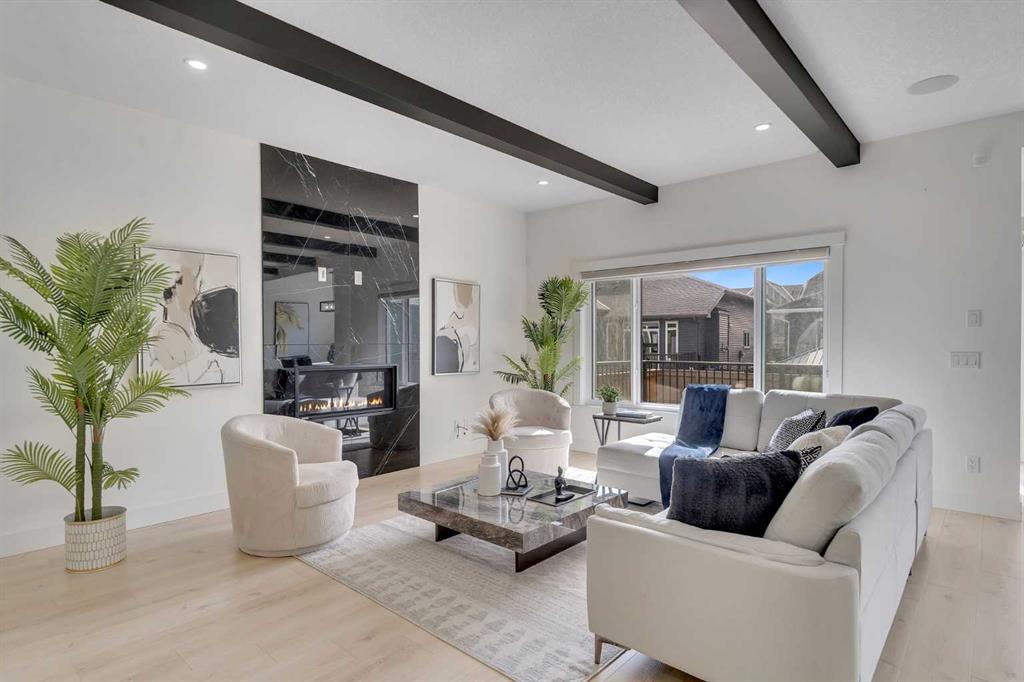 Welcome to this stunning luxury home located in the highly sought-after community of Coopers Crossing. Offering approximately 2,637 sq. ft. of thoughtfully designed living space, this elegant two-storey residence perfectly combines modern upgrades with timeless style. This home features 5 spacious bedrooms and 4 full bathrooms, ideal for growing families or multi-generational living. The main floor boasts a bright and open layout, complete with two dining areas, a full bedroom, and a 3-piece bathroom with a standing shower. The grand double-door entrance creates a welcoming first impression. The chef-inspired kitchen is beautifully upgraded with built-in appliances, a chimney-style hood fan, ceiling-height cabinetry, and sleek black hardware throughout. The living room showcases a striking feature fireplace with bold black tile detailing, adding warmth and sophistication. Large windows across the main floor allow for an abundance of natural light, while the elegant spindle railing enhances the overall design. Upstairs, you will find 4 generously sized bedrooms and 3 full bathrooms, along with a spacious bonus/family room featuring a vaulted ceiling—perfect for relaxation or entertainment. The primary bedroom offers a tray ceiling, a luxurious 5-piece ensuite with a jetted tub, separate glass shower, and a large walk-in closet. The upper-level laundry room is equipped with a sink and additional storage for convenience. All secondary bedrooms are well-proportioned, with access to two additional full bathrooms. Step outside to enjoy a large rear deck and fully fenced backyard—ideal for outdoor living. A side entrance to the basement provides excellent potential for future development. The home is further enhanced with durable and premium James Hardie (Hardie Board) exterior siding and features a Double wide car garage, offering extended parking space or additional storage flexibility. Conveniently located close to schools, parks, playgrounds, and shopping plazas, this home delivers exceptional value in one of Airdrie’s most prestigious neighbourhoods. Don’t miss this incredible opportunity to own a premium home in Coopers Crossing.
