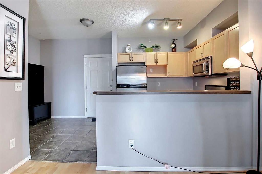 TOP FLOOR UNIT • 9' CEILINGS • OPEN VIEWS • BALCONY + GAS BBQ LINE • ALL UTILITIES INCLUDED IN CONDO FEES • TITLED HEATED UNDERGROUND PARKING + STORAGE • PRIME PANORAMA HILLS LOCATION • ACROSS THE STREET FROM CALGARY TRANSIT NORTH POINTE TERMINAL. Welcome to Panamount Place in NW Calgary’s sought-after Panorama Hills – a top-floor home offering comfort, convenience, and strong long-term value for first-time buyers, downsizers, and investors alike. Step inside to a bright open-concept layout with 9-foot ceilings, a comfortable dining area, and a spacious living room filled with natural light. The kitchen features warm maple cabinetry and a raised breakfast bar – perfect for casual meals, morning coffee, and entertaining. Sunny patio doors lead to a good-sized balcony with a gas BBQ hookup, extending your living space outdoors. The primary bedroom is a quiet retreat with a walk-through closet and private direct entry to the 4-piece bathroom. Stacked in-suite laundry plus an extra storage closet add everyday practicality. Condo fees include all utilities (heat, water, electricity, sewer, waste & recycling). You’ll also appreciate titled heated/secure underground parking and a private storage locker – ideal for bikes, tires, and seasonal items. This unit shows well and offers a great opportunity to add value over time with minor cosmetic updates. Tenant occupied. Currently rented at $1,800/month (utilities included) with planned vacancy April 30, 2026. Enjoy the convenience of Panorama Hills living – close to shopping, restaurants, parks, pathways, schools (K–12), Vivo, and quick access to Stoney Trail & Deerfoot Trail. A unit like this doesn’t come up often – book your showing today!