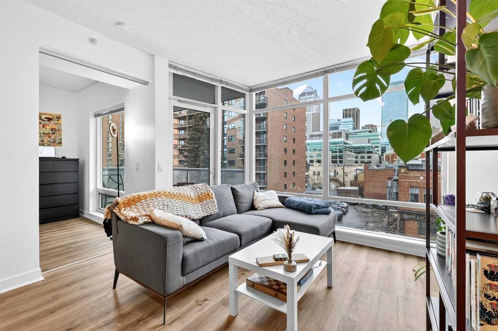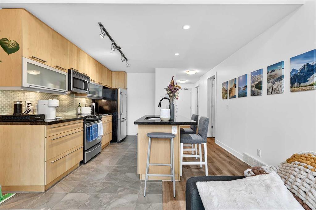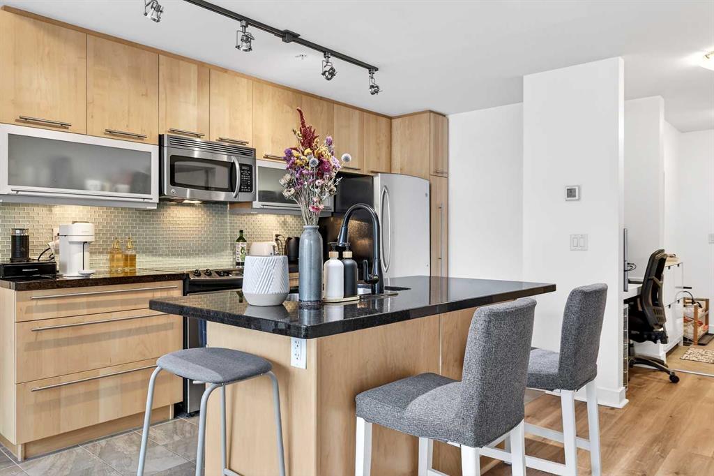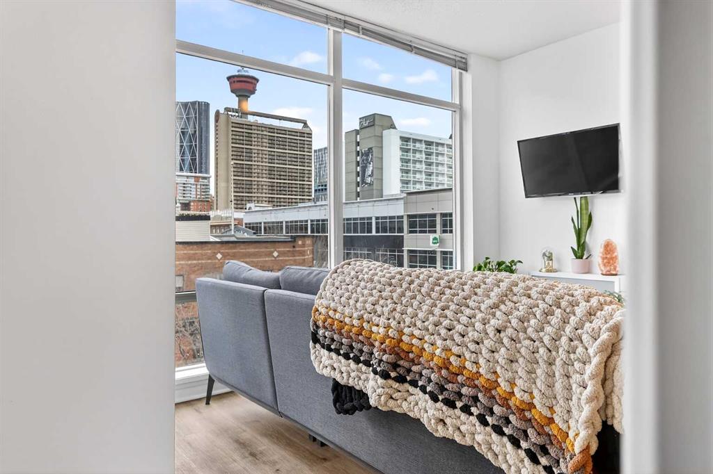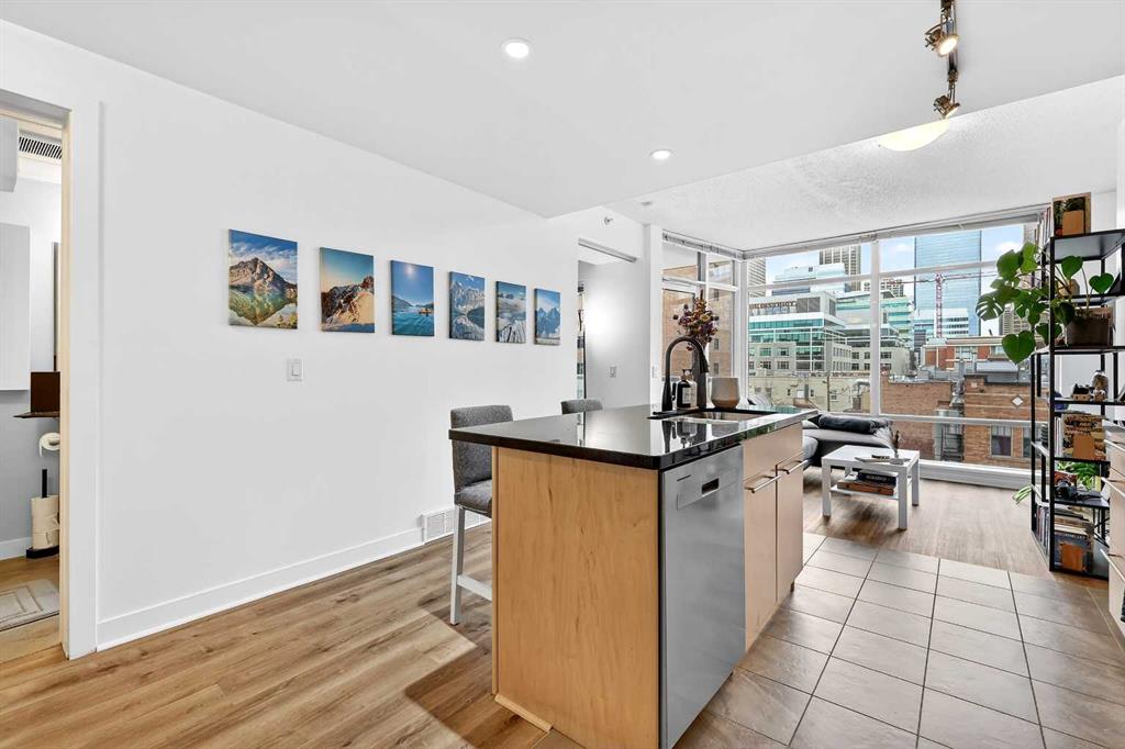 Experience elevated inner-city living in this beautifully appointed 1 bedroom, 1 bathroom residence in Union Square, ideally located in the heart of Calgary’s vibrant entertainment district. Just minutes from the river pathways and surrounded by some of Calgary’s finest restaurants, cafés, and nightlife, this is urban living at its best. Floor-to-ceiling windows flood the home with natural light and showcase stunning panoramic views of the downtown skyline. Thoughtfully finished with warm-toned millwork and durable luxury vinyl plank flooring, the space feels both modern and inviting. The open-concept kitchen is designed for entertaining, featuring a large breakfast bar, granite countertops, glass tile backsplash, and stainless steel appliances. The spacious bedroom includes a generous walk-in closet and connects to a bright 5-piece bathroom, offering both functionality and comfort. A space for your home office is perfectly appointed and completes this unit. A heated underground parking, additional storage, and unbeatable access to trendy shops and dining complete this exceptional offering.