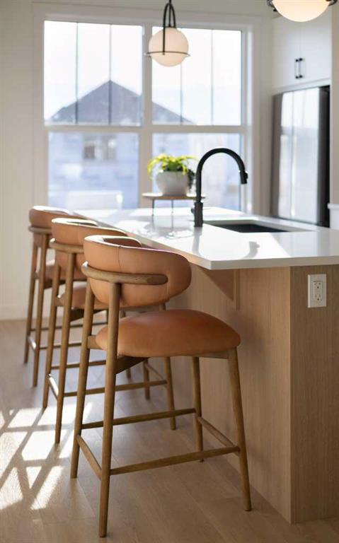 ** Brand New No Condo Fee Townhome Built by Genesis Homes ** Quick Possession Available | 1,720 SqFt | 3 Beds | 2.5 Baths | Double Attached Garage | End Unit | April–May 2026 Possession | Open Concept Layout | Elevated Finishes Throughout | Quartz Countertops | Designer Backsplash | Full Height Cabinetry | Stainless Steel Builder Appliance Package | Walk-in Pantry | Wide Plank LVP Flooring | Upper Level Laundry | Smart Home Features | Private Balcony | BBQ Gas Line | James Hardie Siding | Welcome to the Alicia model by Genesis Homes—offering 1,720 SqFt of thoughtfully designed living space in a brand new end unit townhome with NO condo fees. Perfectly suited for families, professionals, or investors, this home blends modern style with everyday functionality. The main level welcomes you with a spacious foyer and direct access to your double attached garage, providing convenience and extra storage. Head upstairs to a bright and airy open-concept living space where large windows flood the home with natural light. The kitchen is beautifully appointed with quartz countertops, full height cabinetry, a designer backsplash, stainless steel appliances, and a walk-in pantry—ideal for both daily living and entertaining. The central island with bar seating seamlessly connects to the dining area and spacious living room, creating the perfect flow for hosting or relaxing. Step out onto your private balcony complete with a BBQ gas line—perfect for summer evenings. The upper level features three sizeable bedrooms, including a comfortable primary retreat with a walk-in closet and a private ensuite bath. Bedrooms two and three share a well-appointed full bathroom, and the upper floor laundry adds everyday convenience right where you need it most. Finished with durable James Hardie siding and equipped with smart home features, this home offers both style and peace of mind. Located just moments from essential amenities and nestled close to a picturesque park, you’ll enjoy easy access to shops, dining, and outdoor activities. Take in breathtaking mountain views and sunsets as you stroll by the serene pond. Don’t miss your opportunity to own this stunning Alicia model—book your showing today!