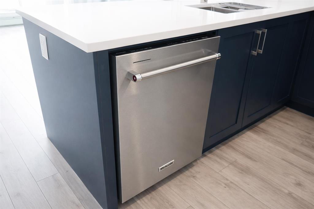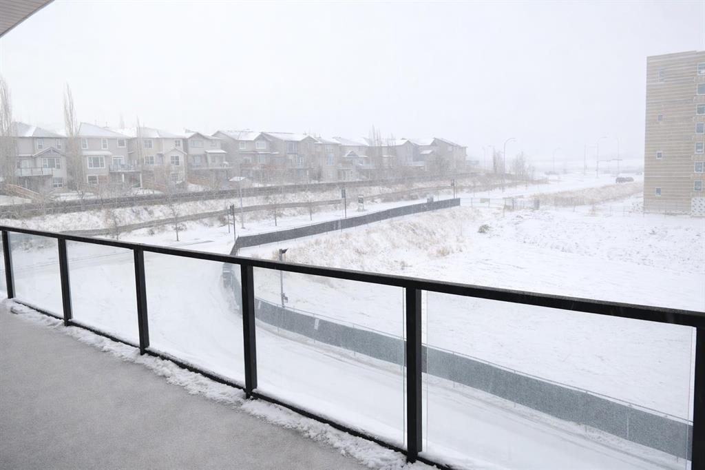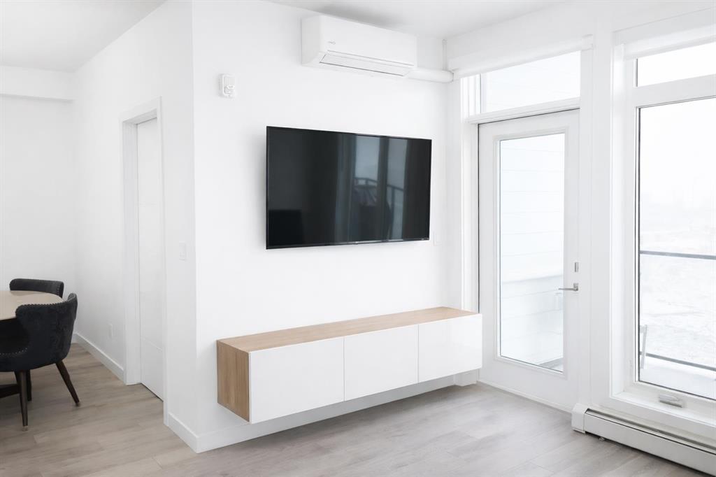 Welcome to the Springbank Hill community, known for its excellent schools and family-friendly environment. This beautiful area is bordered by a natural environmental reserve park with abundant walking trails and bike paths that connect throughout this vibrant and growing community. This new build condominium, Orion Condominium, is located at 85 Street and 19 Avenue SW. This fully upgraded open-concept TOP FLOOR unit is designed to highlight its large double balcony and double-pane windows. The home features a Lennox mini-split heating and cooling system, an efficient dual heating and air conditioning system professionally installed with permits. Luxury vinyl plank flooring with soundproof underlay runs throughout the living room, dining room, kitchen, bathroom, and primary bedroom. The European-inspired kitchen is finished with premium kitchen cabinetry, shaker-style cabinets throughout all bathrooms, soft-close drawers, marble quartz countertops, KitchenAid appliances (refrigerator, gas stove, microwave, dishwasher), stacked front-load washer and dryer, and a natural gas BBQ line installed on the balcony. Includes one titled parking stall and an oversized storage locker (75 sq. ft.) located beside the parking stall. Walking distance to Aspen Landing Shopping Centre with grocery stores, restaurants, cafes, clinics, and amenities. Quick access to Stoney Trail and Bow Trail, and close to 69 Street C-Train Station for easy downtown access, as well as Westside Recreation Centre.