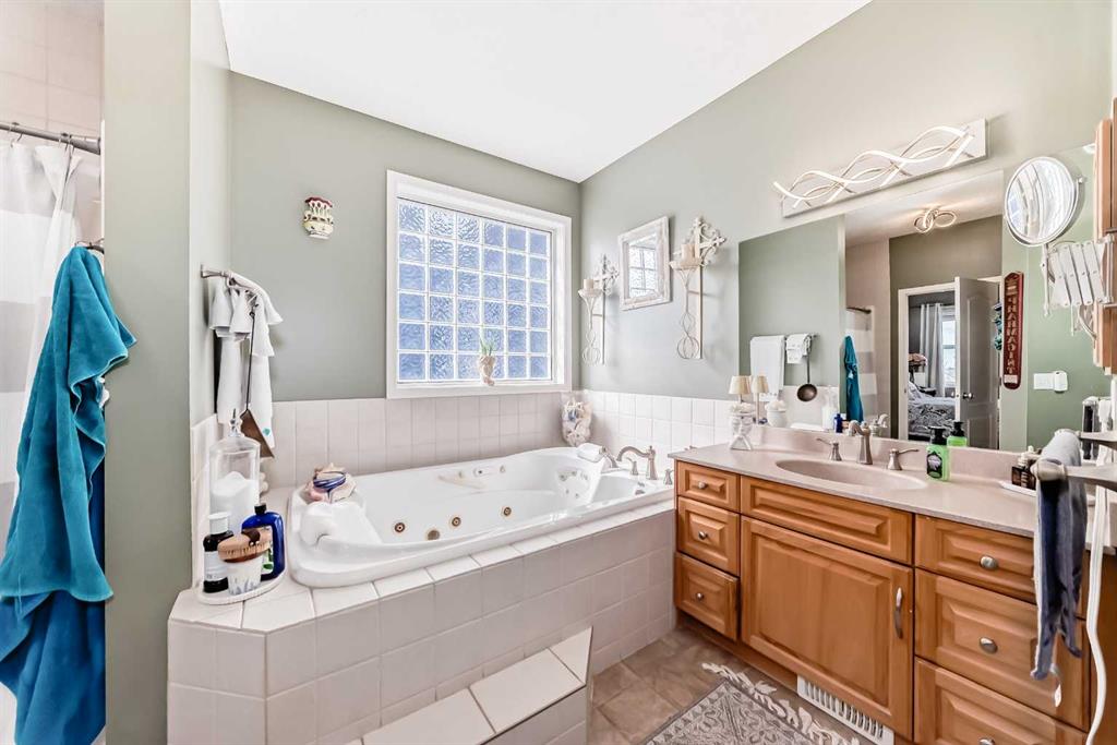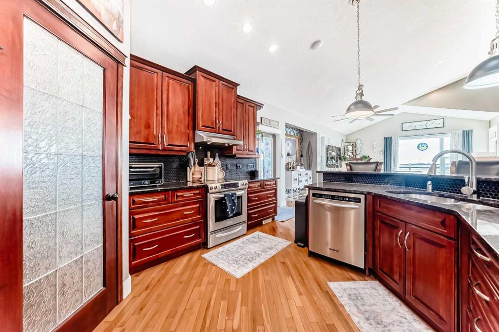 Beautiful 3-bedroom walk-out bungalow in the sought-after Boulder Creek Estates, perfectly positioned on the Par 3 11th fairway with stunning golf course views! Enjoy the spacious, private east-facing deck, complete with gas line hookup - perfect for relaxing while taking in the peaceful surroundings and the occasional golfer passing by. This outstanding open-concept bungalow features a welcoming foyer finished with cork flooring and vaulted ceilings throughout the main level. The kitchen has abundant cabinetry, a large island with an eating bar, granite countertops, and Whirlpool appliances, all opening to the living room with huge windows with a great view of the golf course. A newer deck with access from the kitchen is a great spot for a BBQ or smoker! The main level offers a spacious mudroom/laundry room complete with a sink and a convenient walk-through pantry. The oversized heated double garage features newer epoxy flooring and ample space for a workbench. The primary suite features a walk-in closet with stylish barn doors and a spacious ensuite, complete with a jetted tub and a separate shower. Also on the main level is a 2-piece bathroom and a versatile office/den. Downstairs features two bedrooms, both with walk-in closets, and a spacious 4-piece bathroom. The rec room flows into the family room, complete with a wet bar rough-in, and offers walk-out access to the covered patio and a private yard with a paved patio with gas line, sidewalks, and a hot tub rough-in. This exceptional home is wired for sound throughout, with speakers on both levels, both decks, the patio, and even the garage. The utility room also features newer epoxy flooring. Conveniently located close to schools and great restaurants, it offers the feel of living outside the city while still enjoying nearby amenities. This is one you don’t want to miss!
