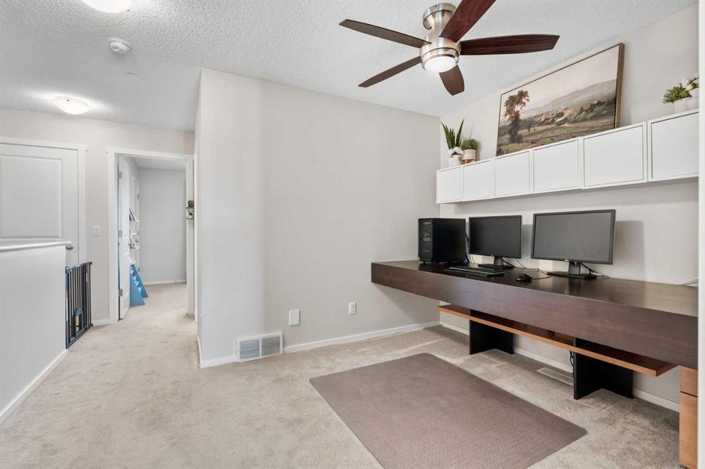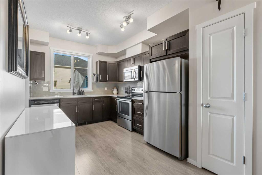 NO CONDO FEES. FULLY DEVELOPED BASEMENT BY BUILDER. Upon entry to the home, you will immediately notice the spacious open concept main floor with nine-foot-high ceiling, living and dining space together with rear kitchen overlooking the private rear yard. For convenience a half bathroom is located on this level. On the second level you will find a generous size primary bedroom with a 4-piece ensuite and ample closet space. An open flex area currently used as an office and 4-piece bathroom separates the primary bedroom from a second bedroom on the upper level. Your laundry area is located on the upper floor. The basement was fully finished by the builder and includes a recreation/family room, a bedroom and a 4-piece bathroom, ideal for guests or older children. The total developed living space is over 1800 square feet including three 4-piece bathrooms and a single half bath. The rear yard is fenced, includes a patio and a parking pad for two vehicles off the lane. Paved Alley. Legacy is a sought-after district with its great shopping, schools, pathways and easy access to major thoroughfares. There is a bus stop across the street about half a block away on a route that connects to the south LRT. Relax on the sunny south facing front porch and enjoy the uninterrupted view of a large community pond with spectacular summer fountain display. Bonus, there are no condo fees for this home. Be sure to check out the virtual tour. You won't want to miss this one!