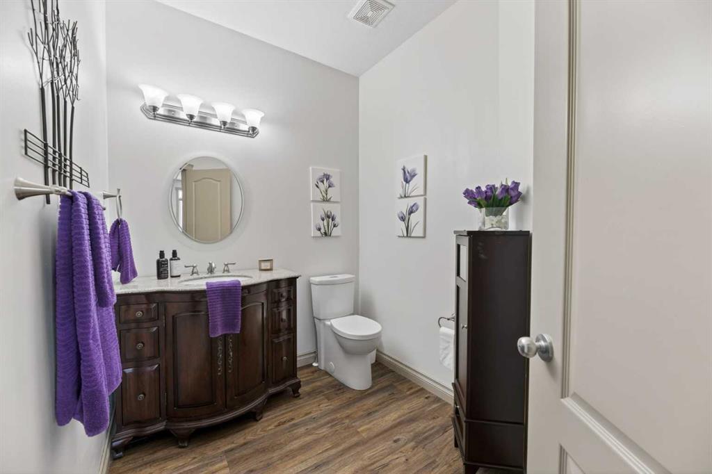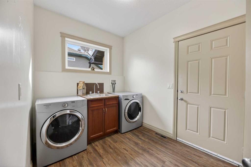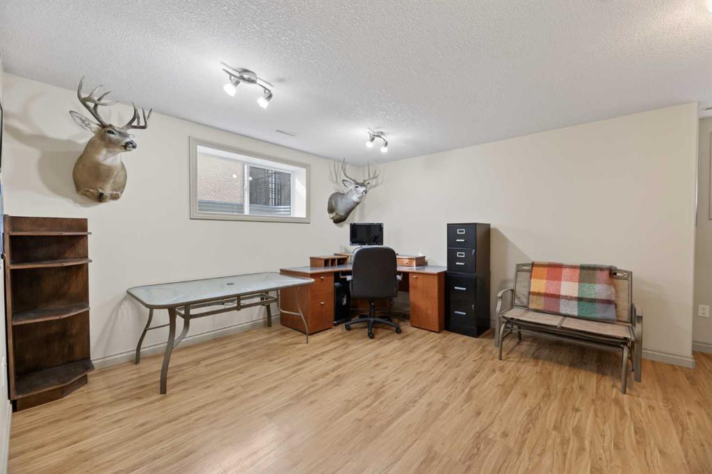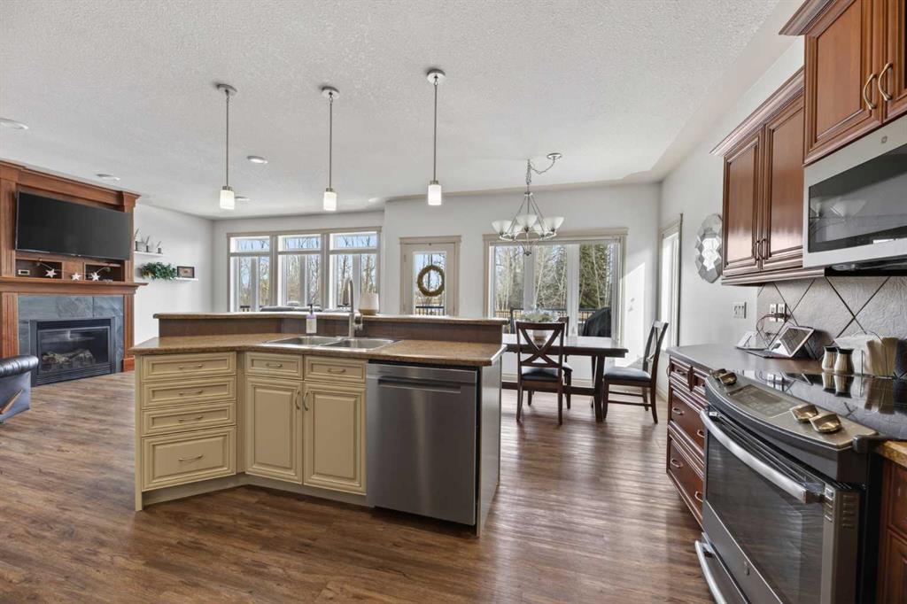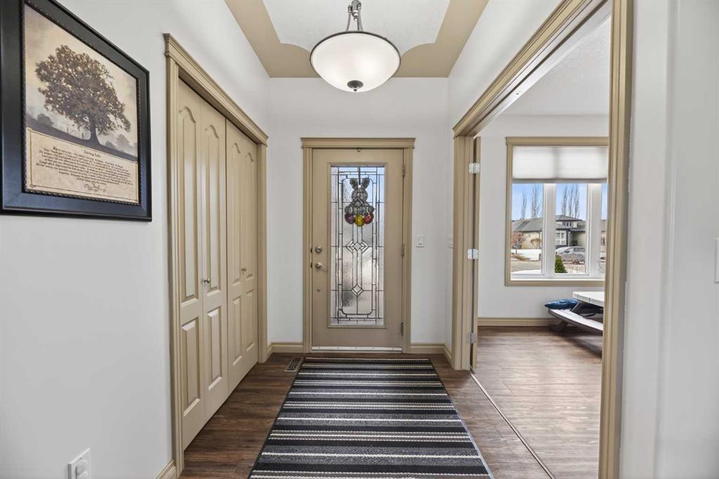 Welcome to this well-maintained bungalow located in a desirable neighborhood, offering comfort & functionality. The main floor features a bright and open layout with a spacious kitchen complete with a corner pantry, island and newer appliances, flowing seamlessly into the dining room-perfect for everyday living and entertaining. The cozy living room is highlighted by a gas fireplace with a beautiful wood mantle, creating a warm and welcoming space. Convenience is key with a 2-piece bathroom and main floor laundry with direct access to the attached double garage with in floor heating & epoxy floor finish. The primary bedroom offers a walk-in closet and 3-piece ensuite, while a second bedroom/office completes the main level. The fully developed basement provides additional living space with two nice sized bedrooms-one has a walk-in closet, a 4-piece bathroom, and a generous family room-ideal for guests or a growing family. In-floor heating in both the basement and attached double garage adds comfort year-round, along with a utility/storage room for added practically. Recent upgrades include vinyl plank flooring on main floor, new hot water tank (2026) and updated toilets on main floor. Additional highlights include central air conditioning, triple pane windows, 12’7 x 27’7 east facing no maintenance deck with natural gas BBQ hookup, chain link fencing, 8’ x 12’ shed, and RV parking with sewer dump. This home is ready for you to move in and enjoy!